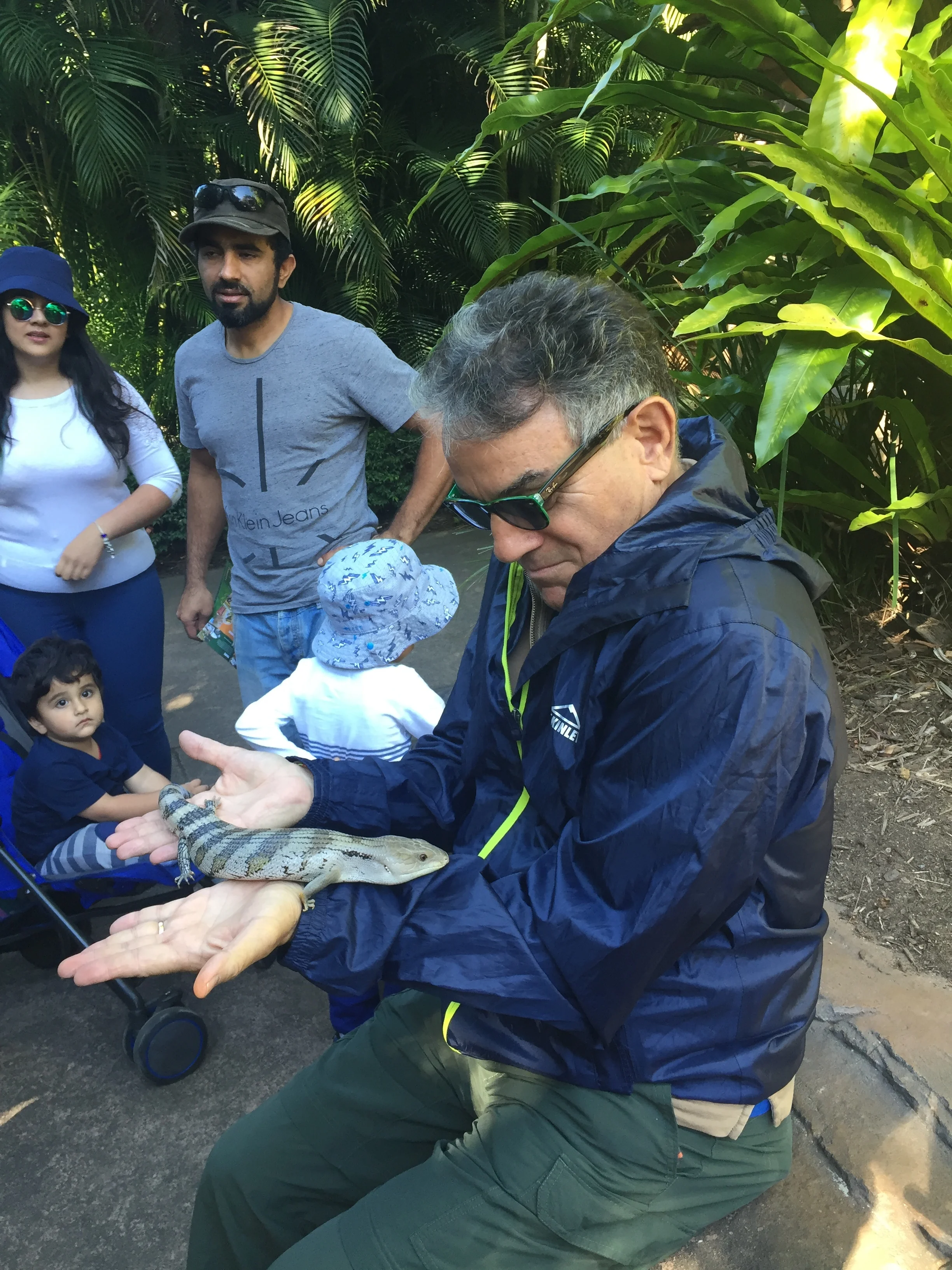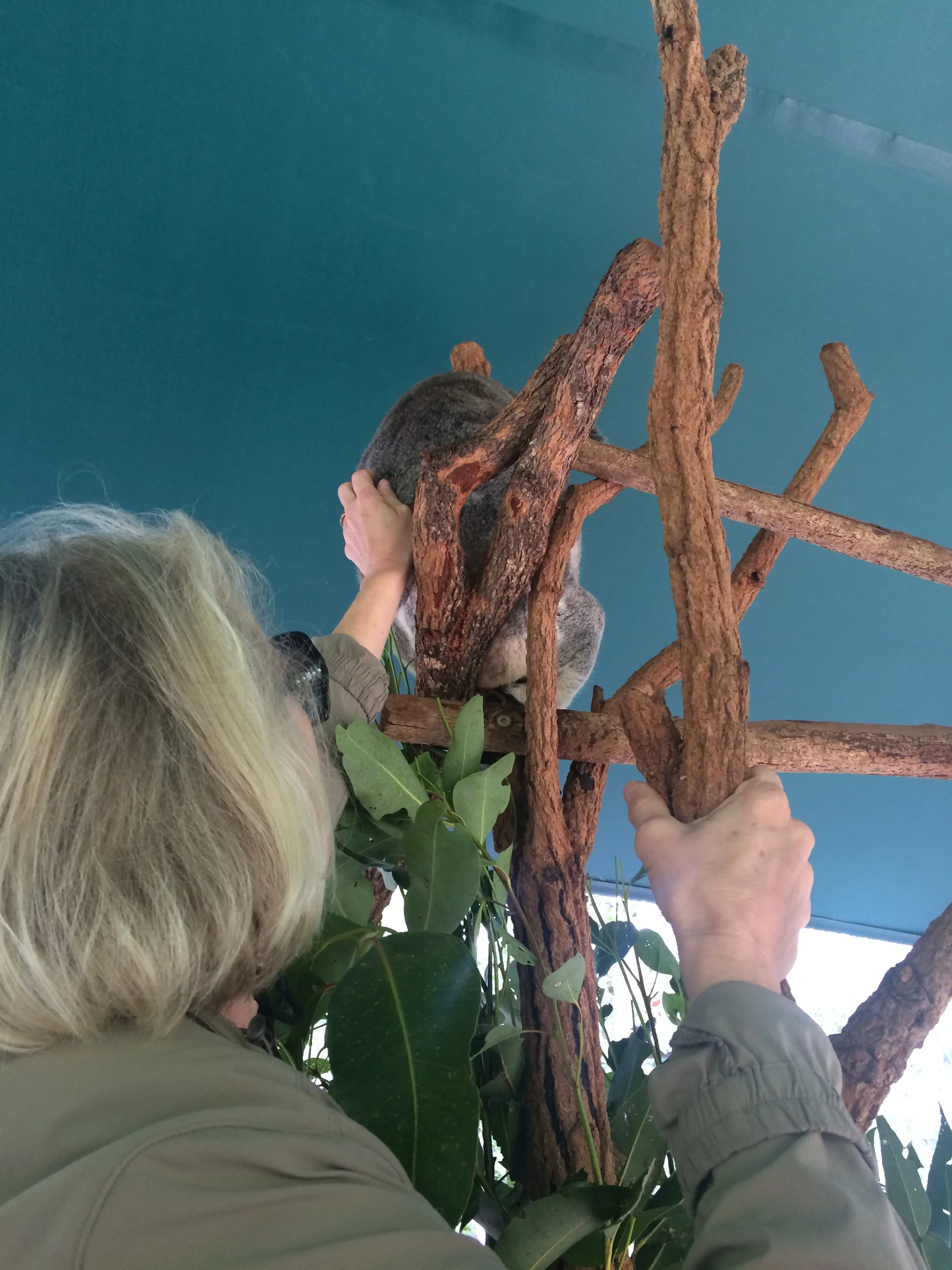 The Australian Zoo gives wonderful access to Koalas; you can hold these soft little creatures as well as pet them; Koala work time is limited to ½ hour on and 5-6 hours off. They are allowed to climb up their favorite trees right into the cafeteria area or overhang the walkways in Koala Retreat. The Zoo also allows unfettered access to Kangaroos; pet them right and they flip to their sides or back for tummy rubs. Roos fur is surprisingly soft. See our pics below of all of us with animals, FYI, Frank's was not soft and fluffy!