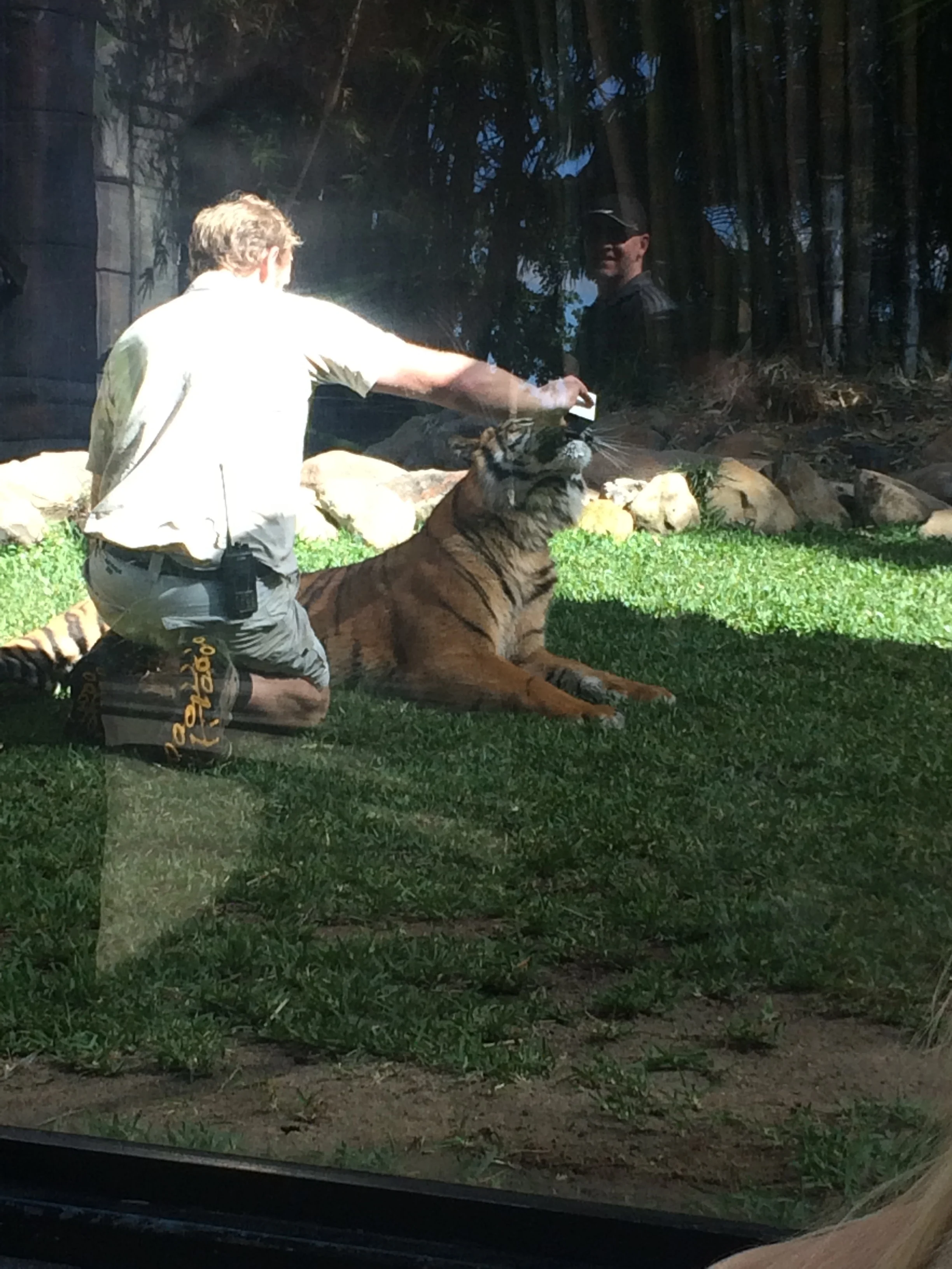 Finally, we were treated to the playful feeding of a yearling tiger cub. This cub was big. The two trainers, working in unison, would drip milk over the cat’s whiskers and lips---slurp, slurp, slurp—while touching his nose and he would follow them obediently around the pen for another treat. For us, this was the most amazing wild animal interaction.