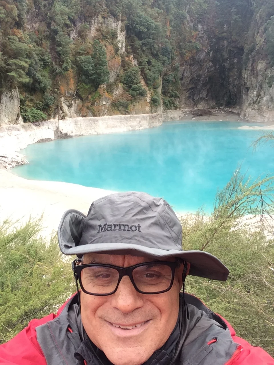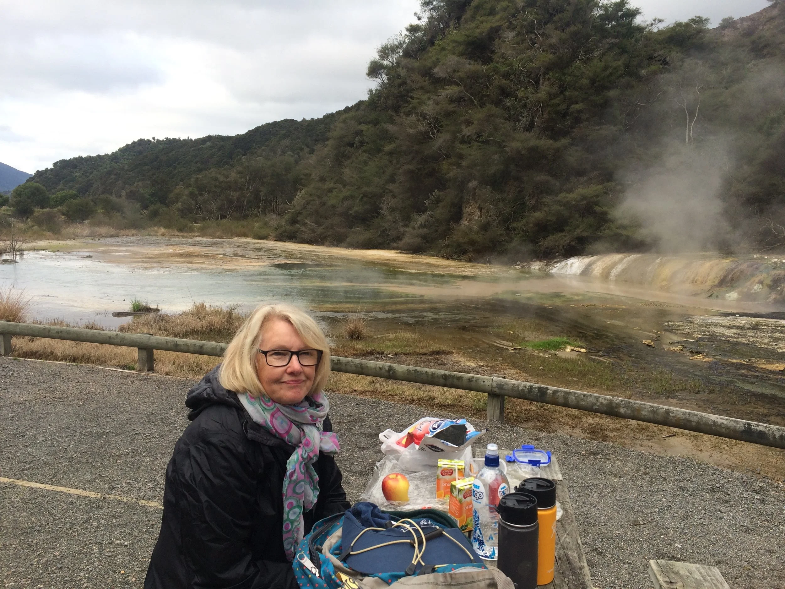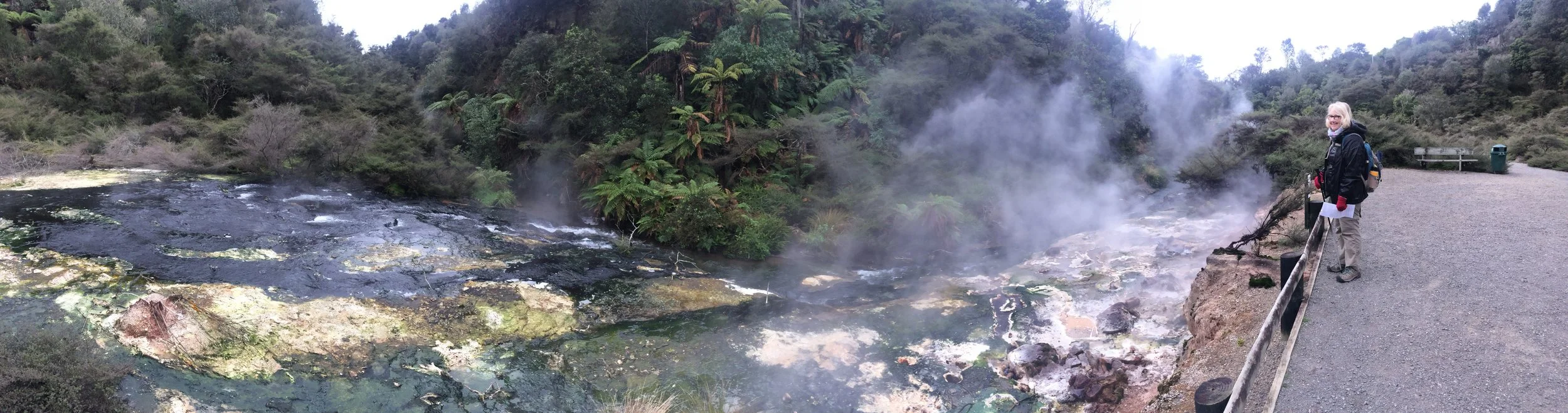 Our second excursion the next day was to trek the “Waimamgu” geothermal formations. This is billed as the “youngest geothermal area in the world”. Don't know if that is true, but the volcanic activity last transpired in 1904. And the sulphuric water and hot ponds are very active. It was a great trek through the cathedral and valley with great scenery. Surprisingly, black swans were feeding in the stream near to the sulfur water—kind of like a drip drip drip of hot water into the Walmangu stream that runs to Lake Rotomakarira. Note the Maori names used everywhere in NZ. See our trek photos and lunch at the hot springs below