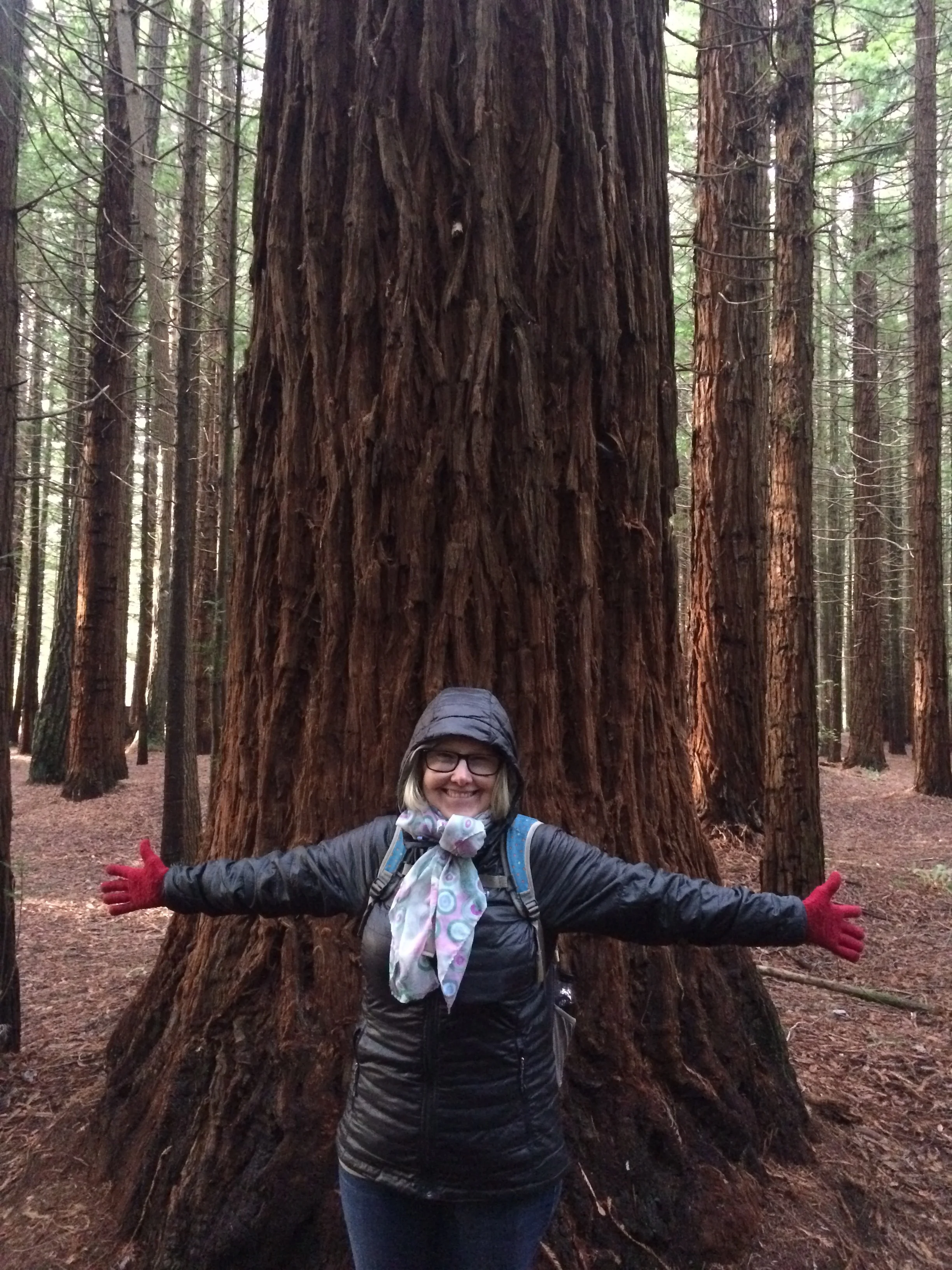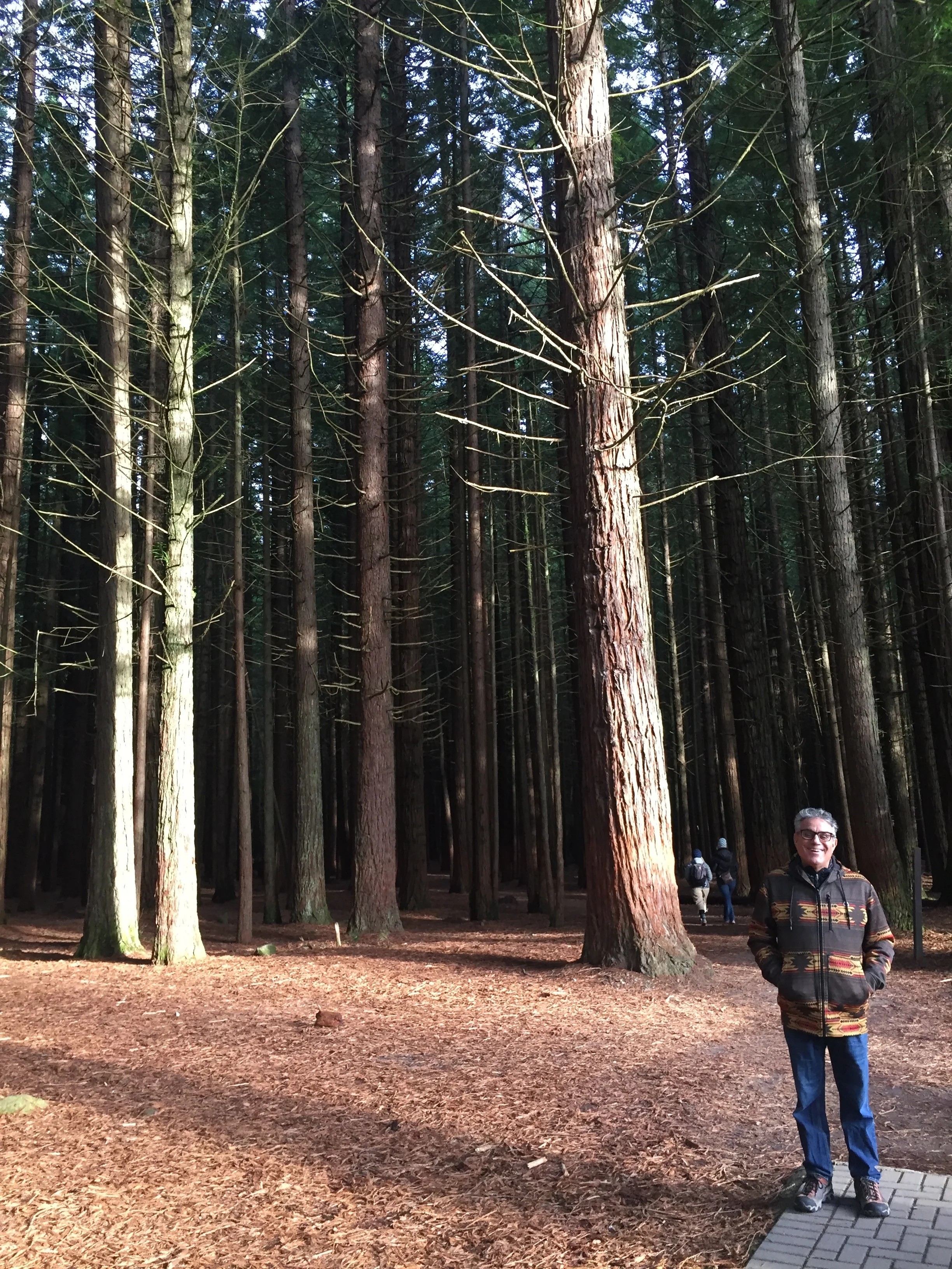 On our second full day in NZ we rented a small compact to drive around this country; first the Northern Island from Auckland to Wellington, then ferry across the sound to Picton and drive around the South Island to Christchurch. This is the first we have driven since back at Chiloe Island, Chile. Here, they drive on the left side so the steering wheel and shifter are on the reversed side. At first you have to pay close attention to their well marked signs and think about the turns, but after awhile you can be calm; noting that this country has a relatively small population and many miles of empty roads. Our first road trip was from Auckland to Rotorua. It was a five hour drive. We stayed in town at the Rock Solid Backpacker Hostel, another good one. As soon as we arrived we went to the Redwoods Forest, what a great place and hike, see our photos below. We decided to stay an extra day to drive to some out of town sites.