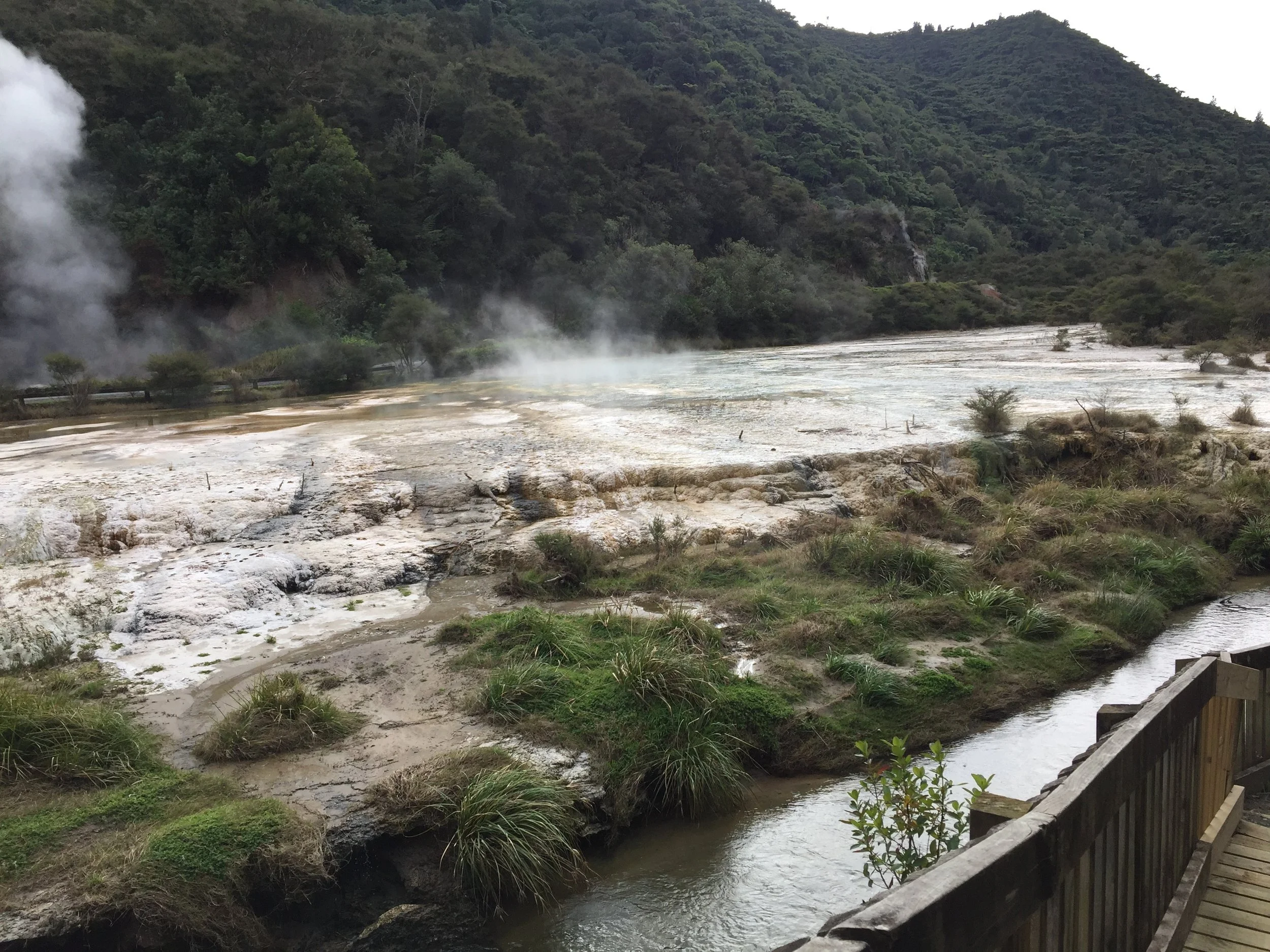 Then we went to the “Aratiatia Rapids”and walked to the high viewing stations. These rapids were once natural, but now the course of the river is dammed for hydro-electric energy. However, lucky for us, the dam is opened three times per day which allows a great onslaught of water to pour into the ravine pools and create the moving rapids and smaller water falls. Watching the dam function was an unusual experience; an interesting interplay of technology and natural forces.