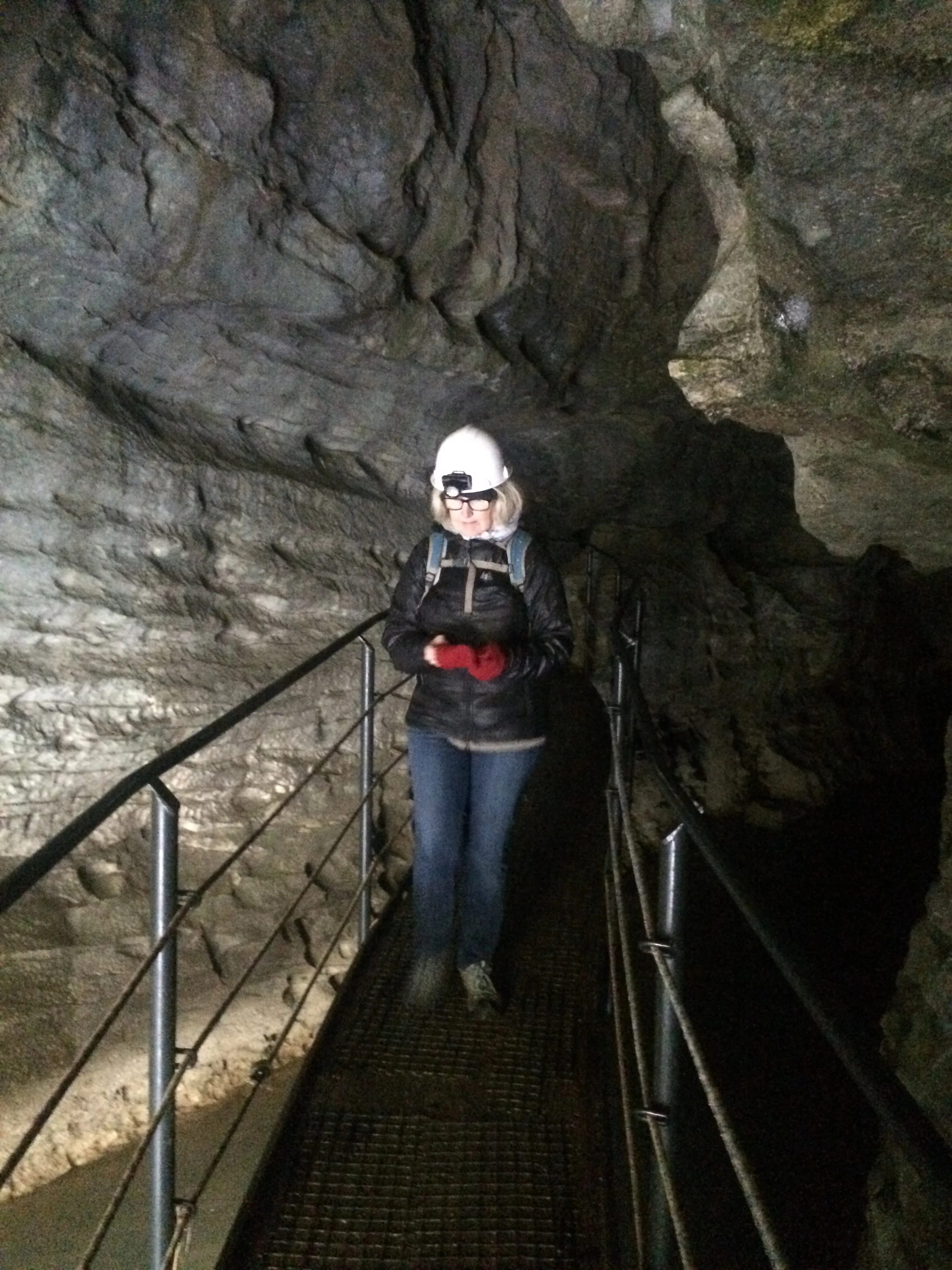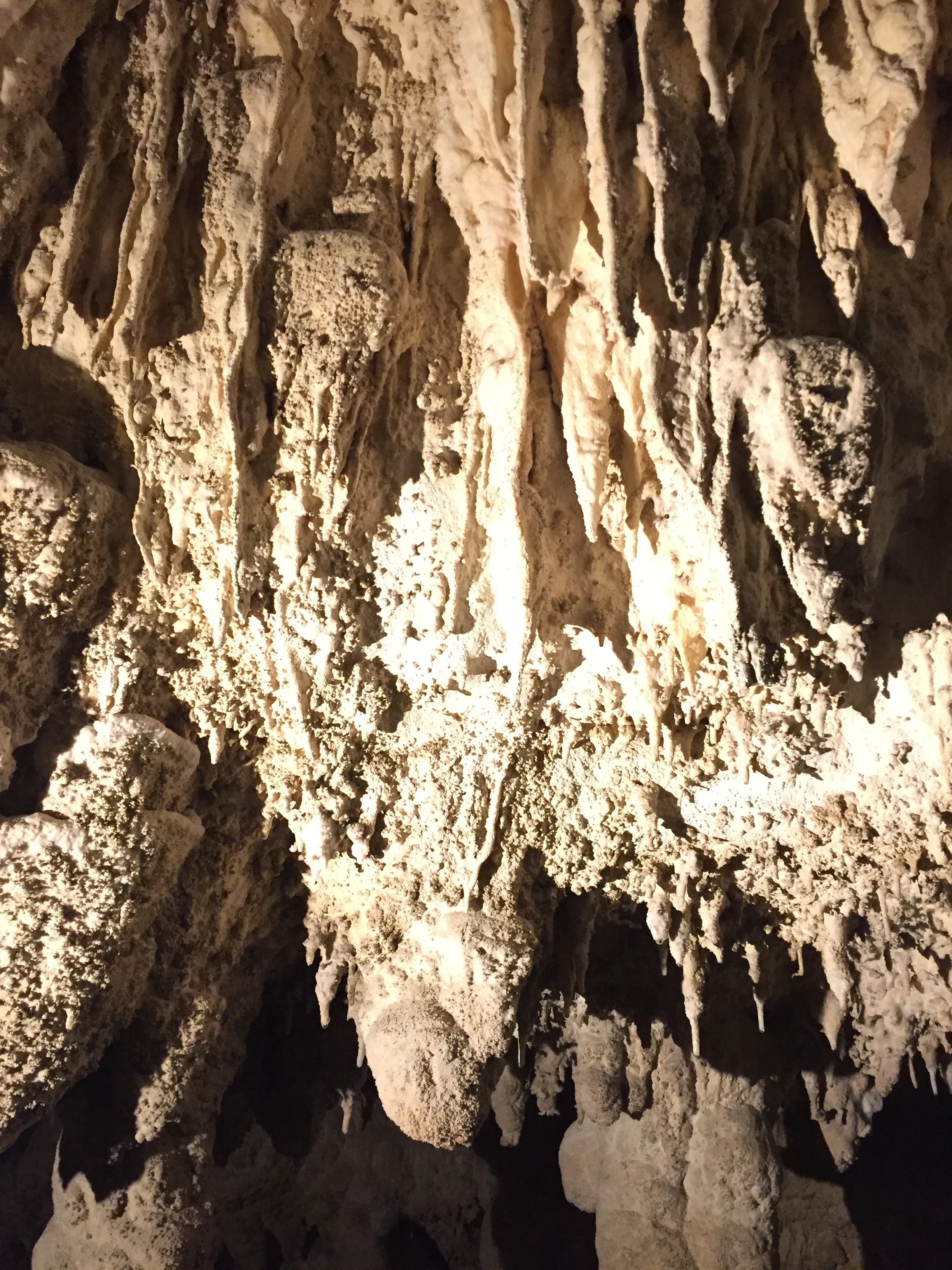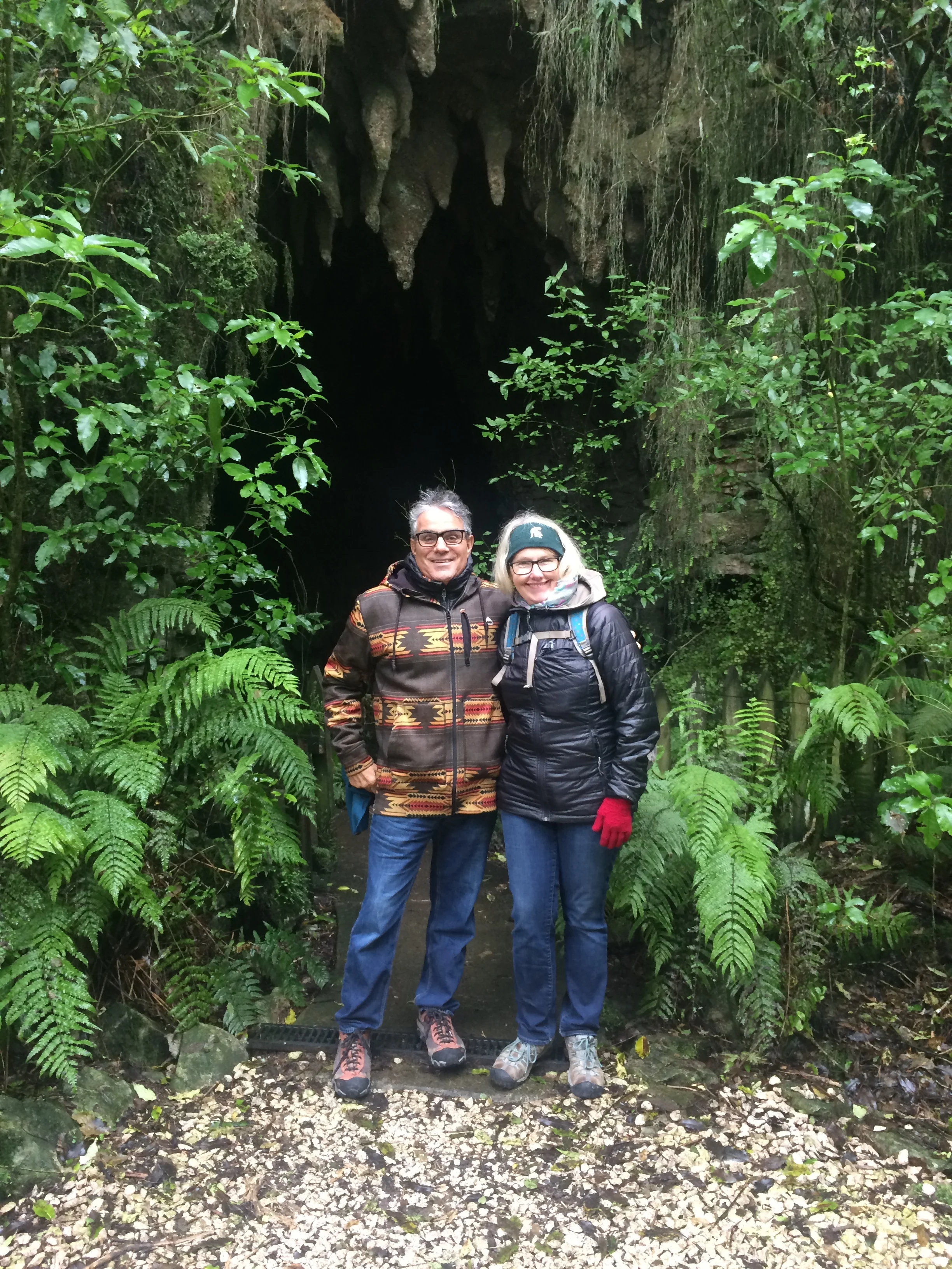 Our knowledgeable guide drove us to 2 cave sites. The first had stalactites and stalagmites . They were not straight up and down vertically, but often had curly cue shapes caused by wind flow. The Cathedral room opened into an open crevice to the surface that was about 20 feet long/wide, displaying the cave ceiling above us mere mortals. Here, water dripped and air flowed—but usually animals were blocked off by the Farmer’s fences or more likely his planted hedgerow. Seeing a hedgerow was a key indicator that a crevice or sink hole above the cave had been found. There were, however, bones of creatures—usually large birds in the cave. NZ had no mammals on the islands (except 3 kinds of Bats) until dogs and rats landed with the explorers.
