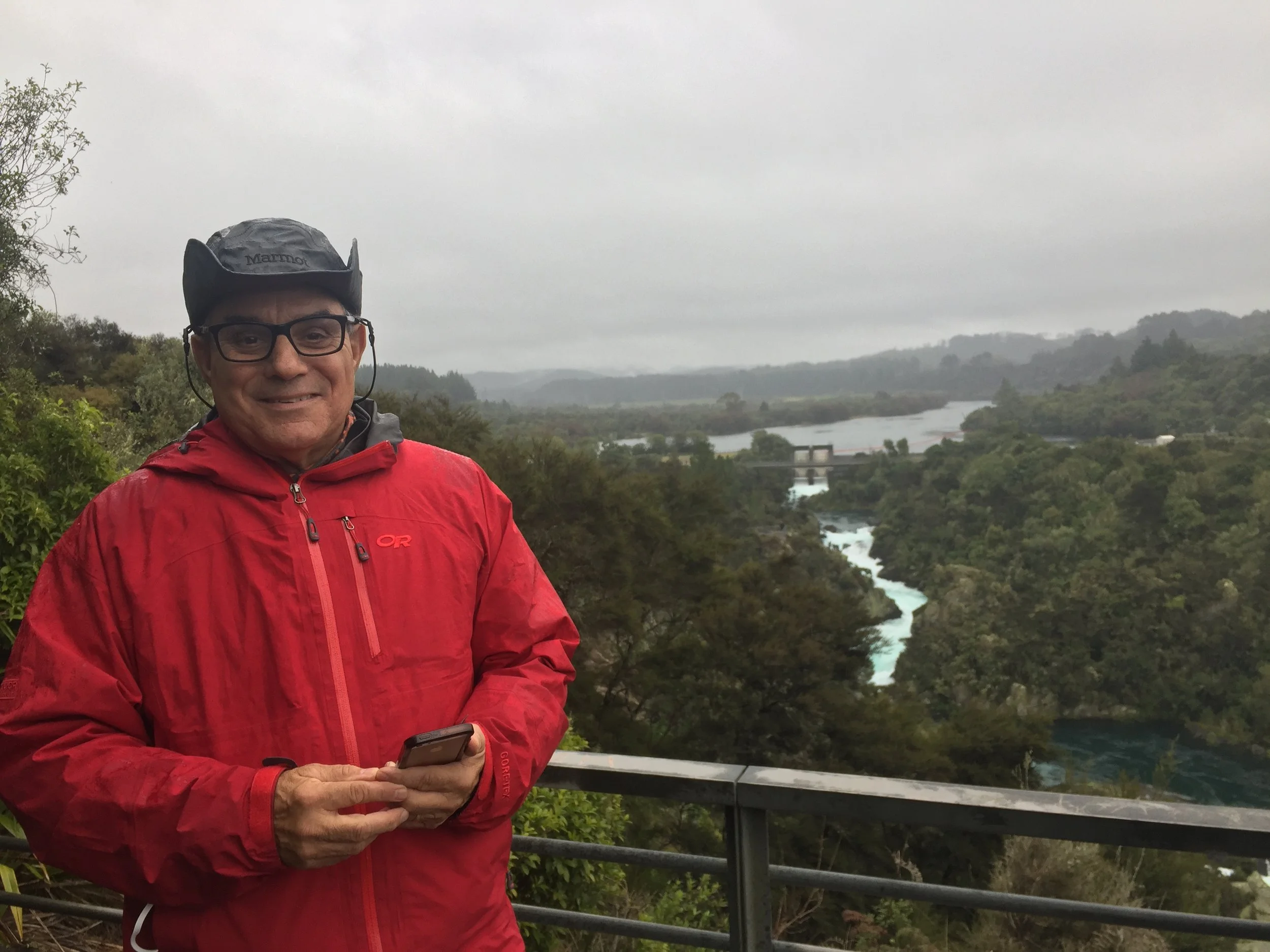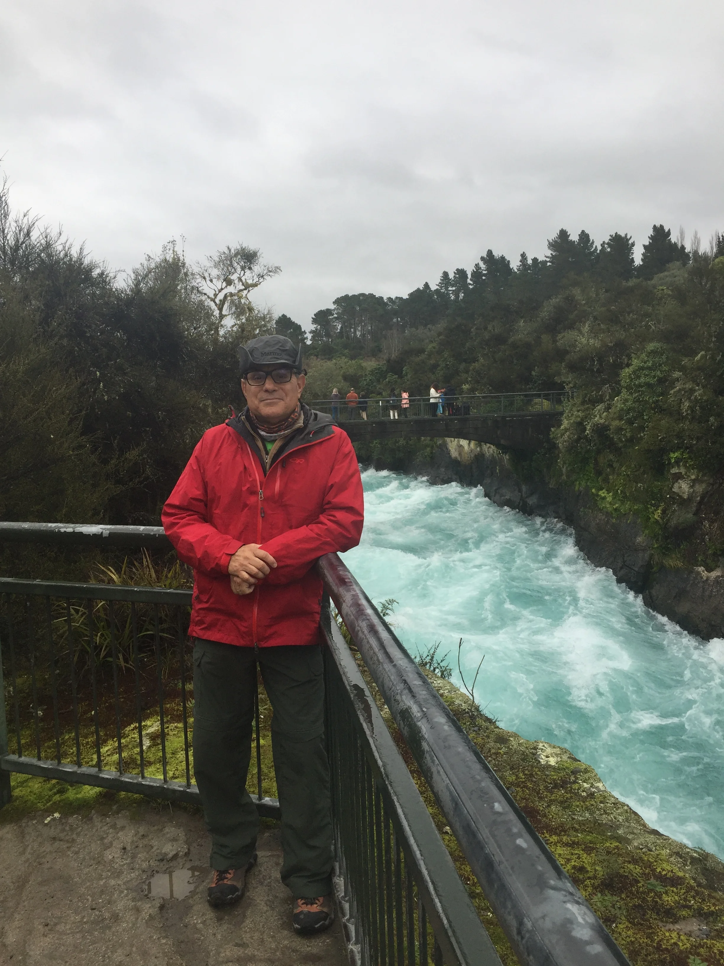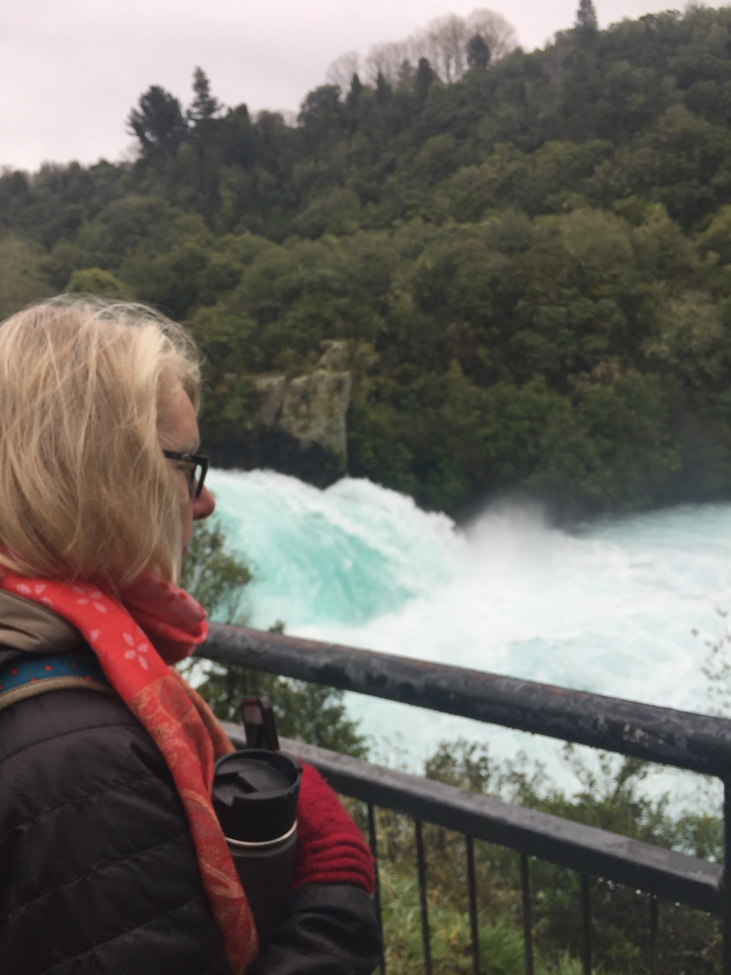 We planned three excursions in Taupo, but due to heavy rain settled on two sites. First, we trekked, or as NZ says-“tramped”, the River walk, about 3 km to the Huka Waterfall. The river has monstrously high banks covered with multi-colored green foliage. The rush of the clear turquoise water adds to the beauty. This wide river borders small geo-thermal ponds emitting steam that are open to bathers. The river current is fast and sports a competitive Kayak slalom course. The river narrows significantly and that is where the compression of the waterway makes the force of the falls so dramatic although not really high above the river.