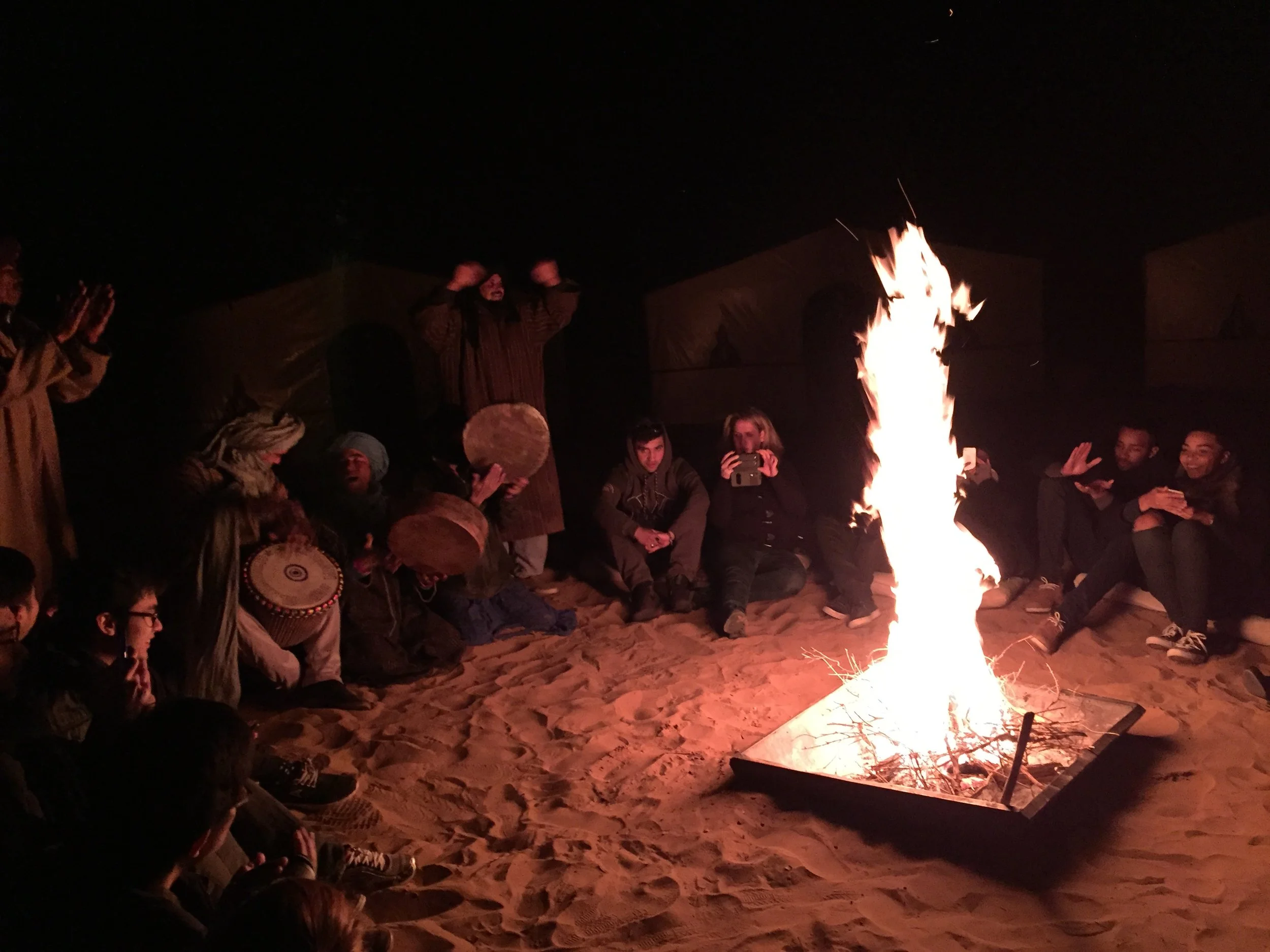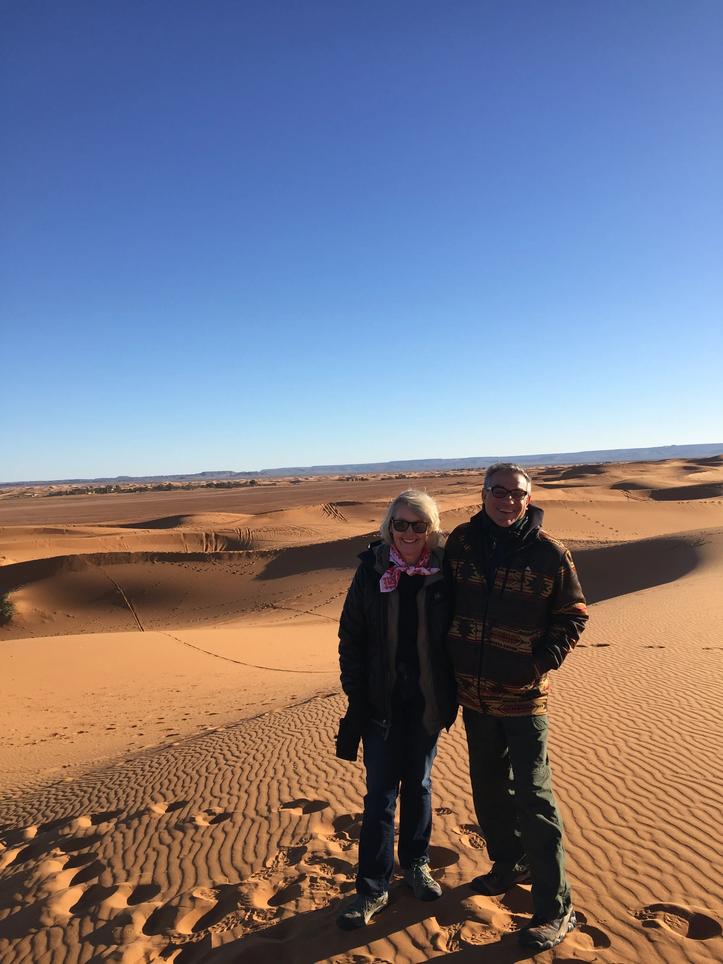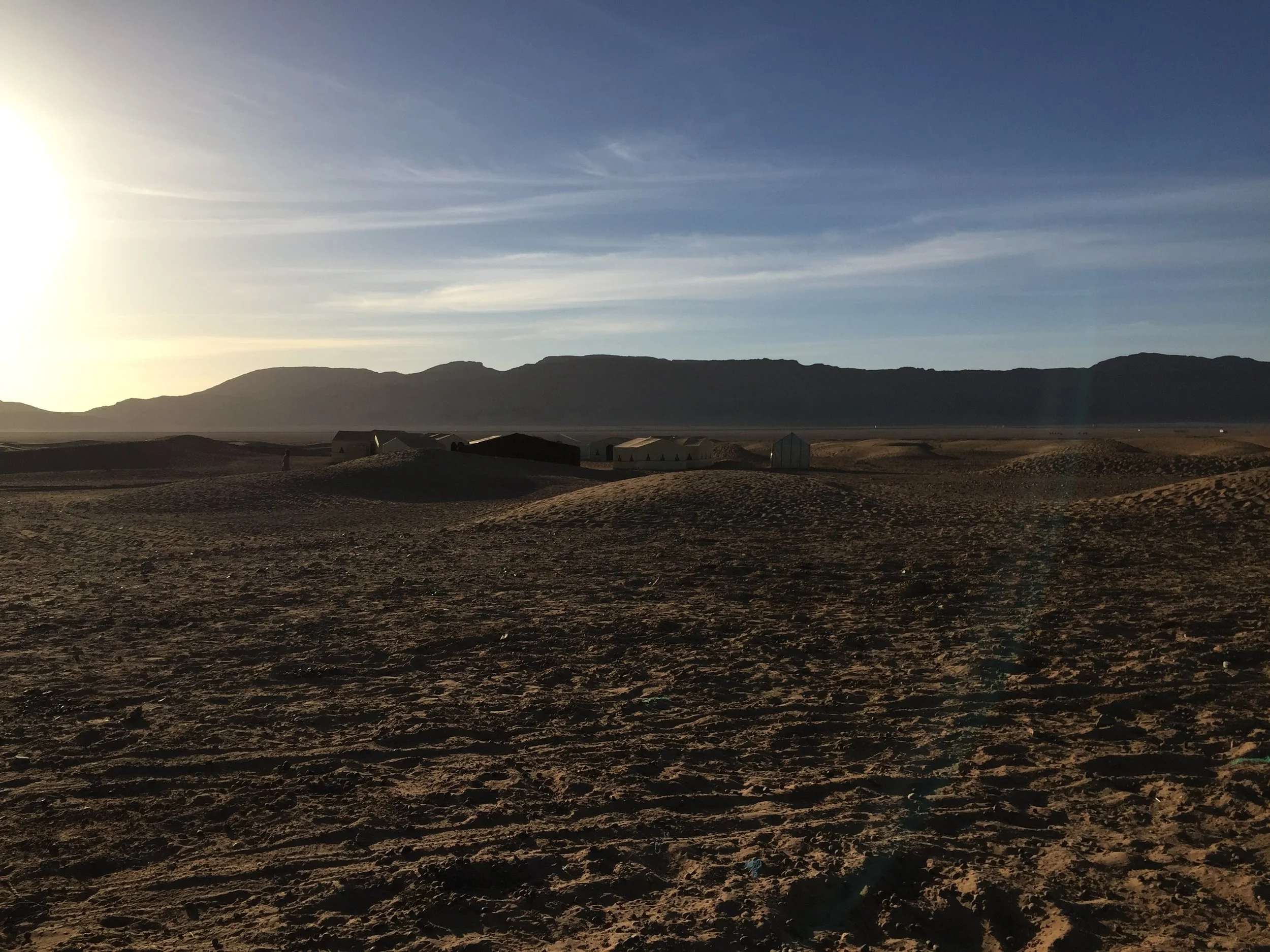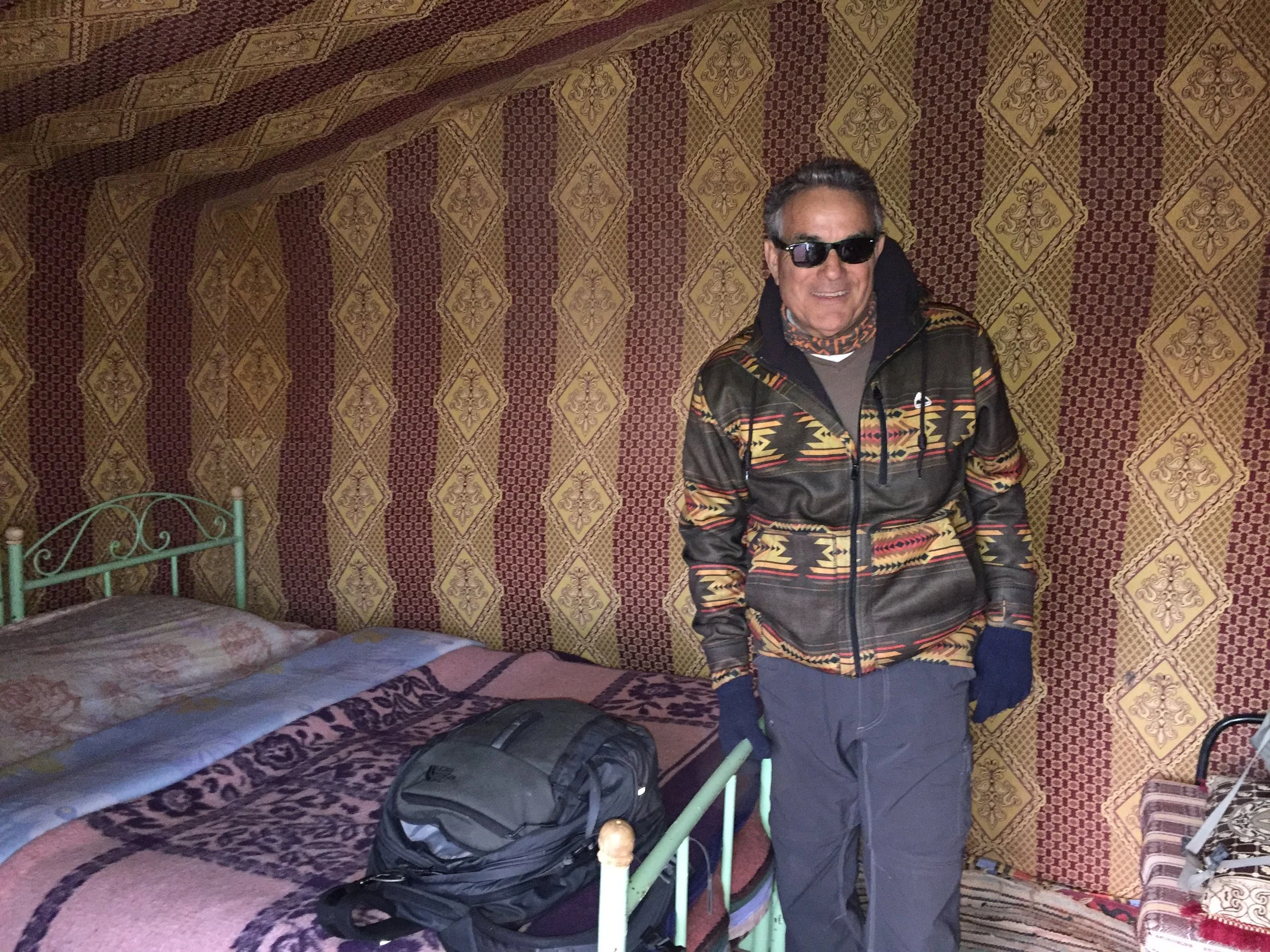 In the large food tent we had traditional Moroccan food with Mint tea. We broke out a bottle of redwine that we had carried from Portugal and shared with our table. The temperature was dropping, but we all sat around the fire pit while the local hosts played traditional instruments and allowed us to enjoy a medley of drumming beats. It was desert cold. When bedtime came we used our cheap little sleeping bags for an extra layer of warmth along with 3 heavy woolen blankets. We both wore stocking caps and prayed we would not have to make a bathroom run. No such luck. Freezing.