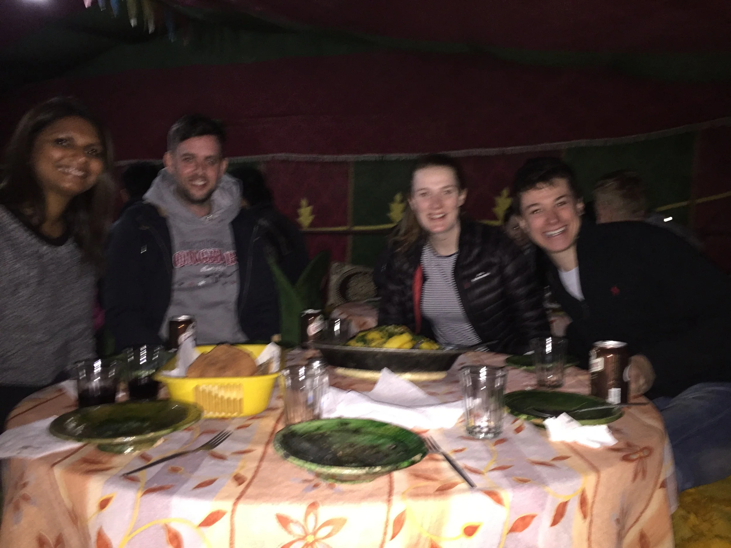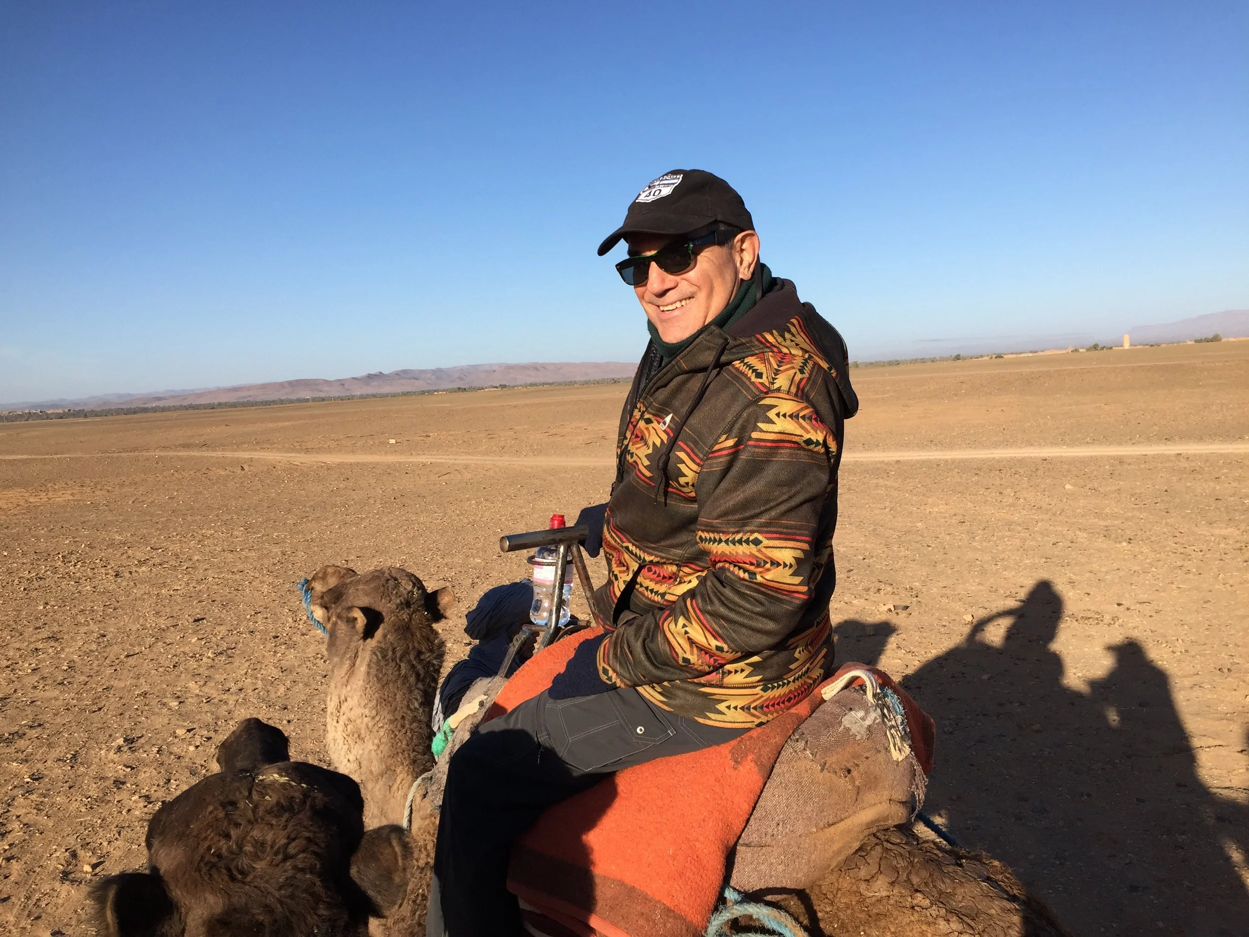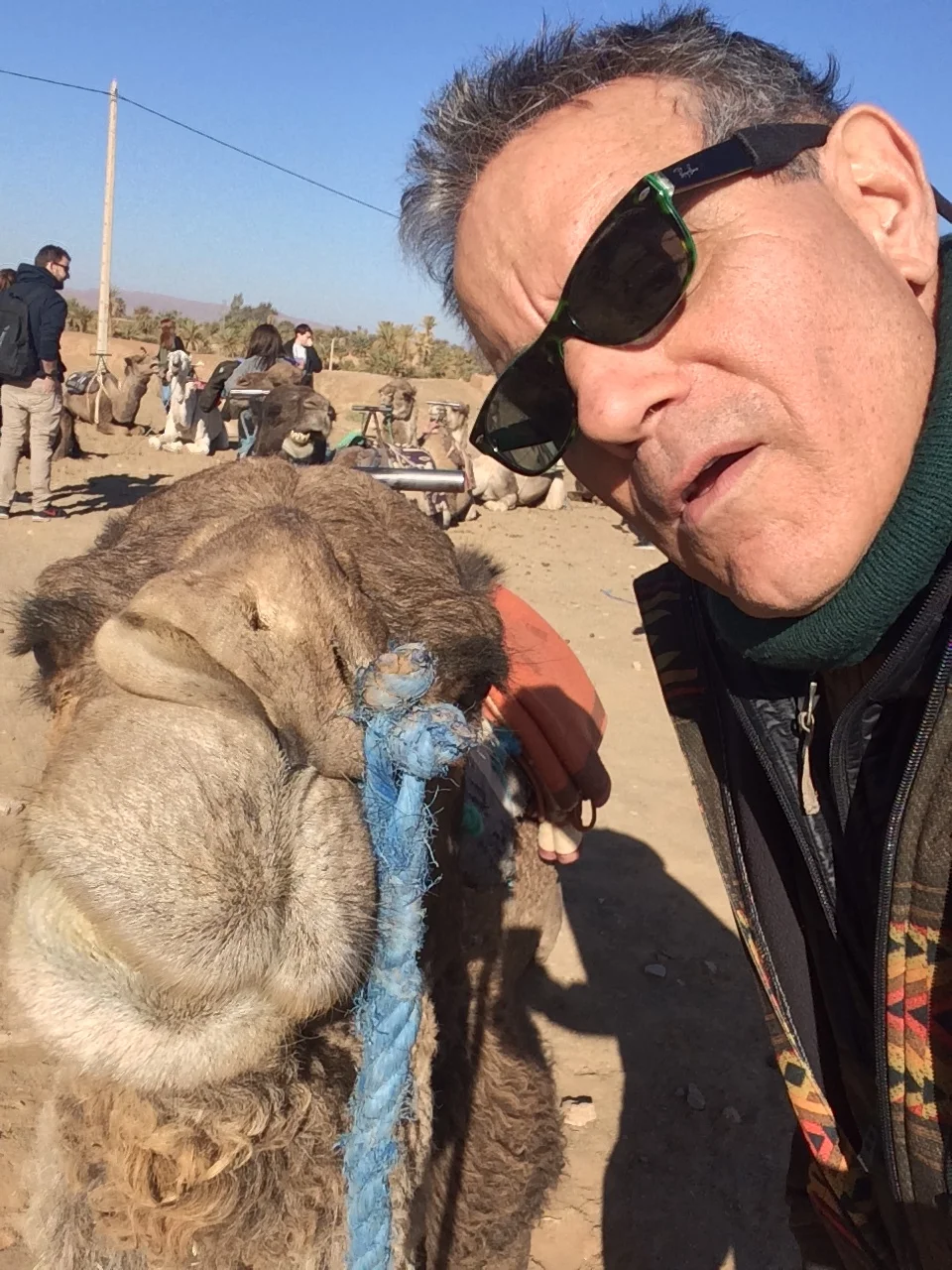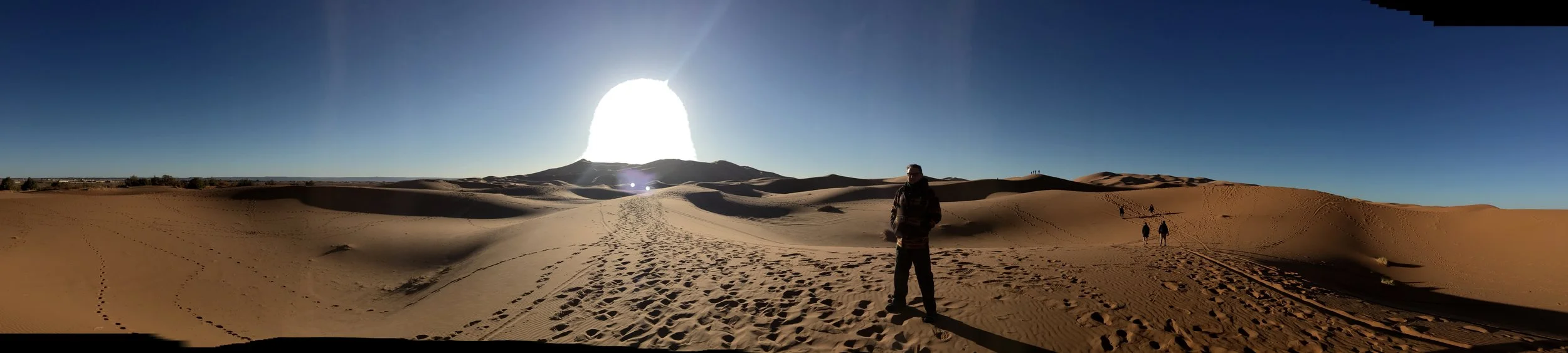 In the large food tent we had traditional Moroccan food with Mint tea. We broke out a bottle of redwine that we had carried from Portugal and shared with our table. The temperature was dropping, but we all sat around the fire pit while the local hosts played traditional instruments and allowed us to enjoy a medley of drumming beats. It was desert cold. When bedtime came we used our cheap little sleeping bags for an extra layer of warmth along with 3 heavy woolen blankets. We both wore stocking caps and prayed we would not have to make a bathroom run. No such luck. Freezing.
