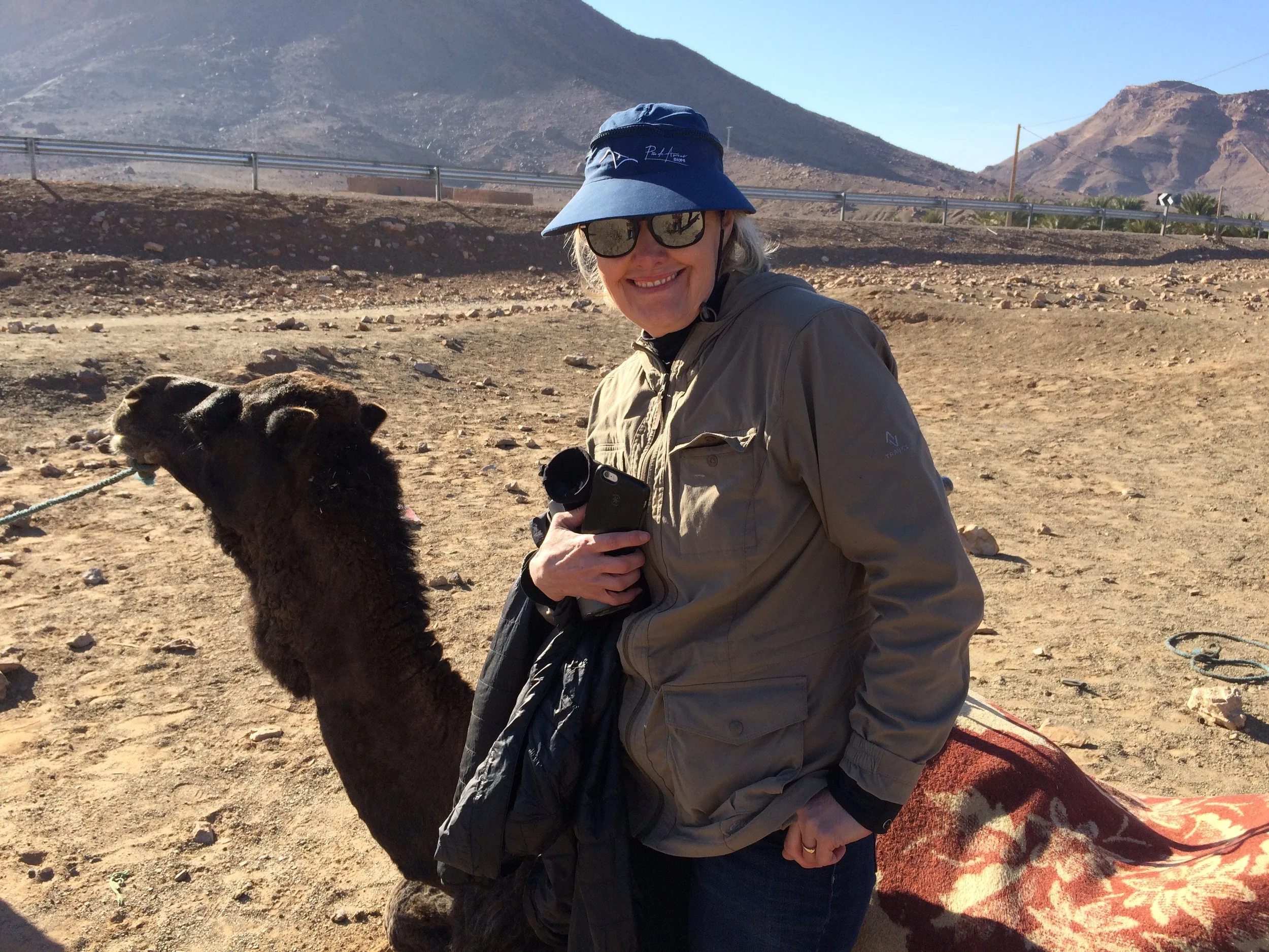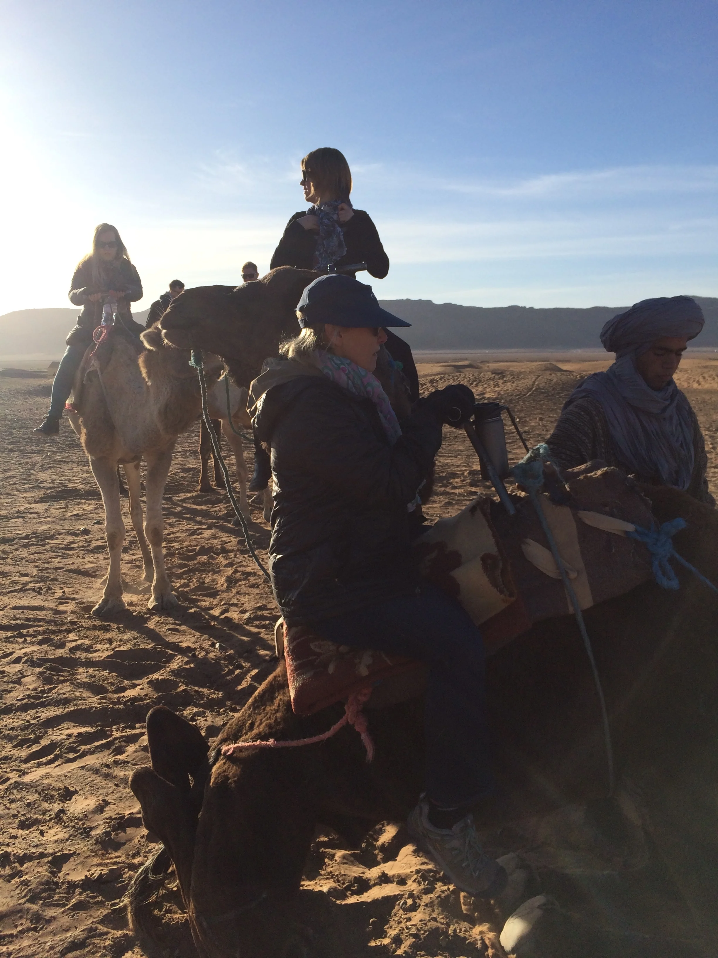 Up early for a very cold breakfast, a great sunrise and our camel ride. The camels are waiting a few yards from our tent circle. Without much instructions we are loading on them, they kneel and quickly jump up and off we go. The camels are fitted with saddles made of thick blankets with a hole for the hump. You sit behind the hump and bounce along. It can be a painful ride, especially for the guys.