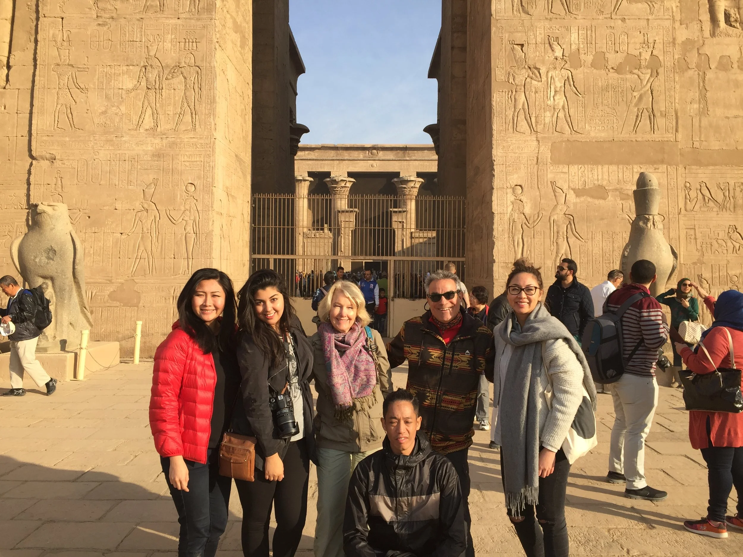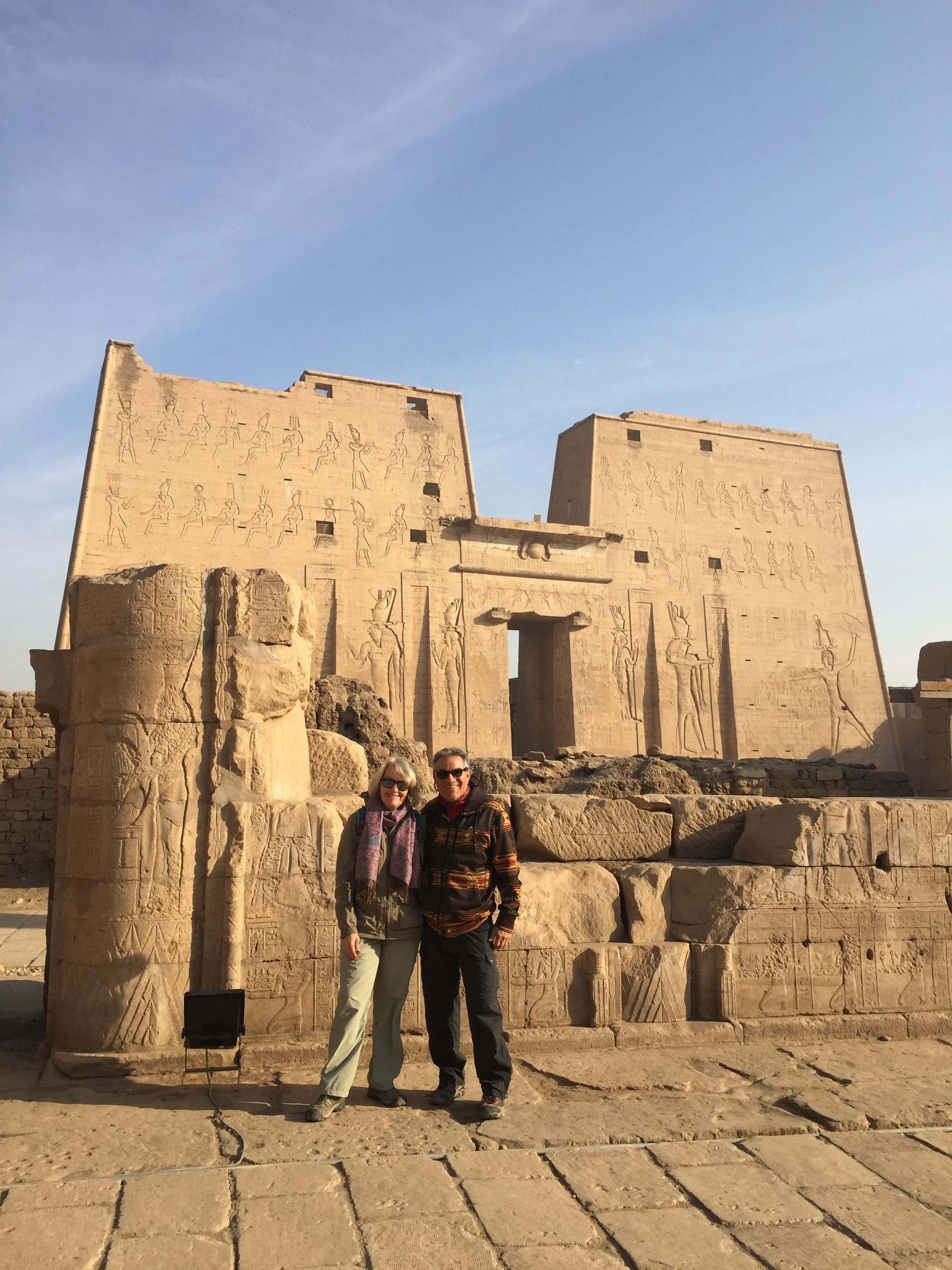Our cruise group is just 6 of us. The others crowded into an open deck sailing boat, called Felucca, to share together time. This was a rustic activity. We, on the other hand having slept in the desert for 2 nights the week before, chose the finer cuisine and service of the cruiser with sun deck, bar, sports TV, and afternoon tea time. The sun set over the Nile valley viewed from the top deck was very cool, as were our new friends who worked in London.