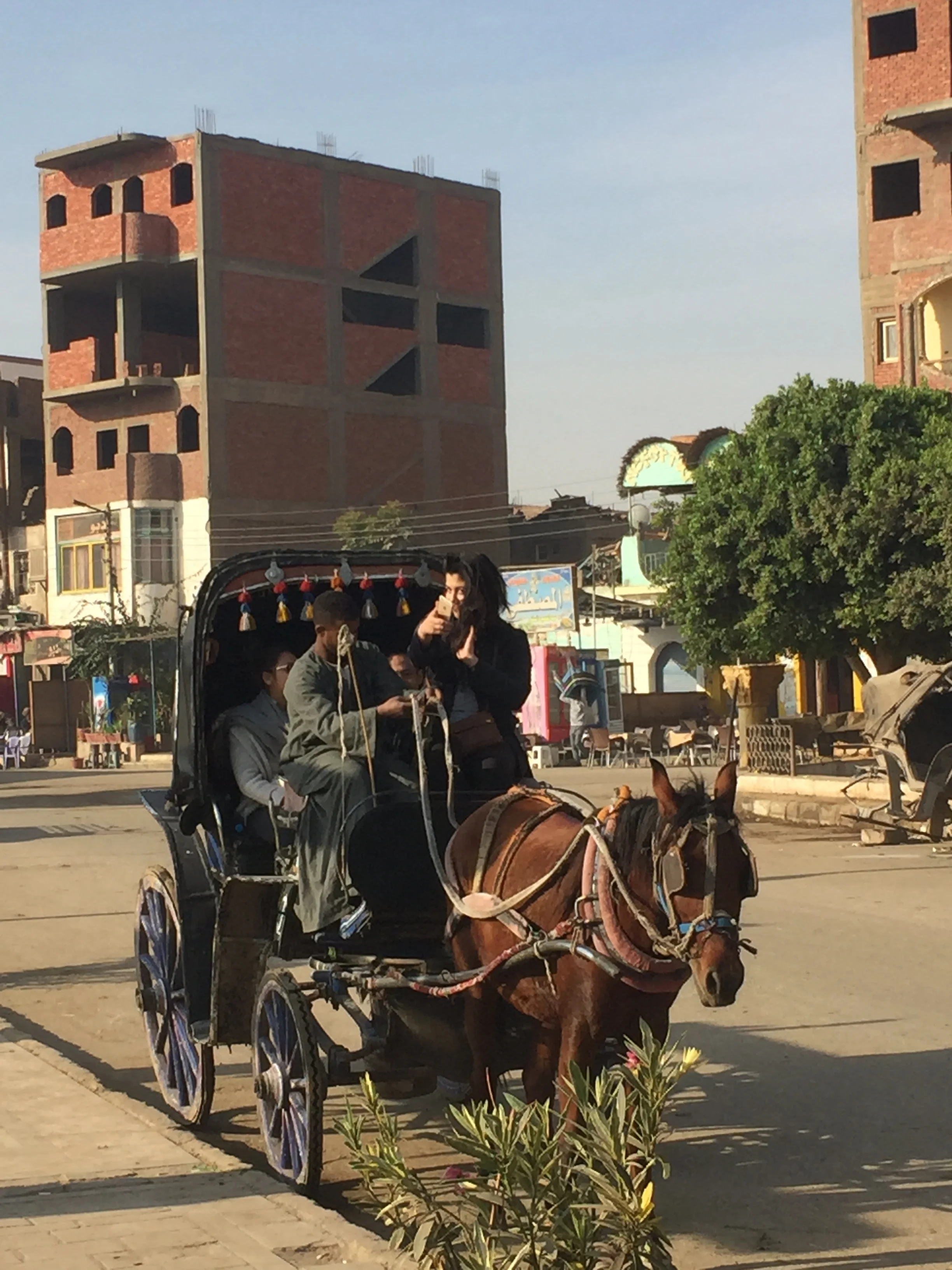 You can also visit the tomb of King Tutankhamun (Tut). We paid the extra fee to see King Tut’s tomb. He was the boy Pharaoh, having died at 19. His mummy is at this site. He was short and slender. He is famous because his rather small tomb was found intact. We were able to view King Tut’s face mask, golden chariots, the gold funeral coffins, jewelry, weapons and supplies in the Egyptian Museum. No photos allowed in the tomb or museum but the collection is amazing. Our guide asks us to imagine the wealth, and gold, and stuff that would have been saved in the gigantic Ramses II tomb, as his reign lasted until his death at 90 years of age. It was grave robbed. It is hard to imaging such wealth. After the tombs we visit one last site, have a great lunch and then back on the bus again for a 9-hour drive to Cairo.