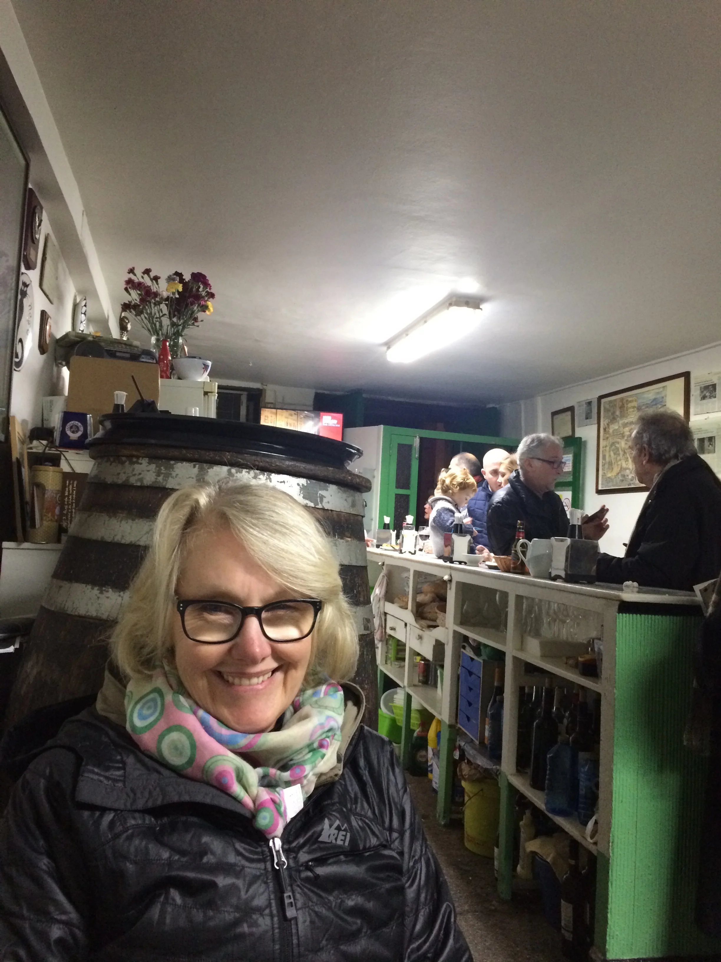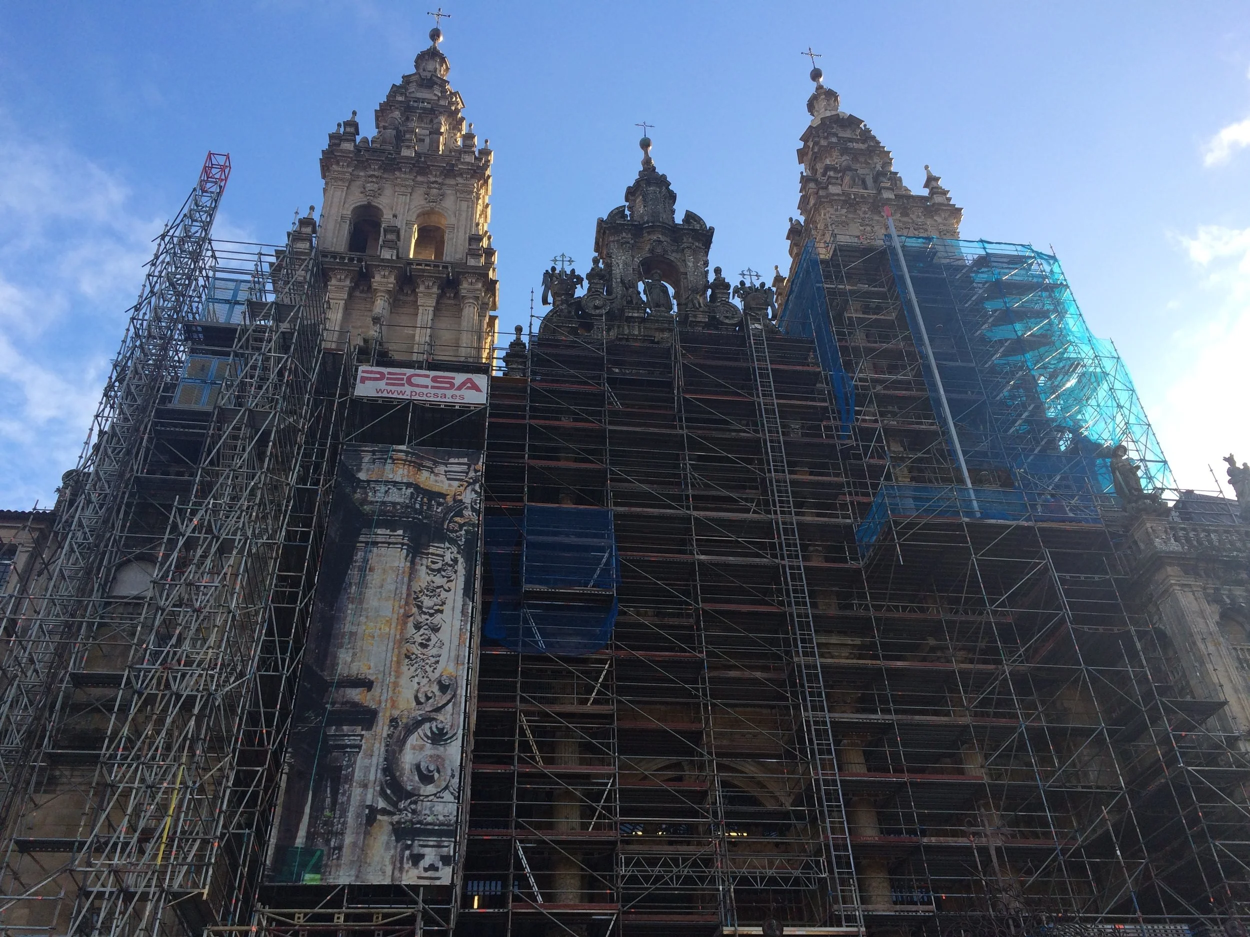 We took a Uber car to the Airport to catch a bus. Don't laugh! After searching on line for a variety of transit plans, including train and bus or bus only, we found this bus line “InterNorte” that had pick up at the airport. We assumed the an actual big bus station would be by the airport. But no, the pickup was merely a stop at the arrival level of the airport. After we questioned the Information center and any one else that was standing near, we were satisfied that this spot and this sign meant we stand here for the bus. It all worked out and 6 hours later we arrived in Santiago de Compostela. Our cute little hotel room has windows that overlook the giant back lite Cathedral of St. James that has all this fame. We will see it tomorrow. For now we are looking to find this Tapas restaurant named Black Cat, aka D’Gato Negro in the traditional streets of the city. Interestingly, these streets have pedestrian walkways under medieval arches which support additional living area, and keep the rain off.