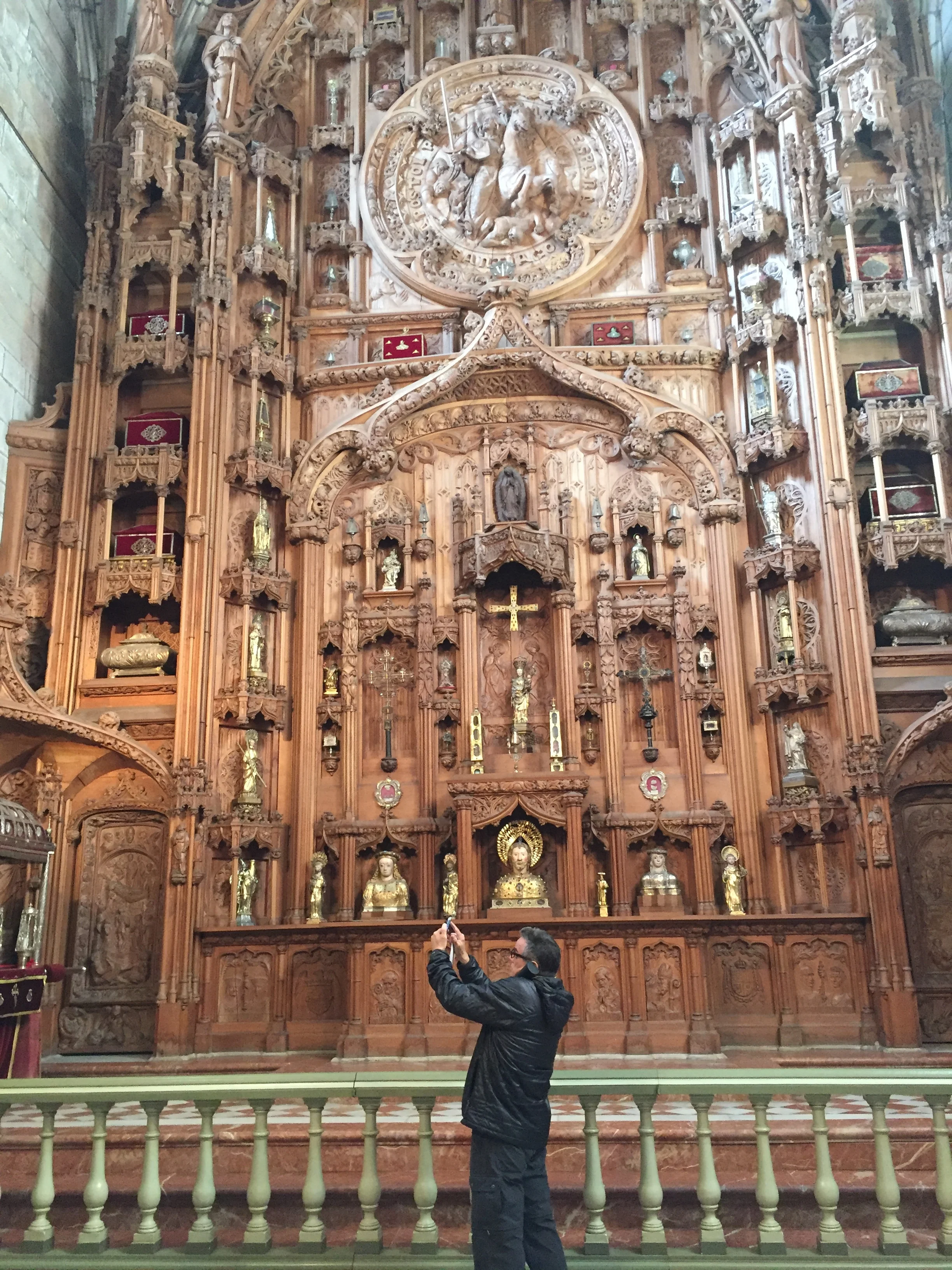 We next entered the Cathedral with its gold and silver alter, displaying a life sized replica of St. James sitting among carved Angels. In this alter, you can walk behind the replica of St. James and hug him, as so many thousands of pilgrims have done. Under the alter, are kept the consecrated bones of St. James in a silver crypt, which of course was the historic impetus and draw to create this holy place.