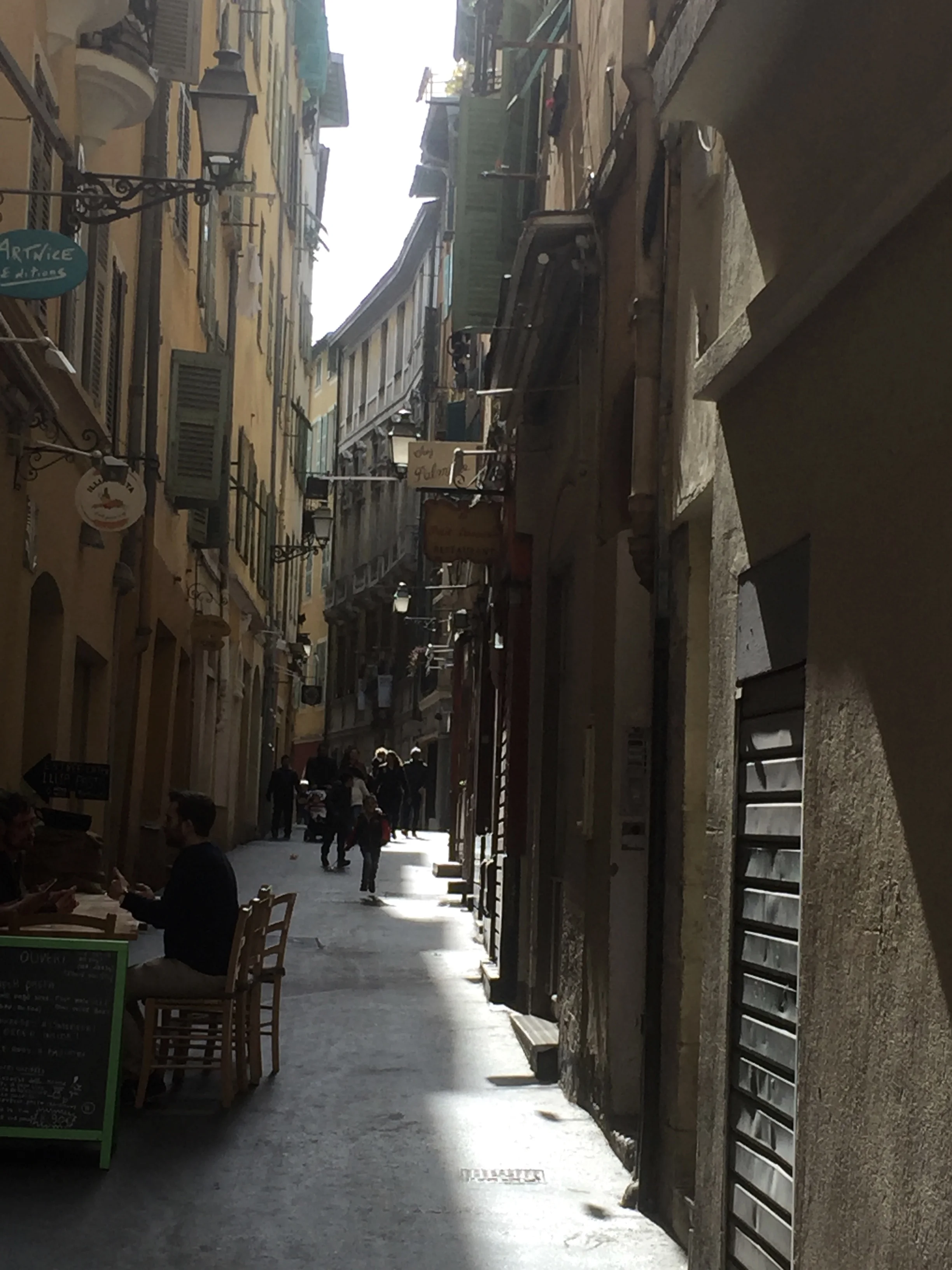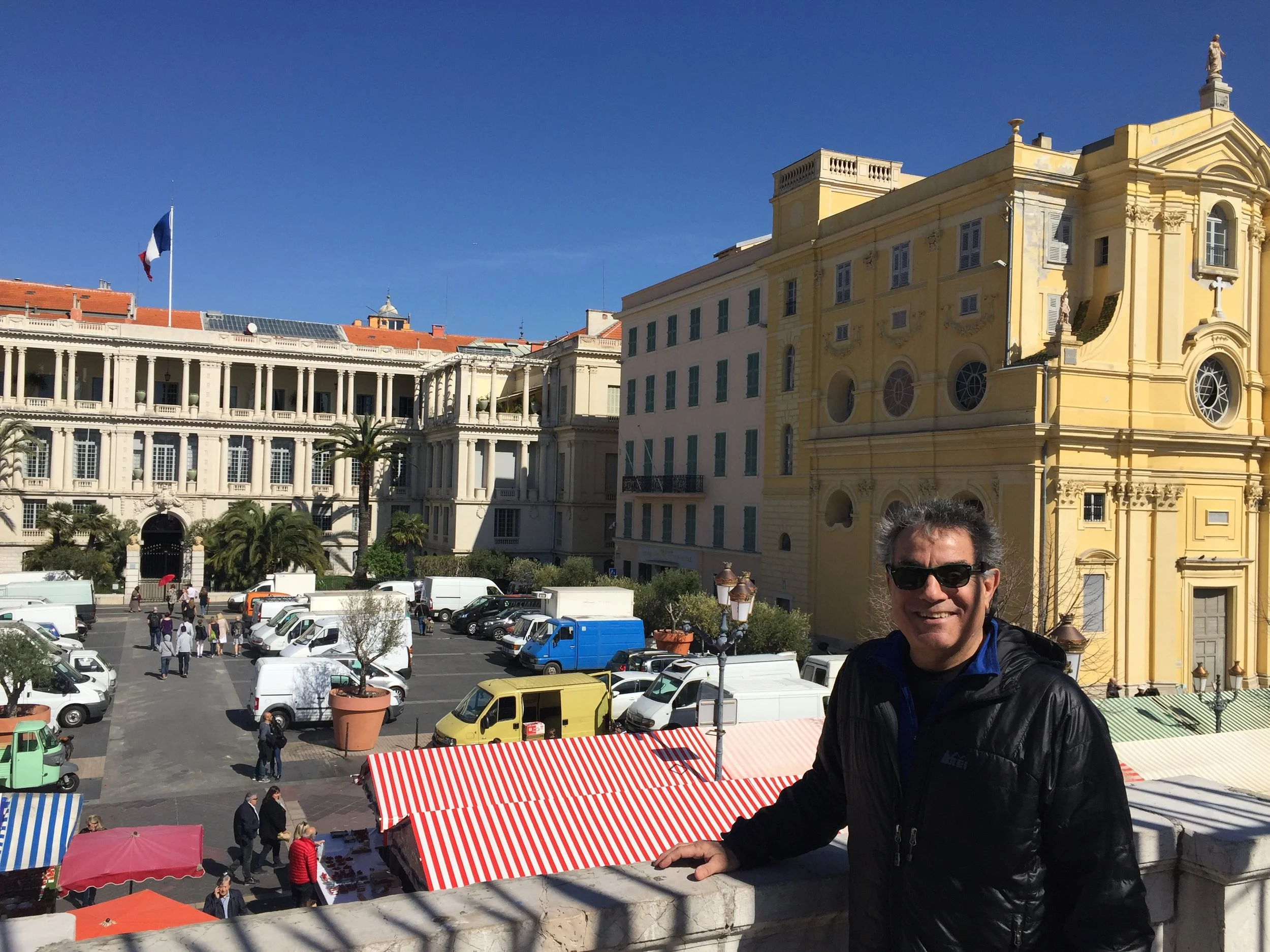 Our destination is Nice. After freezing in Turkey, Germany and parts of France we have sun and it is warm! We love this place. Our Airbnb is in old town on a narrow hilly street called Rue Droite. This is a second floor flat in a 5 story building with those traditional windows that have shutters. When we exit on to the narrow cobblestone street, there are pasta shops, bakeries, and restaurants nearby. We are only 2 blocks from the central plaza that has been built over a river that runs through the town. Today in the plaza was the Paris/Nice bicycle races meeting point and retailer/equipment area. As we waited for the our customary walking tour to begin, a procession of multiple buses with cycle team members and trailered team colored bikes passed by. It was tremendously colorful and excitement was in the air. The races had several starting and ending points throughout southern France.