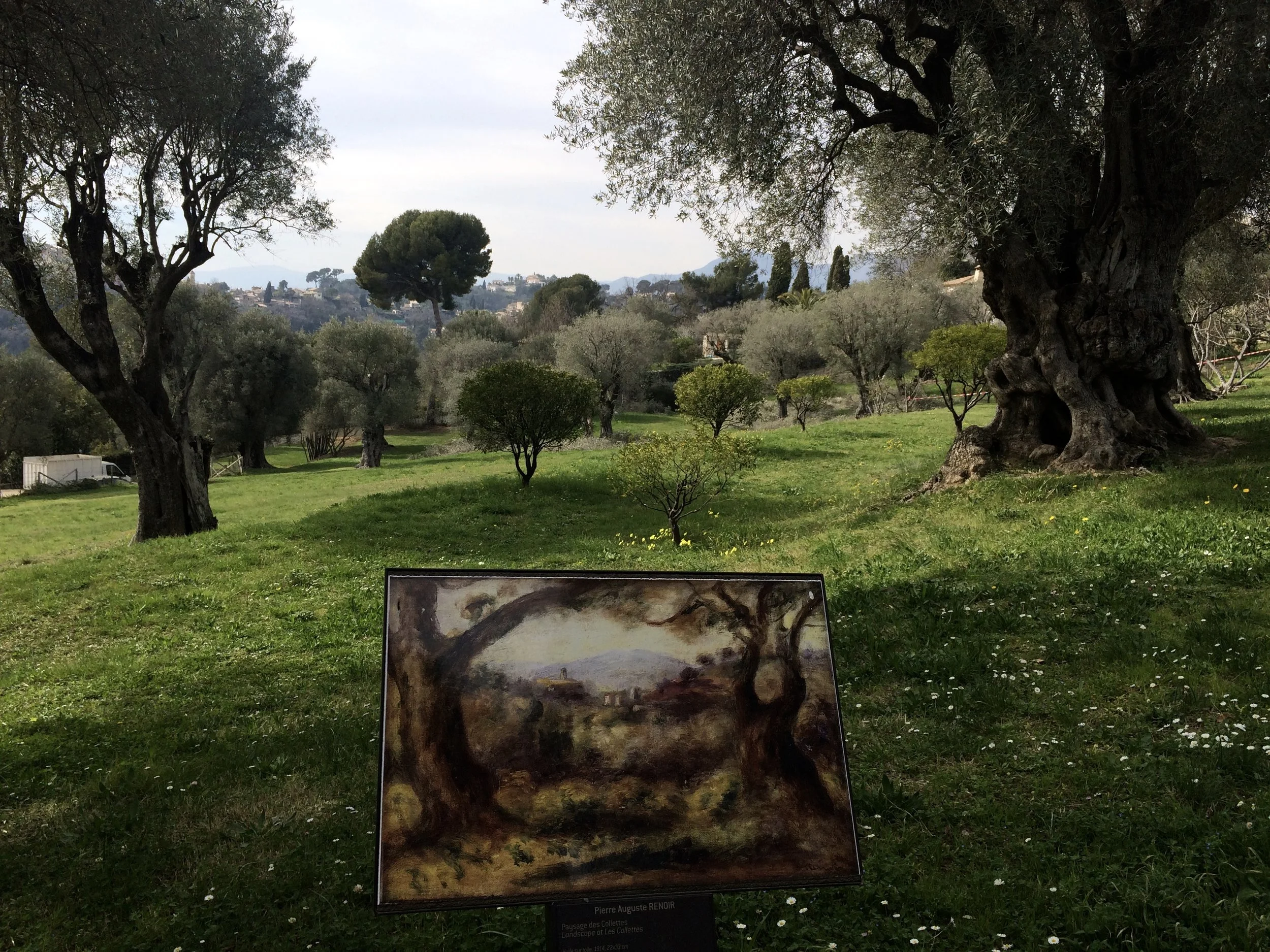 On day 5 we take another day trip. We decided to move west this time for a short jaunt to another shore side town, Cagnes Sur Mer. Another bus, another $1.50. As well as the view of the countryside, we went to see two specific sites. First, we enjoyed the Pierre Renoir homesite and museum. There were duplicate paintings set up outside at the point the artist sat when painting. The before and after of the location was still very similar.