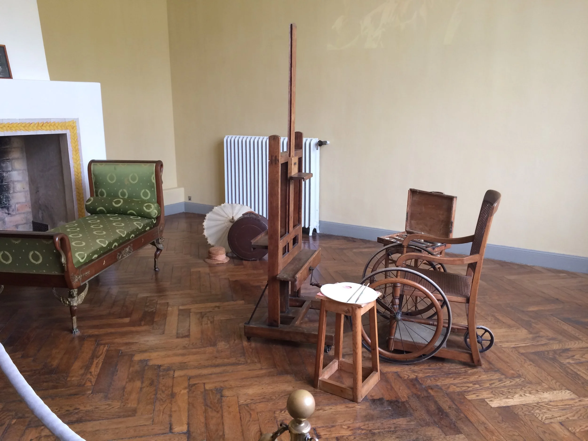 Renoir was born in 1841 and died 1919. He was an “impressionist” in part, but used many styles over his career. He looks like an “artist”. Photos of some of his paintings are provided. Most interesting was how he extended his career even with the infliction of severe arthritis in his hands and legs. The hands where wrapped and his brushes secured so he could continue. He also painted from a wheelchair in later life and his studio was presented with easel and wheelchair. The overall experience was enjoyable. Then we walked to town center and picked up the free shuttle to The Haut-De-Cagnes Castle located at the top of the steep hill that overlooks the town. This was first a a small fortress that was updated to a Chateau overtime with painted ceilings and wall tapestry, and an art museum of modern art. The castle also includes the old sub level mill for pressing olive oil. A small ancient neighborhood surrounds the castle, which we could see from the top rooftop turret of the castle. The long distance view of the Mediterranean Sea was also great. Check out some photos.