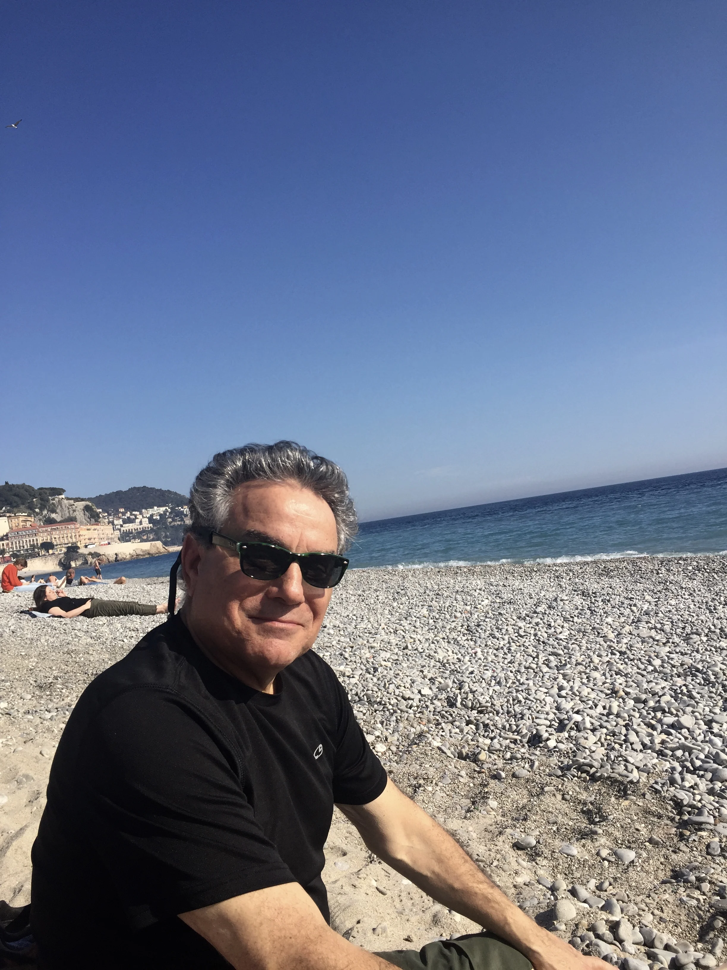 We jumped on the local bus and made it back to out flat by noon. We know this because the city fires a cannon shot at noon everyday. We grabbed some towels and a backpack of snacks and headed down to the waterfront to sun on the beach. After shucking off our shoes and socks and rolling up our pant legs we absorbed the sun rays and sea breeze. It is said that in high season every square foot of the beach is filled with blankets and people. We had a lot more room to stretch out and watched the limited activity on the beach and seashore. Nice really is a great town and the sea and weather add to the charm.