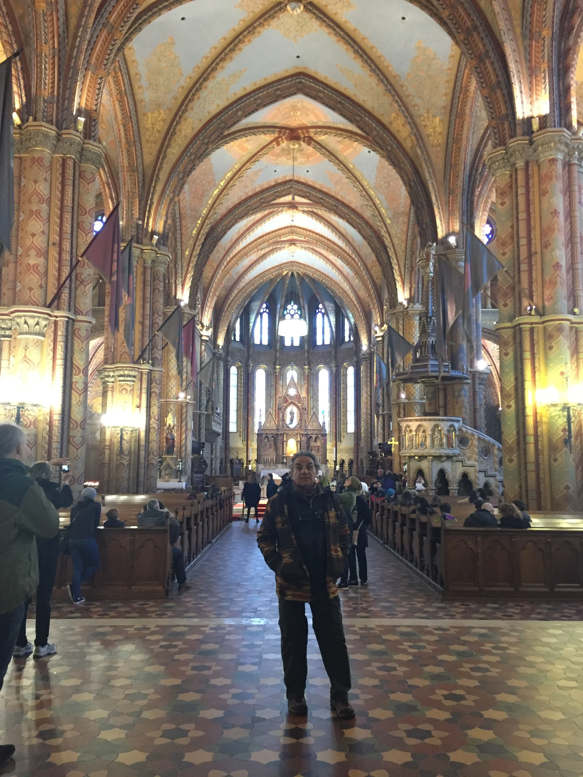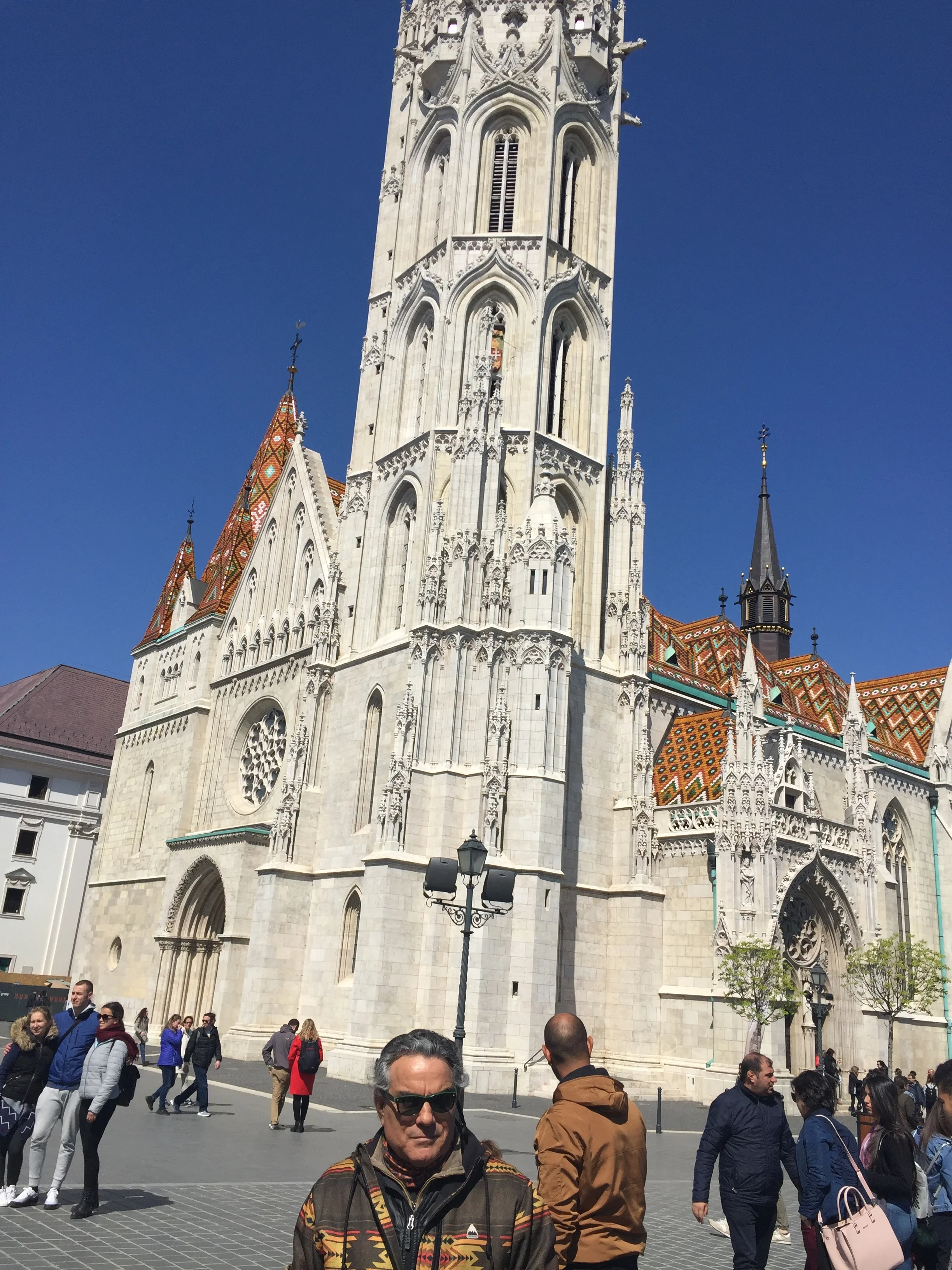 After lunch we crossed the Chain Bridge to Buda, we wanted to see the site in the sunshine with the kids and go inside the cathedral. We are really good at using the local tram. First stop, the high balcony on the top of Buda Hill to gain the most incredible views of the countryside around the backside of Buda and surrounding Pest. The sun is shining for once this week. Next, we visited The Matthias Church, an incredible Neo-Gothic structure with colorful tiles that are so unusual and special interior designs with floor to ceiling orange, brown and golden frescos and stained glass. We then walked the high wall that runs the entire length of the monstrous "Jozsef Varos" Palace. Again great views. The interior is not refurbished so we skipped it.