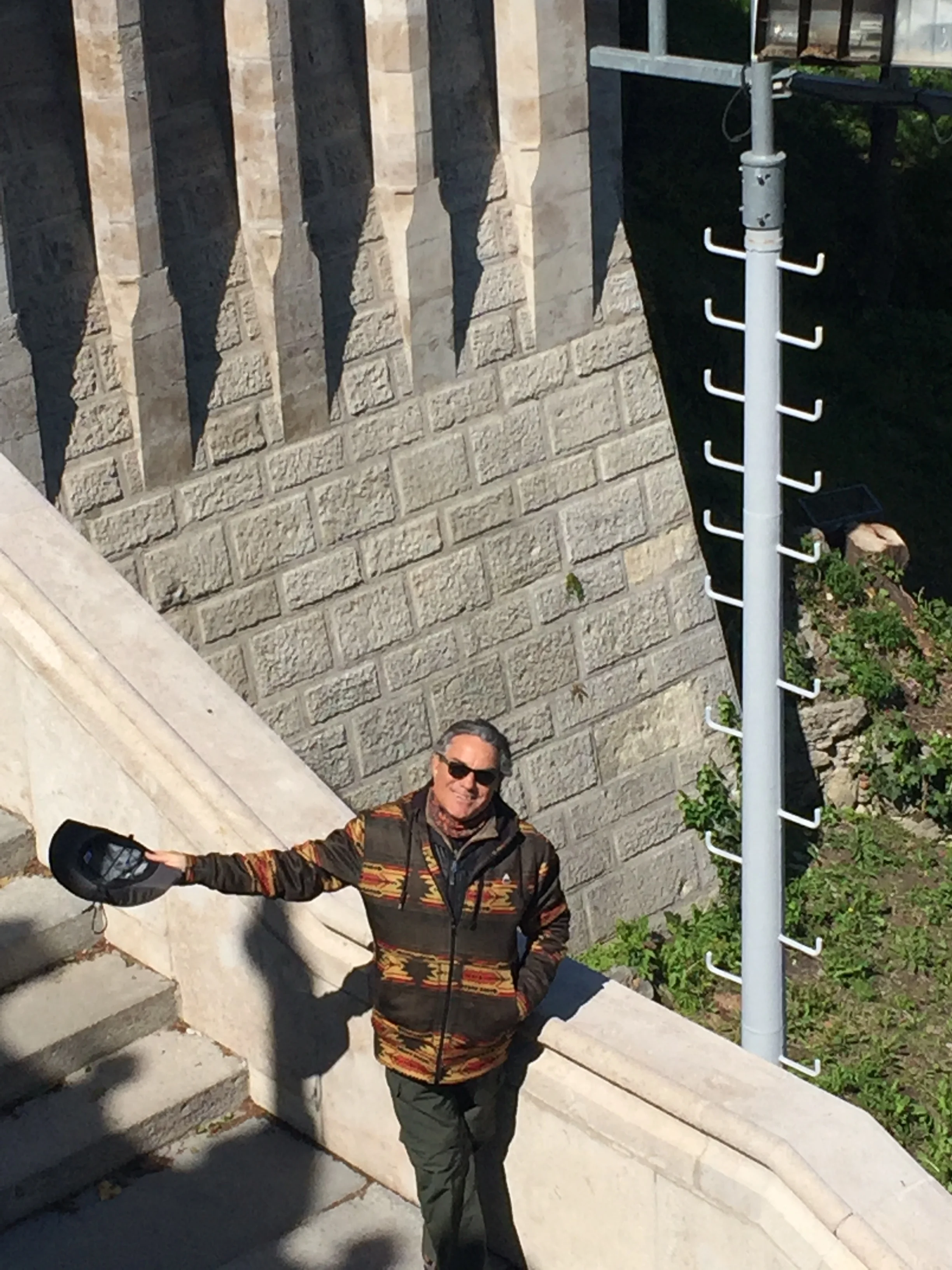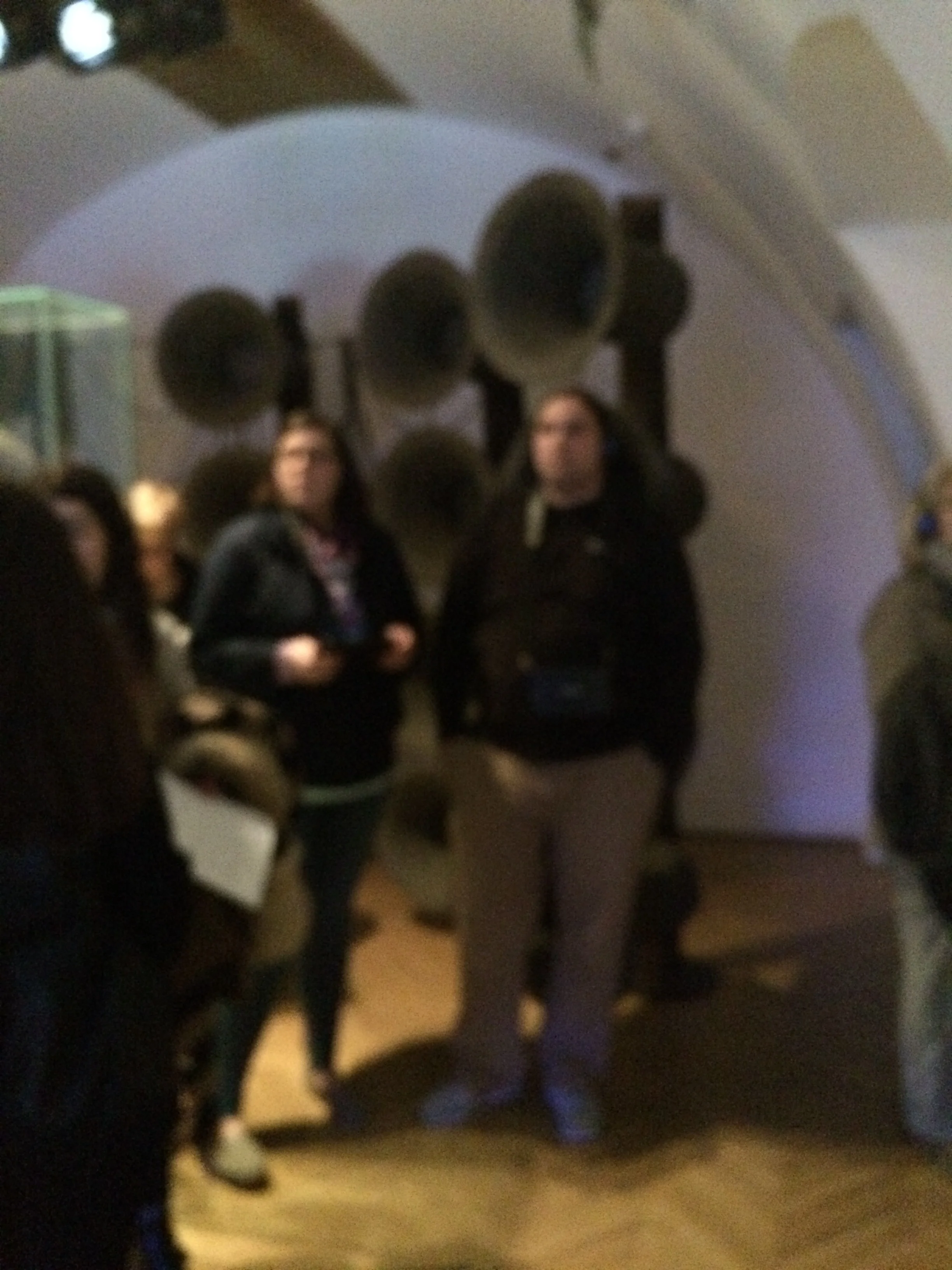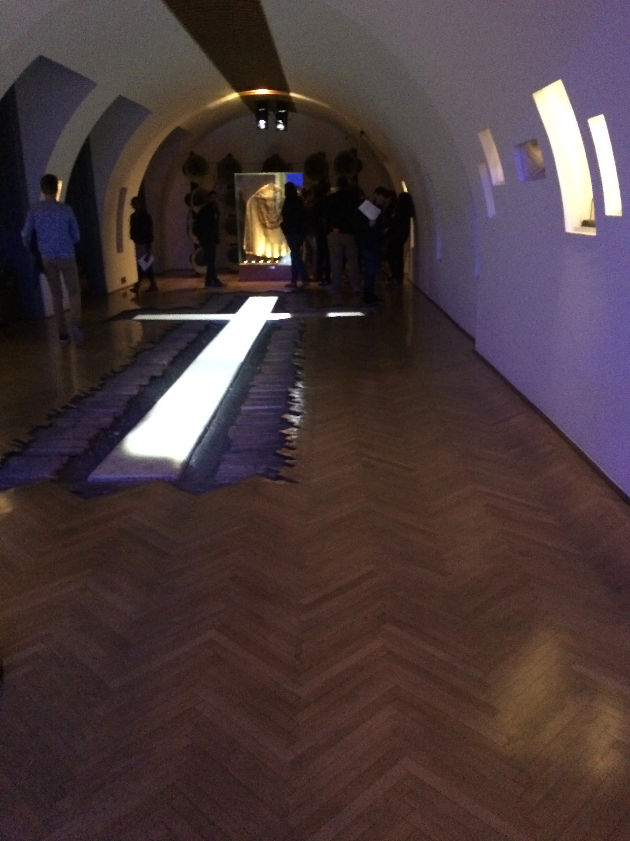 It started to rain. So we decided to start our exploration of the Pest side by visiting the ‘Terror House”. This was once the actual headquarters of a variety of Secret Police and interrogators. The first floor eerily displays a large Soviet tank partially submerged in a vat of muck. The dim lighting really sets a creepy mood. The“Terror House” Museum discusses the atrocities of the Nazis, Arrow Cross Party and then the Communists against the Hungarian people. The displays keenly instill the feeling of insecurity and fear caused by the havoc and mental anguish imposed. The most horrific display is in the basement which still stands as it did for decades as a torture chamber, with electrodes, gallows, batons, and hot boxes. No photos allowed in the museum but we got 2 fuzzy ones, that show a memorial and Teddy and Staci in a display.