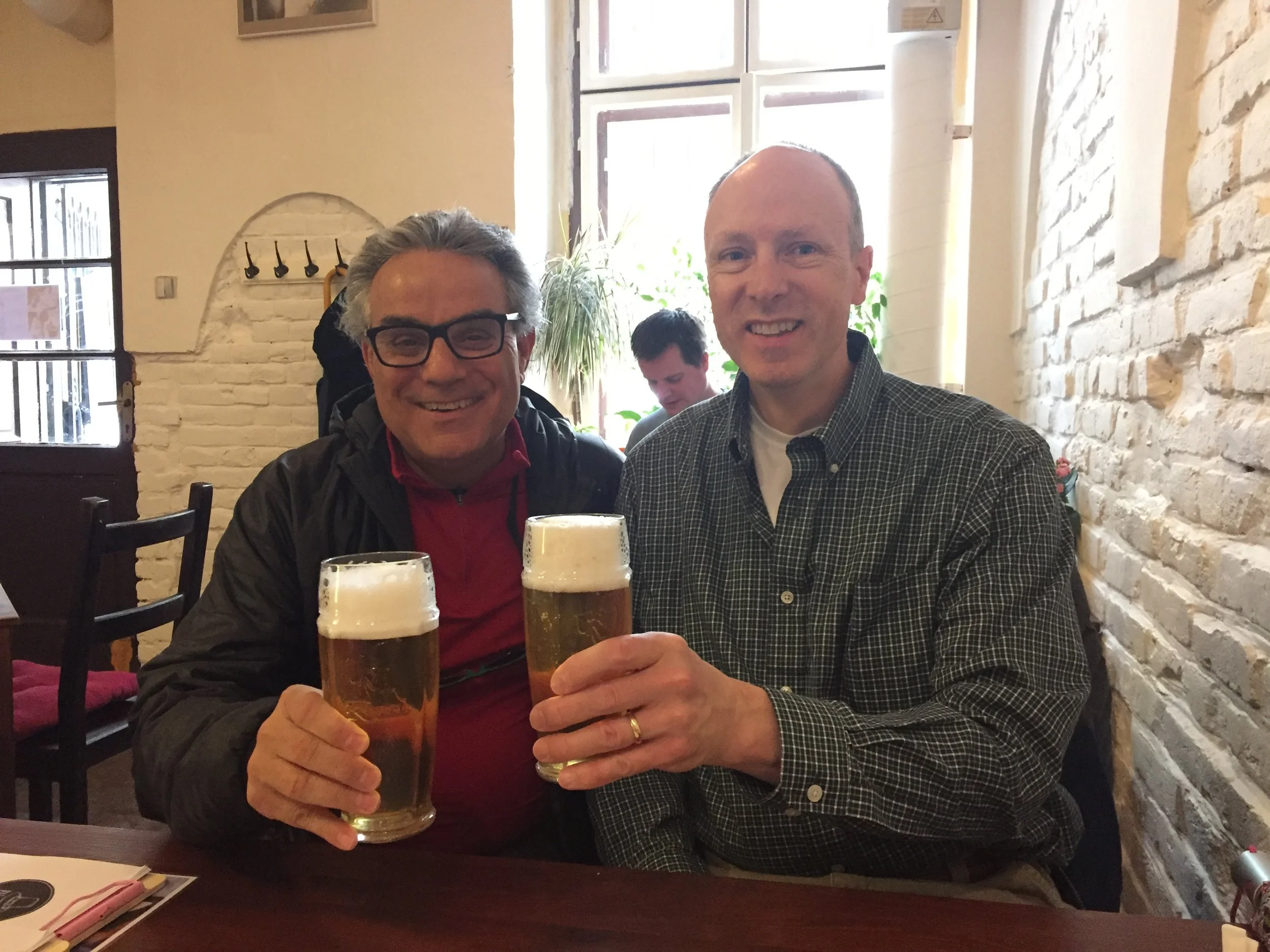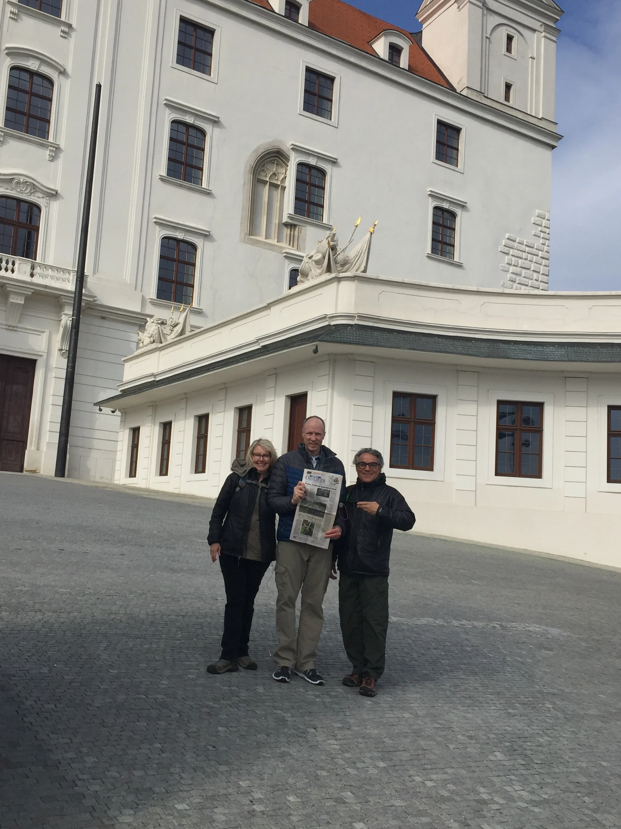 The kids, our sweet nephew and wife, got up at 5:00 AM and left early for the Airport for the flight back to the USA. We got up to say good bye and then enjoyed a leisurely morning until our 11:00 PM Flixbus ride to Bratislava. Yes, we had been there with the kids, but we were returning to spend 24 hours with our good pal Brian from our hometown. He had a work assignment in Bratislava and since we were so close, about 60 KM, we diverted our trip south to see him and catch up on family stuff. He brought over an Observer Newspaper for photos and Kathleen also sent him over with boxes of great snacks for us. Thanks guys! The first afternoon we checked out the large Castle which is described as the “table” by locals due to its 4 corner towers. We walked 4 stories of steps to the top of the tallest tower. We then searched for authentic Slovakian food, ie., sausages, sour kraut, potato pancakes, pork knuckle and local beer ( surprise—the beer bottle label displayed the Cathedral painting). The next day, we got free Sunday passes to the City Museum and the Street. Martin Cathedral. Fun. At 2:00 PM Brian sent us off north to Poland on another Flixbus.