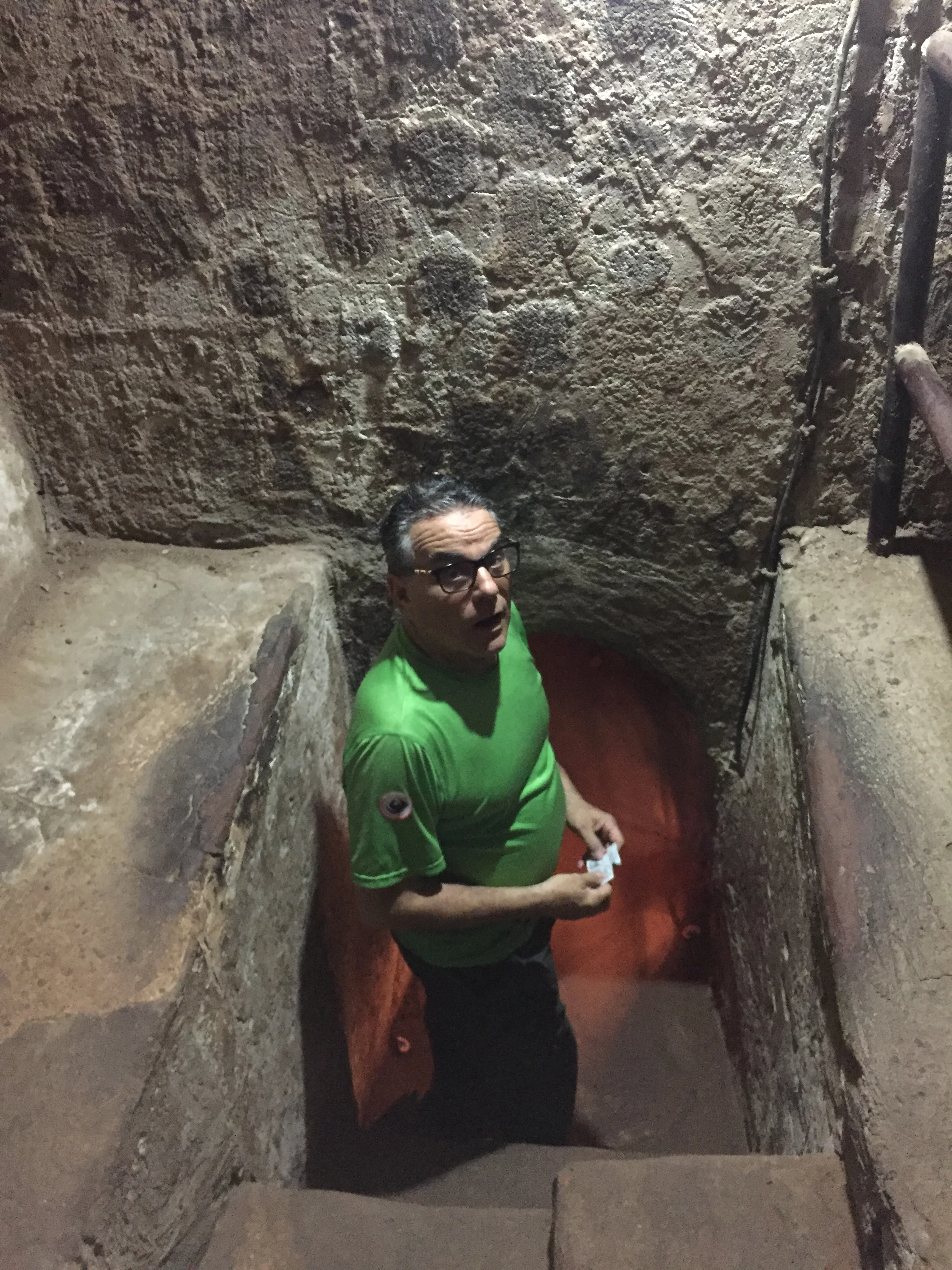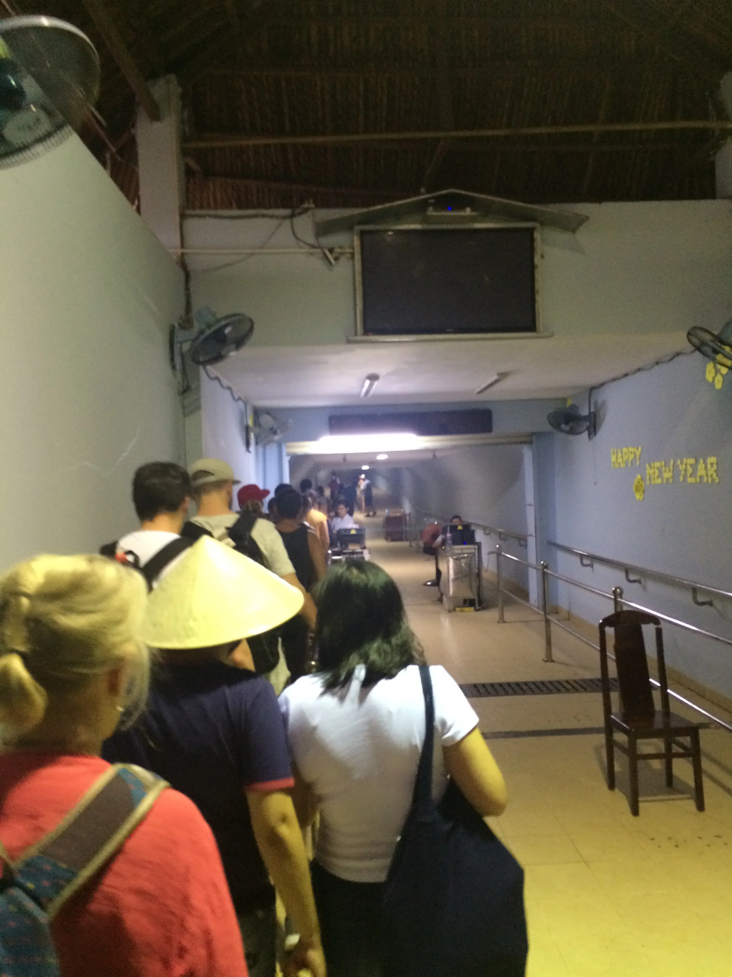 We are invited to enter the real tunnels used by the Vietnamese (not the sanitized replicas created for Chinese tourists). One tunnel is lighted for visitors. The tunnel is 3 to 4 feet in diameter. You must bend over and crouch to get through. The walls turn sharply to block the view and compartmentalize the spaces. The exit points are small and camouflaged. The air vents are hidden, for example, in large jungle termite hills arising from the ground. The complex has 3 levels in order to resist bombing. The young Europeans took advantage of this strange opportunity, but seemed appropriately somber. There was 150 feet of tunnel open to the public, with exits every 30 feet.