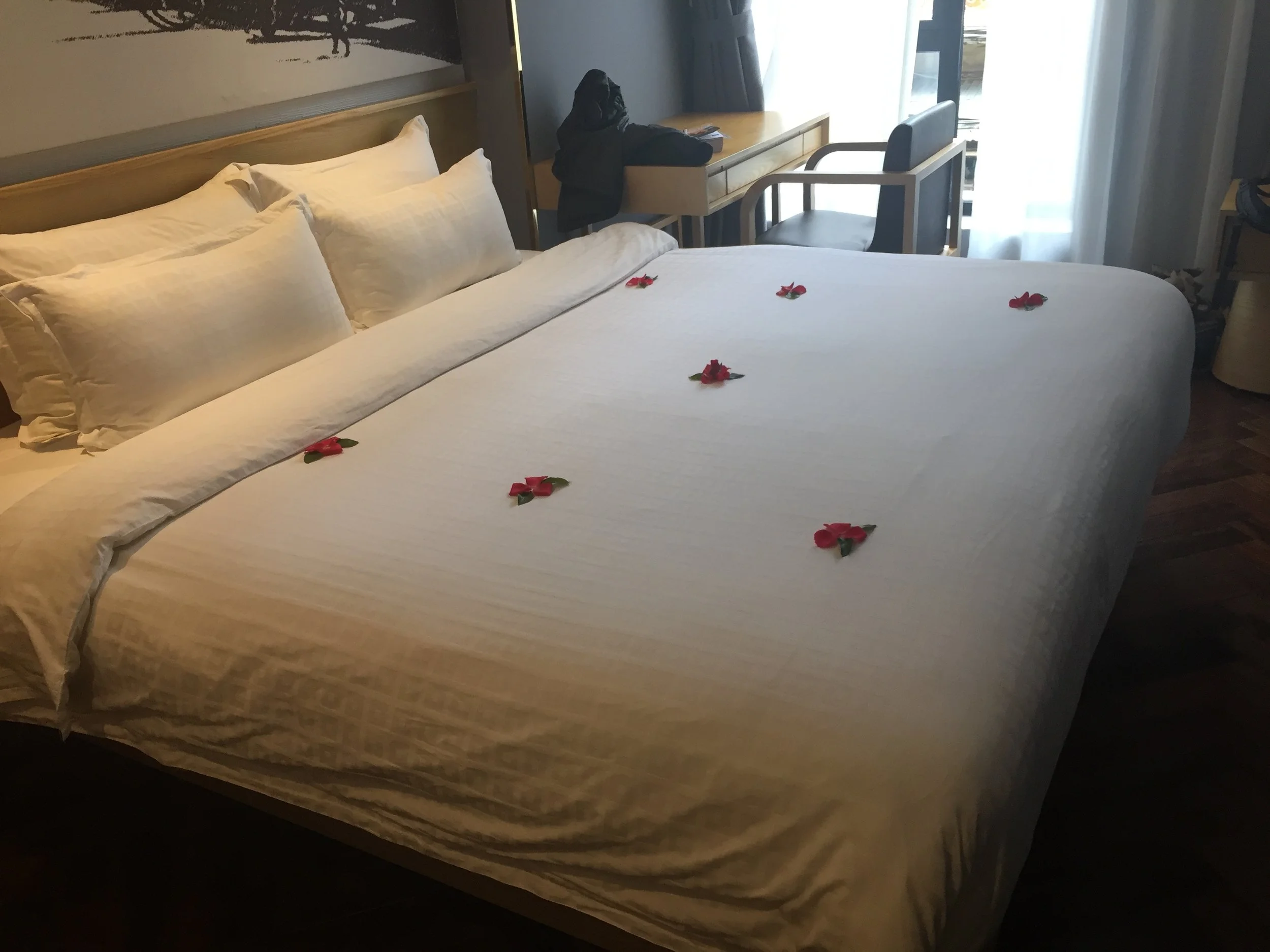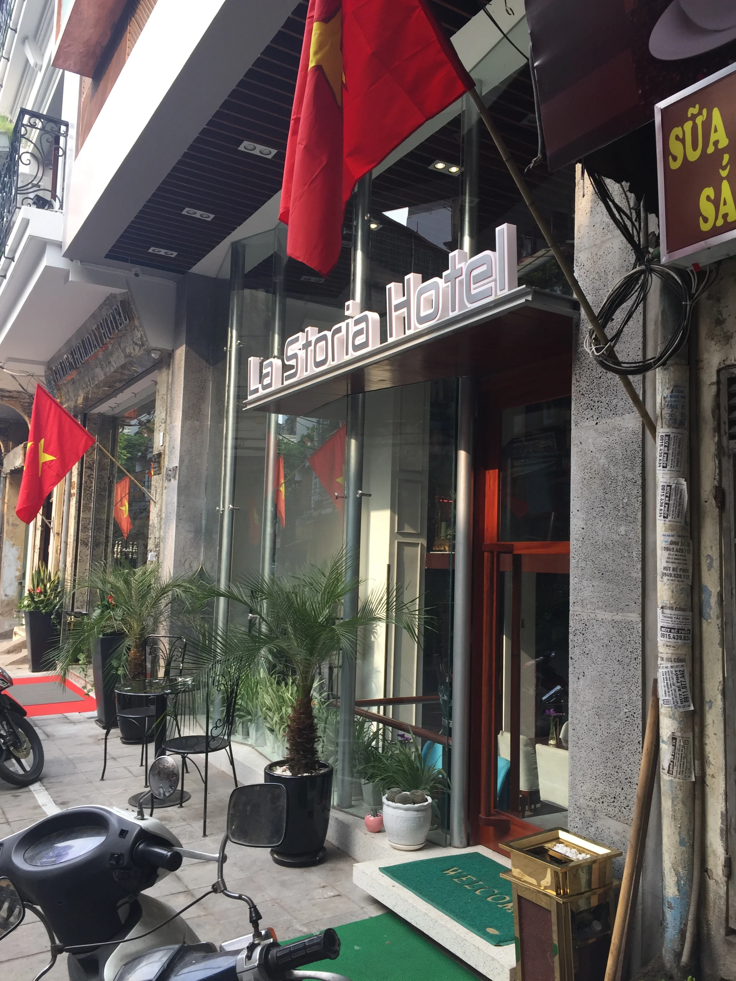 We landed in Hanoi. Our boutique hotel, La Storia, located in the Old Quarter arranged for transit. No trying to figure out the buses on such a long haul this time. When we arrived the staff put us immediately at ease; many warm welcomes, fruit drink, cold towel. We arrived before check-in so we sat in the lounge where the manager joined us and helped us plan out some excursions, got us plane tickets and transports. She spoke marvelous english and was kind and professional. Thanks Amber. We were escorted to our room which was modern, had flower petals on the bed, and was nicely appointed. The window over looked the Main Street. We felt comfortable. After freshening up we decided to explore the neighborhood. It is very, very warm and humid. See the photos below, this is what $30 per night gets including flip flops, bathrobes and fruit.