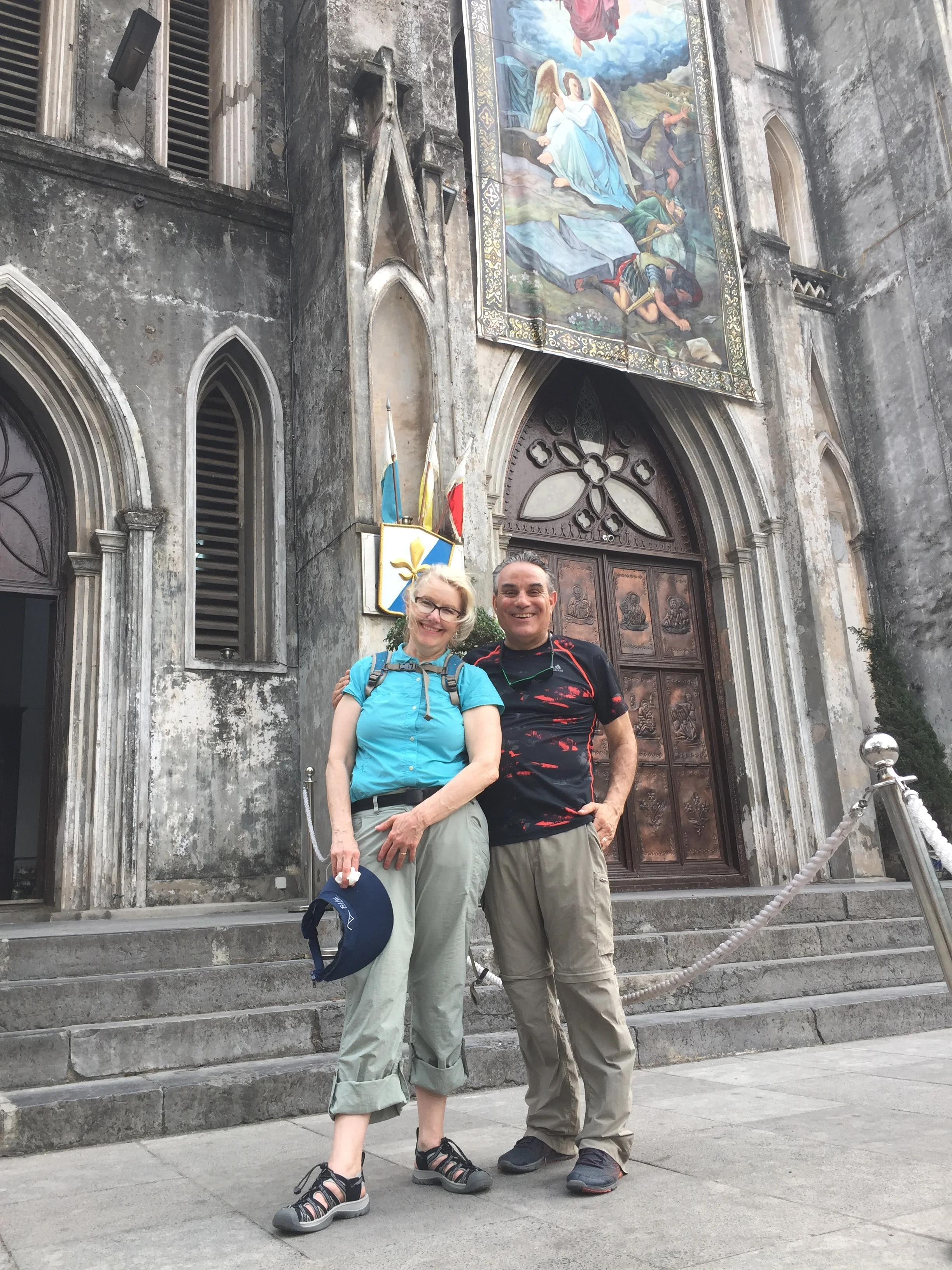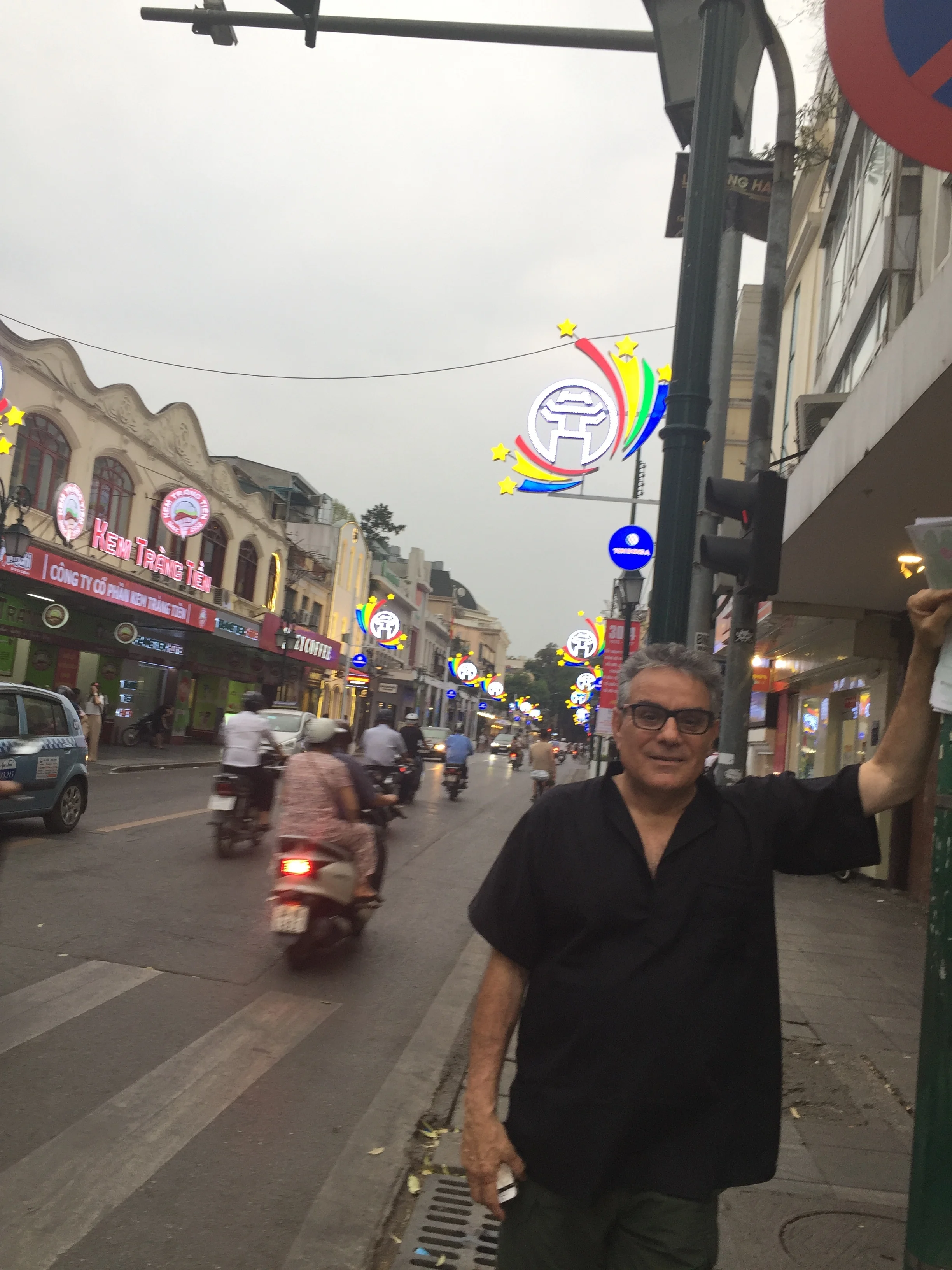 Old Quarter Hanoi is kinetic; a flurry of activity, sounds, businesses, and people. The sidewalks in front of the shops act as parking spaces for zillions of scooters and motor cycles. Pedestrians need to walk on the street curb. Crossing the narrow streets is a crazy experience; There are not that many cars so you can see those coming, but the zillion scooters drive on both sides of the street and run through intersections with continuous honking. “HONKING” is the sole safety practice. We looked for openings and then hopped, skipped, and sprinted across. We actually saw an auto collide into the back of a scooter with Mom and kid. A crowd gathered for a moment, but the Mom got her bike up, restarted, and took off kid in tow. The lady driver in the expensive “Mercedes” would have to explain the crumpled front end bumper. Janet wishes we were immediately outside the Quarter; Frank digs the action.