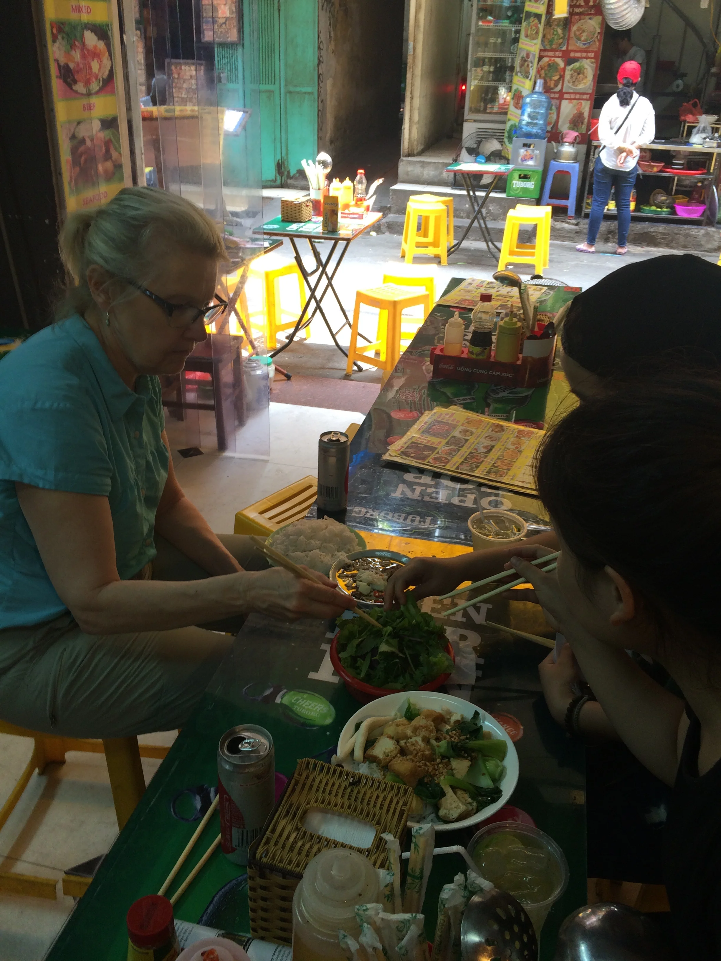Our first meal was at “Highway 4” near the hotel. Pure Vietnamese food. We ordered the favorites; non-fried Spring Rolls made of finely sliced veggies and rolled in paper thin rice paper, green beans with chili's and soup with grilled pork balls, veggies, and noodles, and cold “Saigon” beer. We used chop sticks pretty well. This was an expensive restaurant, it cost us d_341,404.00, or $15 bucks.