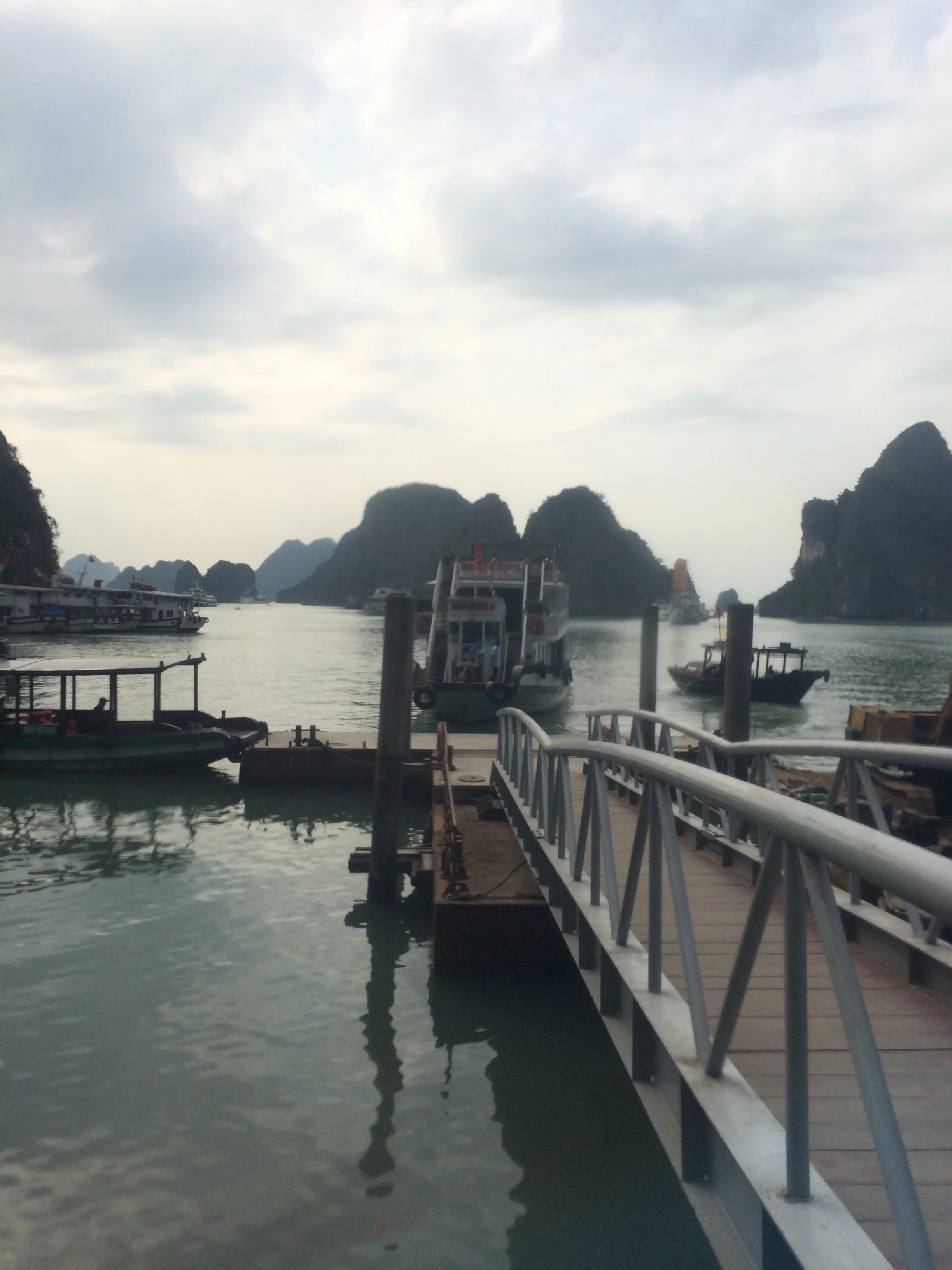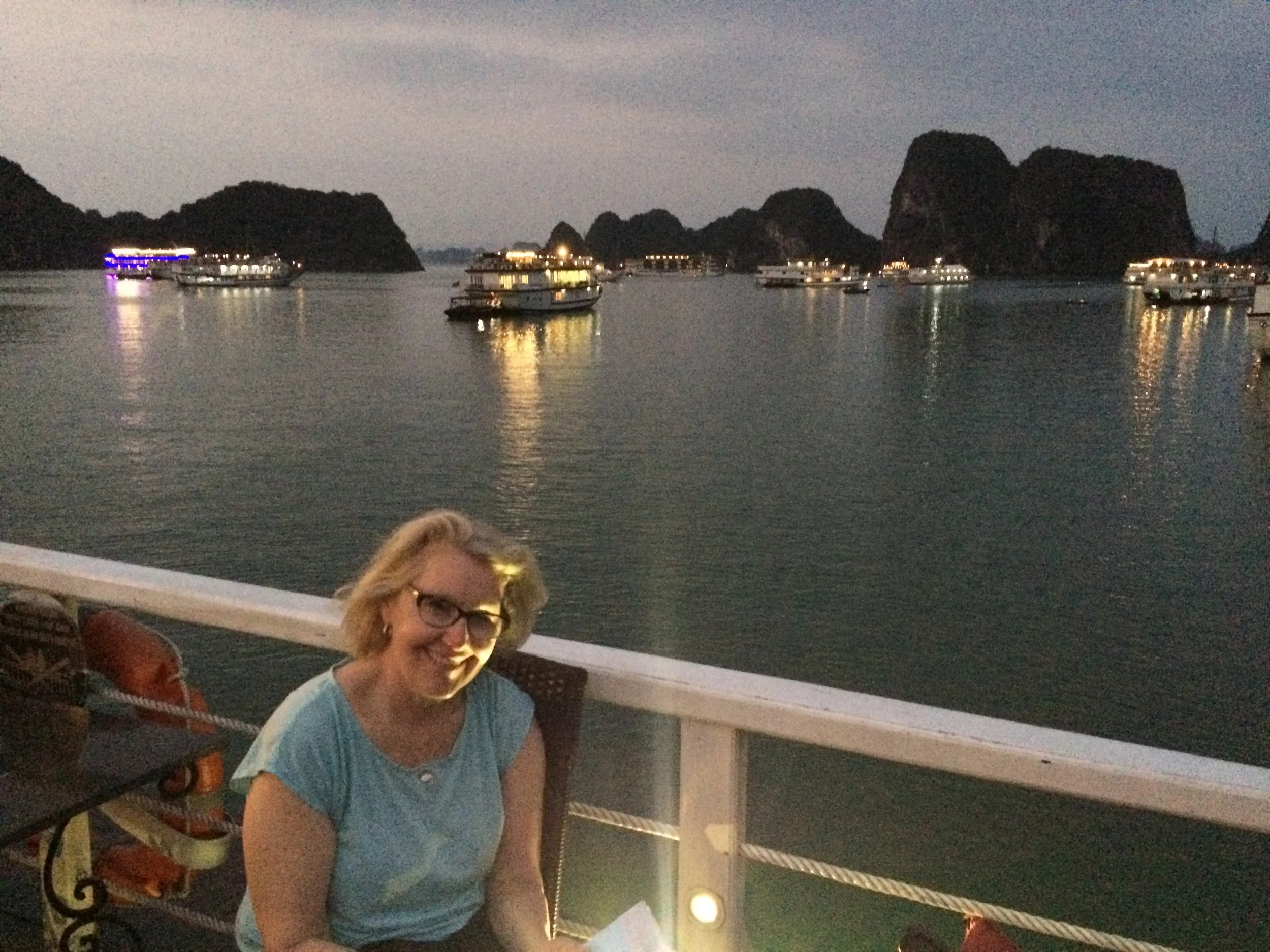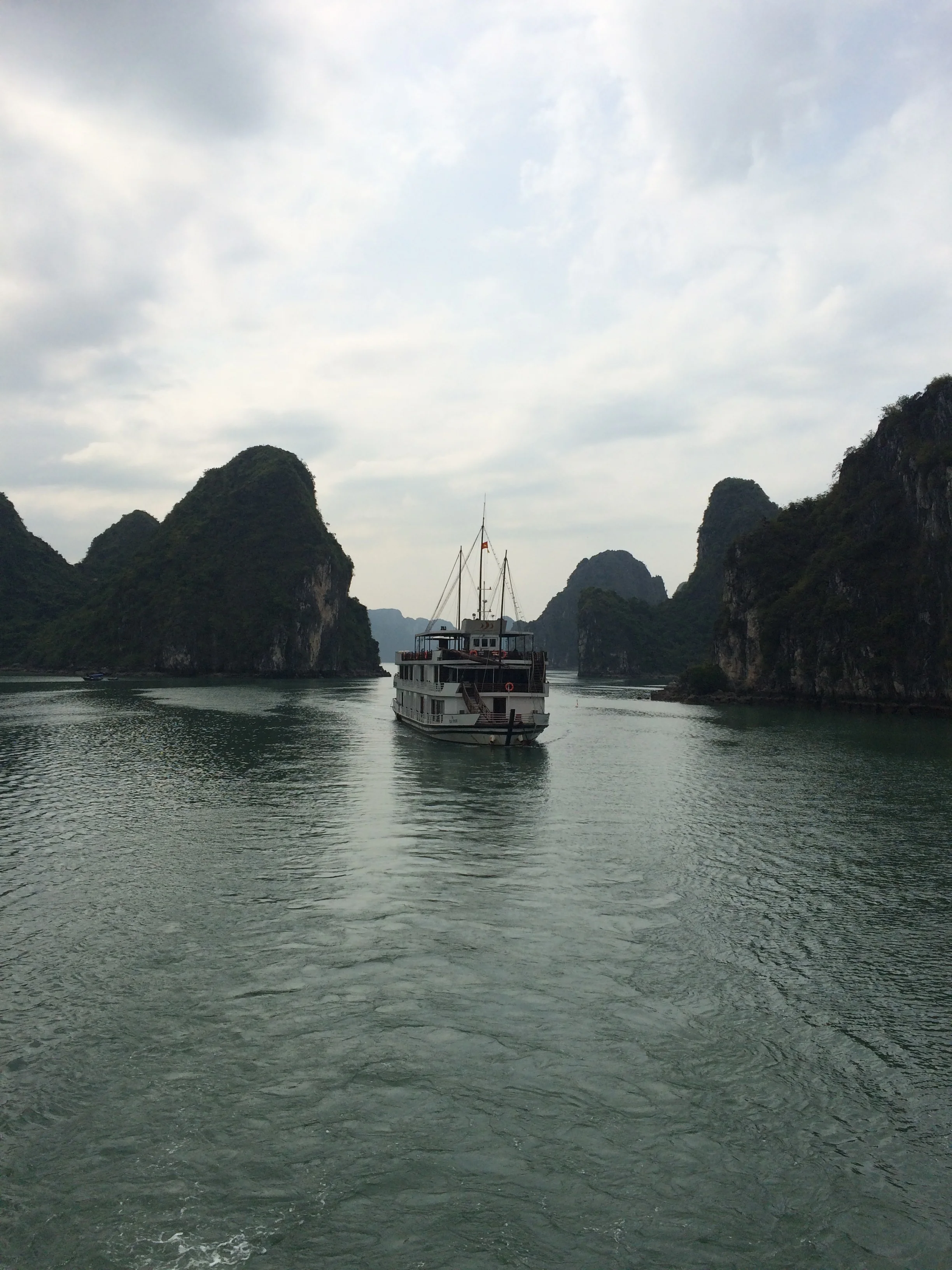 Upon arrival at the docks you observe scores of anchored River Ships, some very large and others smaller. We dingy out to our double decker wood ship with classic oriental top sails; not the biggest boat but we all agree the “ Carina”was the most handsome. The ship was not sold out. Our shipmates occupied 6 of 9 cabins, which made ship board life very comfortable in the dining room and top deck. Once luggage was stored we ate together and then enjoyed the great views of the course taken between the towering rock formations bursting from the sea. The top deck was the length of the ship with sitting areas and bar, the space limited only by the collapsed sailing masts and the 2 little kids under 5 years that ran around the deck with playful exuberance. It was cute; a little Chinese boy running after a little blond haired Czech girl and visa-versa. They played together most of the trip.
