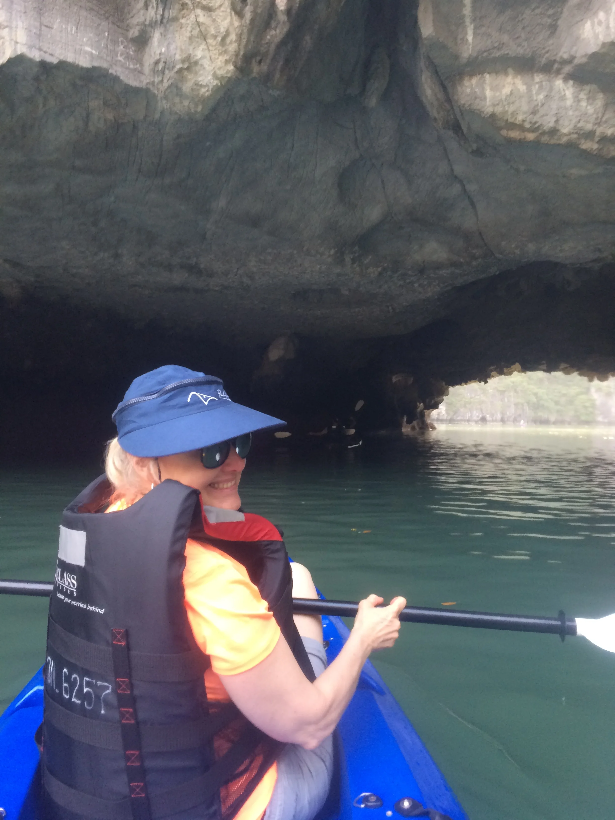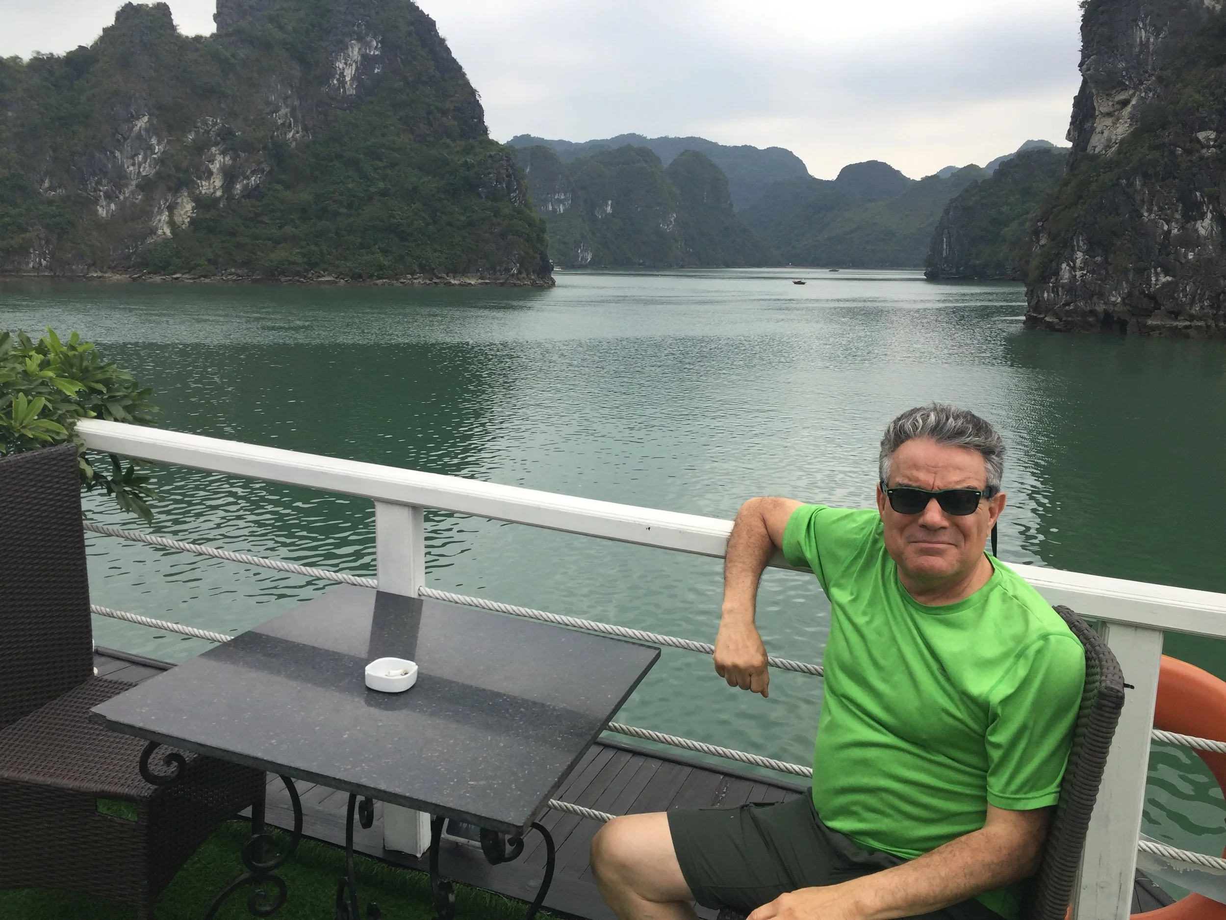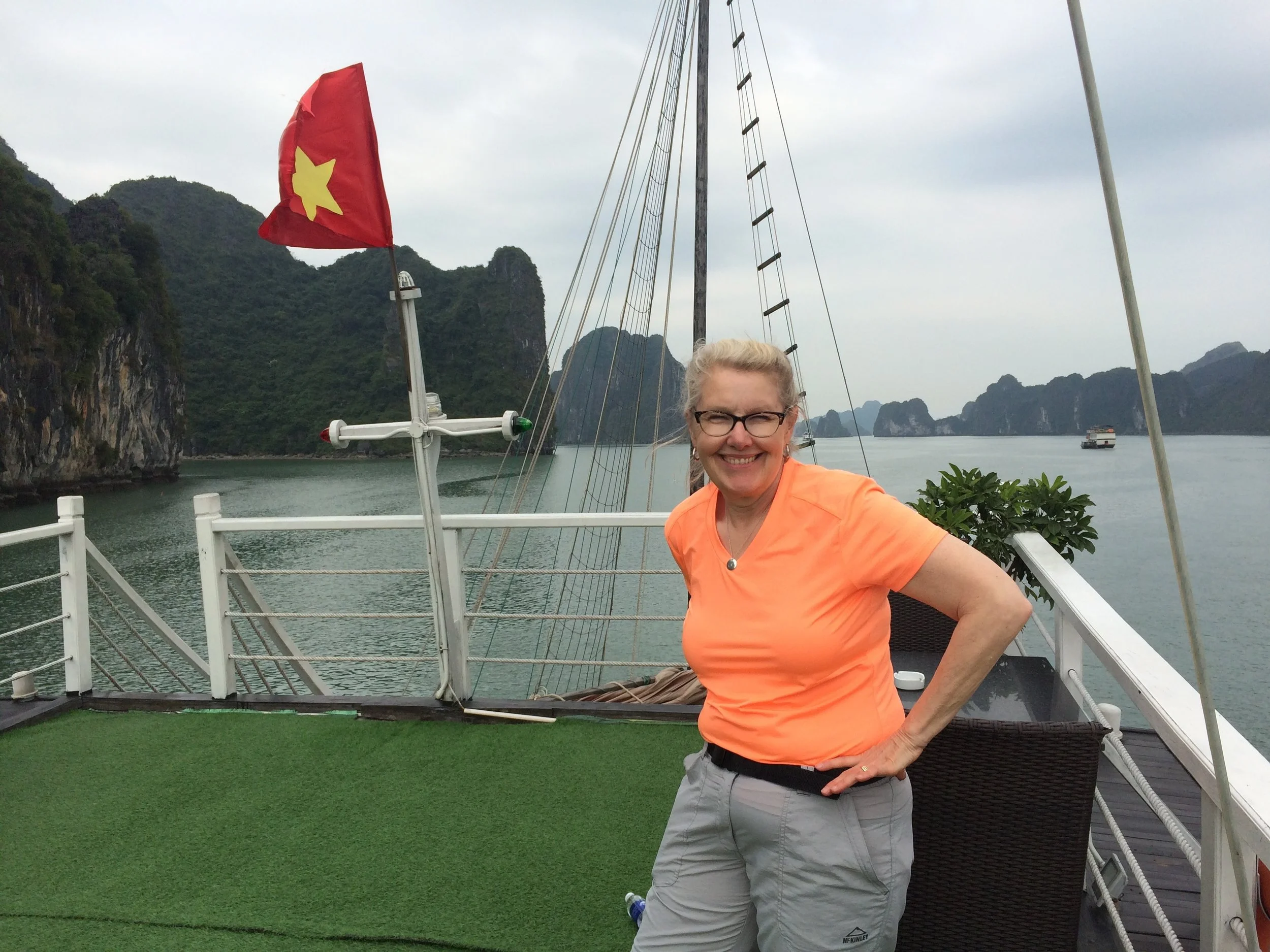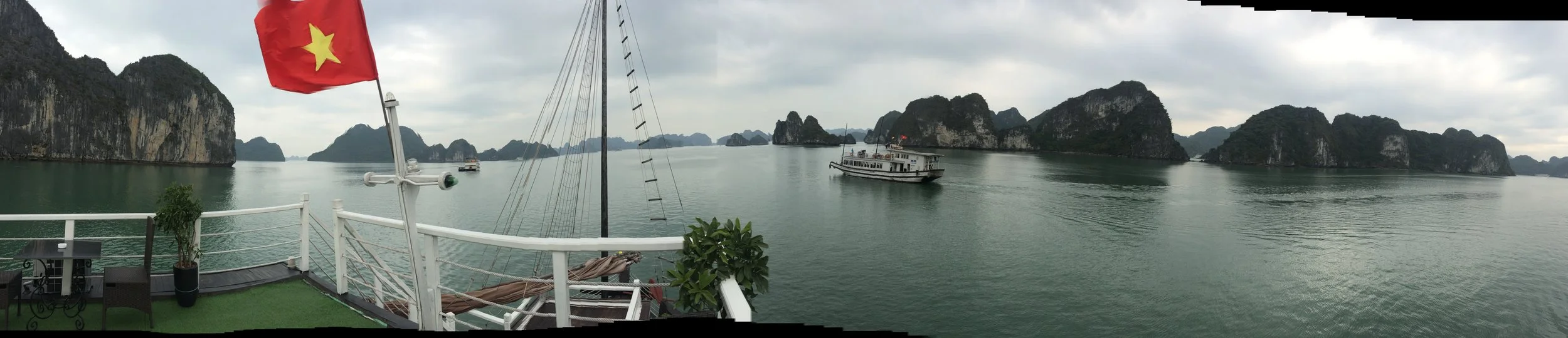 Upon arrival at the docks you observe scores of anchored River Ships, some very large and others smaller. We dingy out to our double decker wood ship with classic oriental top sails; not the biggest boat but we all agree the “ Carina”was the most handsome. The ship was not sold out. Our shipmates occupied 6 of 9 cabins, which made ship board life very comfortable in the dining room and top deck. Once luggage was stored we ate together and then enjoyed the great views of the course taken between the towering rock formations bursting from the sea. The top deck was the length of the ship with sitting areas and bar, the space limited only by the collapsed sailing masts and the 2 little kids under 5 years that ran around the deck with playful exuberance. It was cute; a little Chinese boy running after a little blond haired Czech girl and visa-versa. They played together most of the trip.