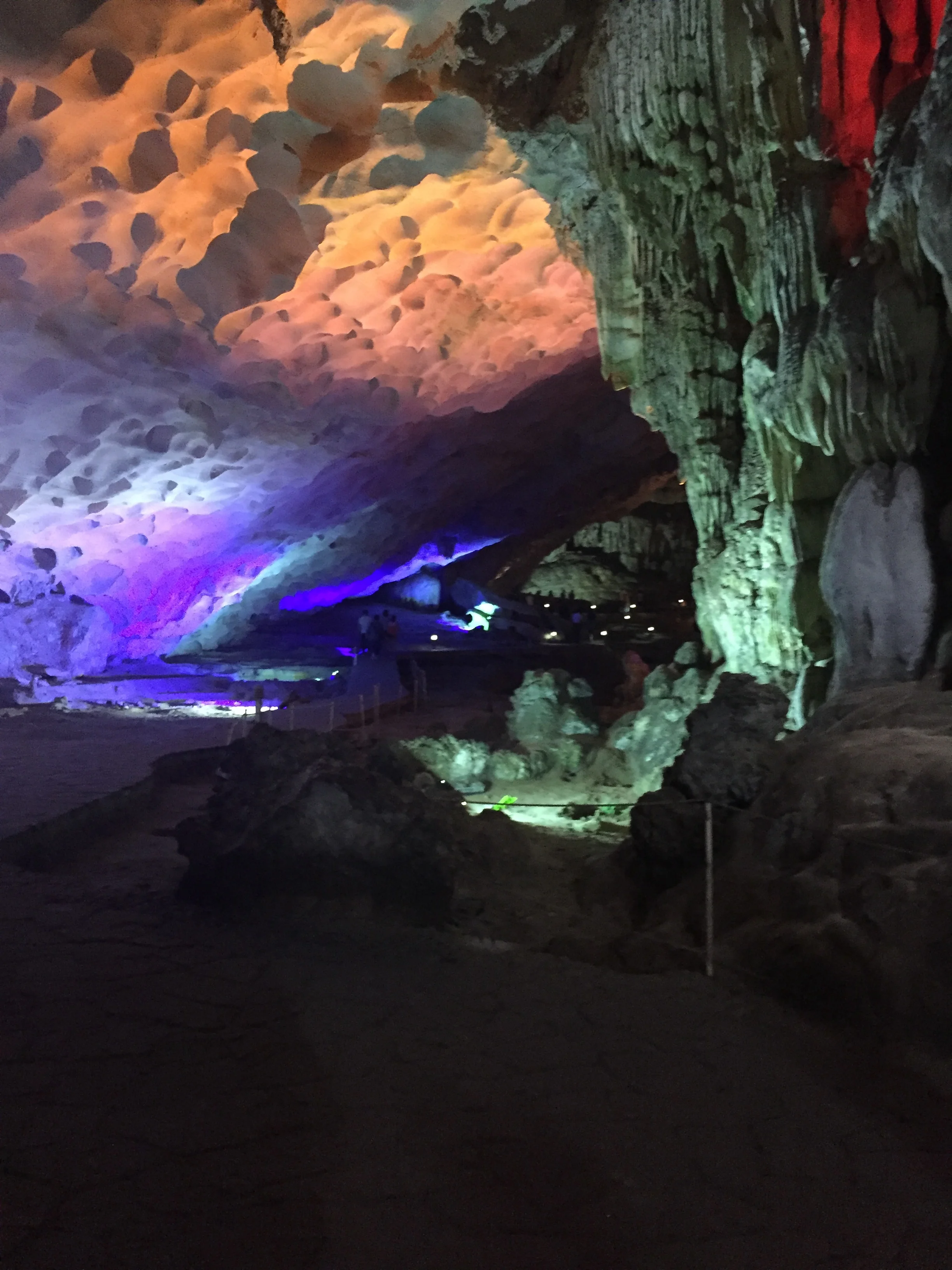 We reached our destination and anchored. The dingy took us to on-shore docking where we exited and trekked through these enormous natural caves formed by the action of long gone water erosion.