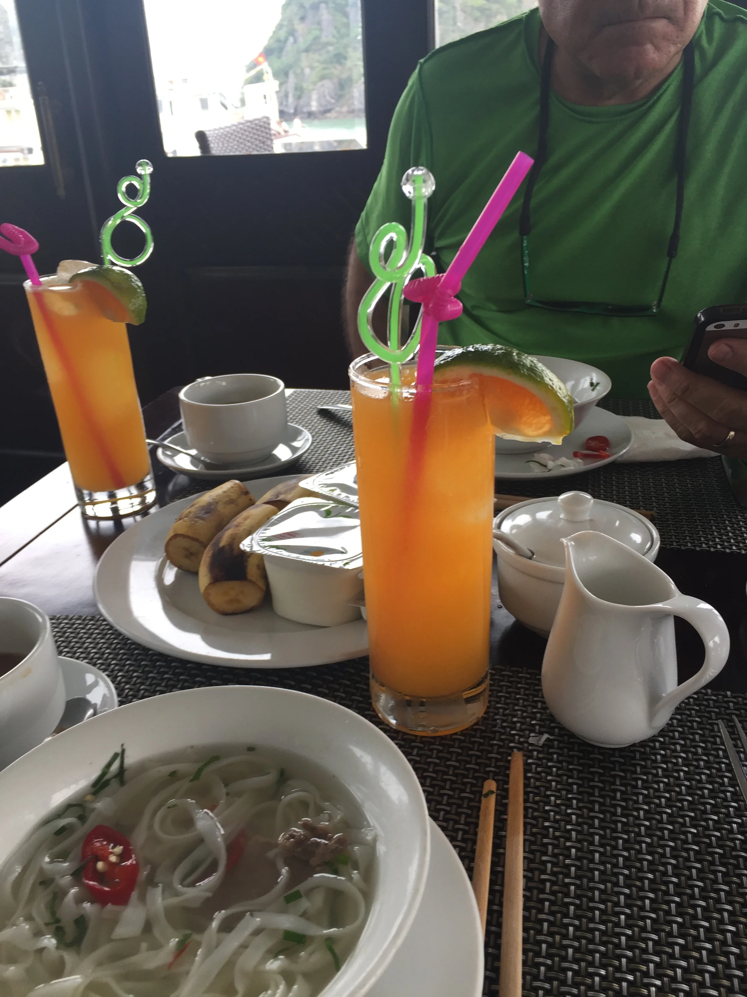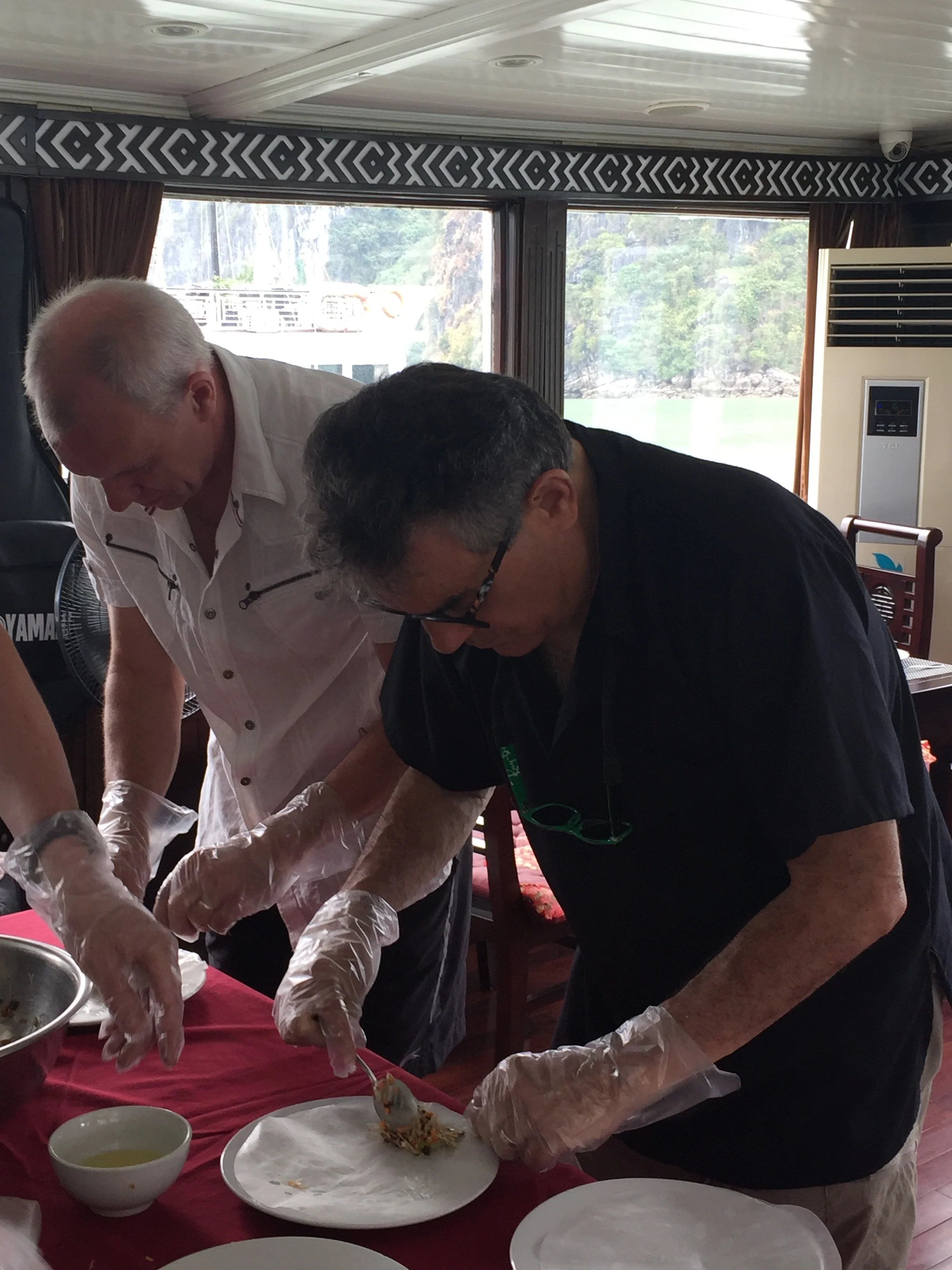 Brian called us to return. Back to the ship for cooking class, lunch and mid-day departure to Hanoi. We had first thought about a 3 day trip, but with the rainy forecast we chose just 2 days. The shorter excursion was just fine. We felt like we got the full fun experience with nice air conditioned accommodations and really good food. The longer trip takes a wider course and you can go on fancier ships, but we felt satisfied.