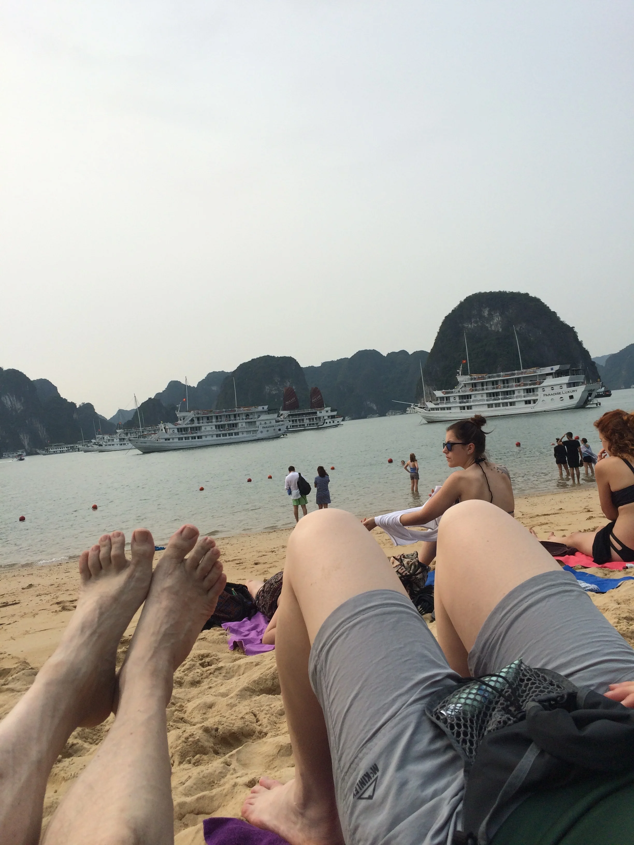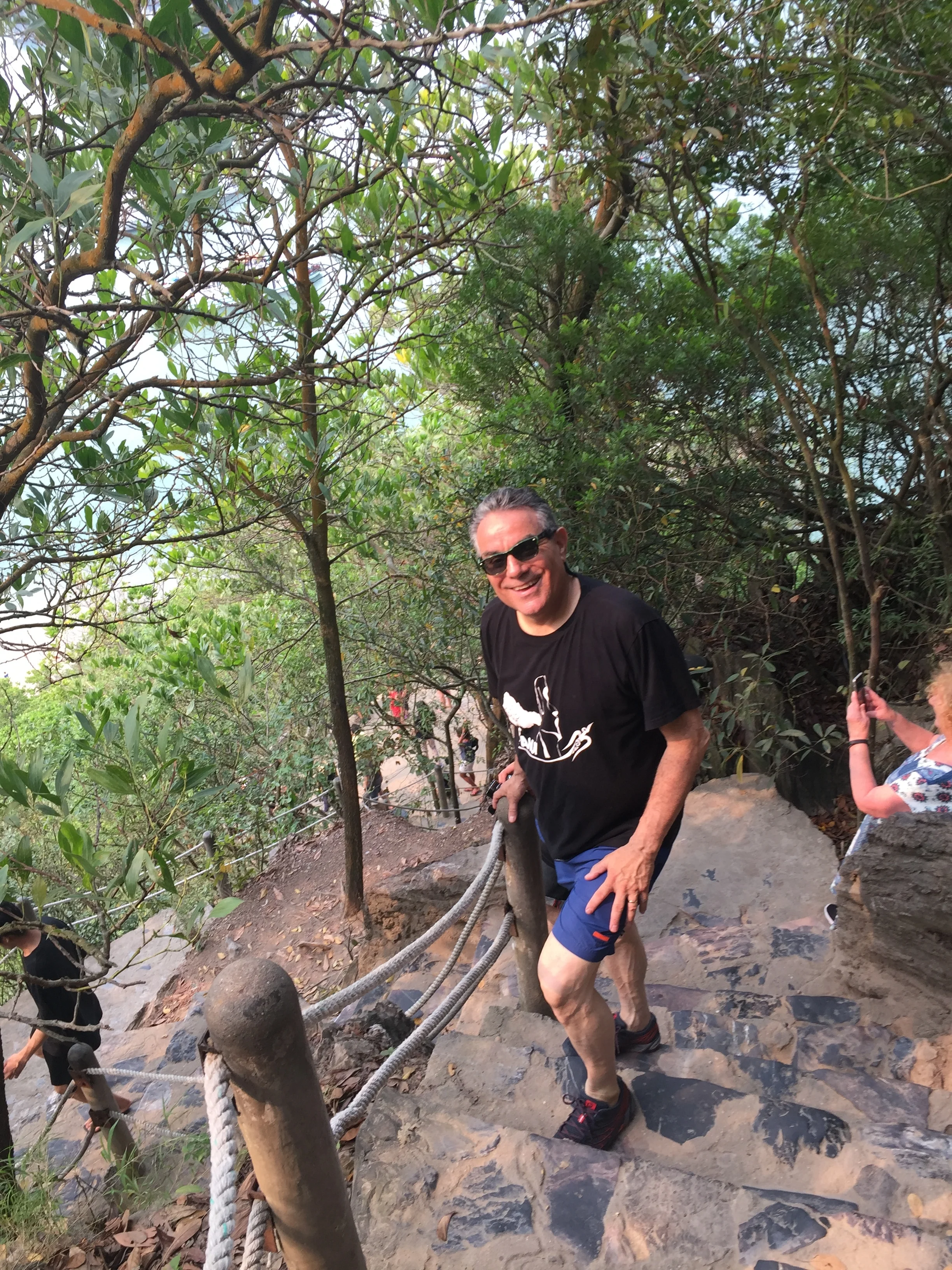 After breakfast we took the dingy to a “special” island mountain with a sandy beach and that was topped by a Pagoda. There were many dingy docked. The steps cutting through the rocks of the mountain trail to the Pagoda where rather busy. We, of course, trekked and sweated to the top. The views up high were really enjoyable as you could see ships surrounding the island and moored near the main docks in the bluish water. We descended and had time to stretch out on the beach for some rays, our feet playing in the sand.