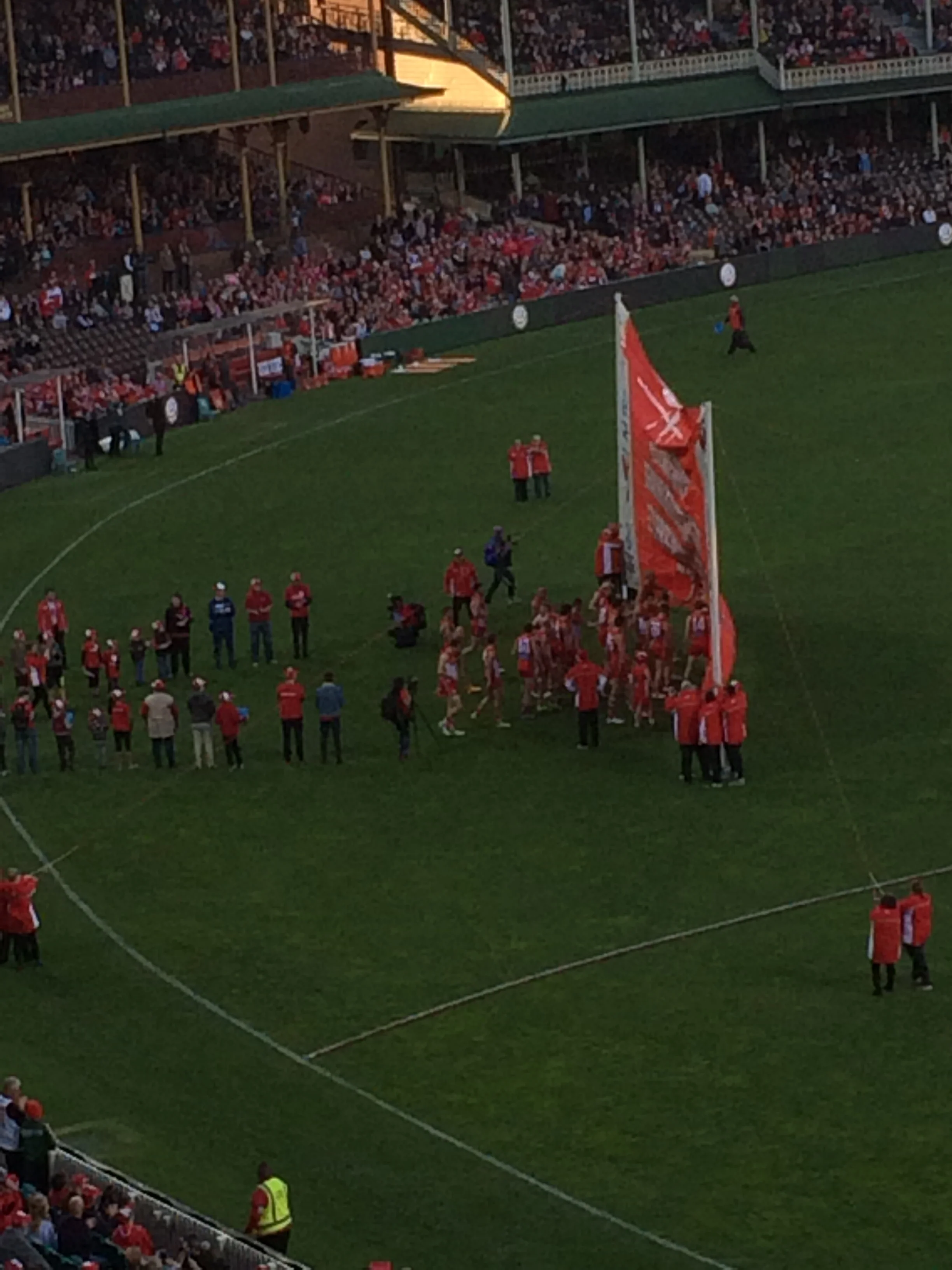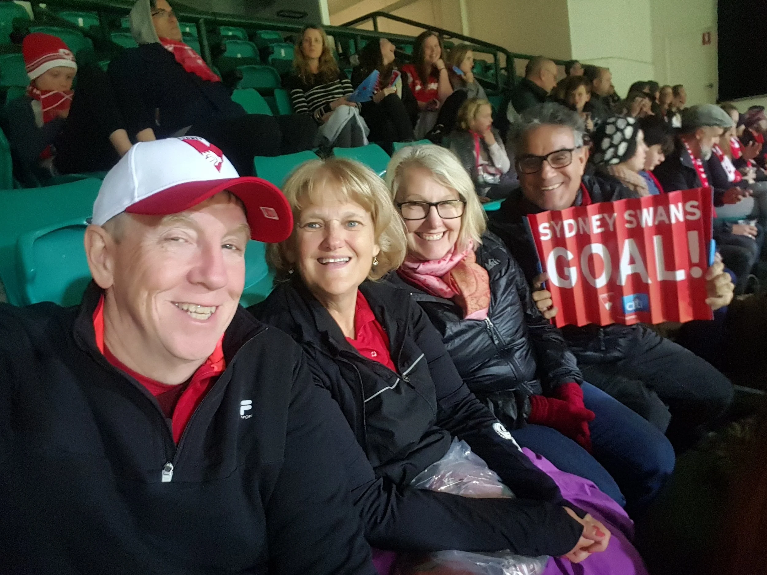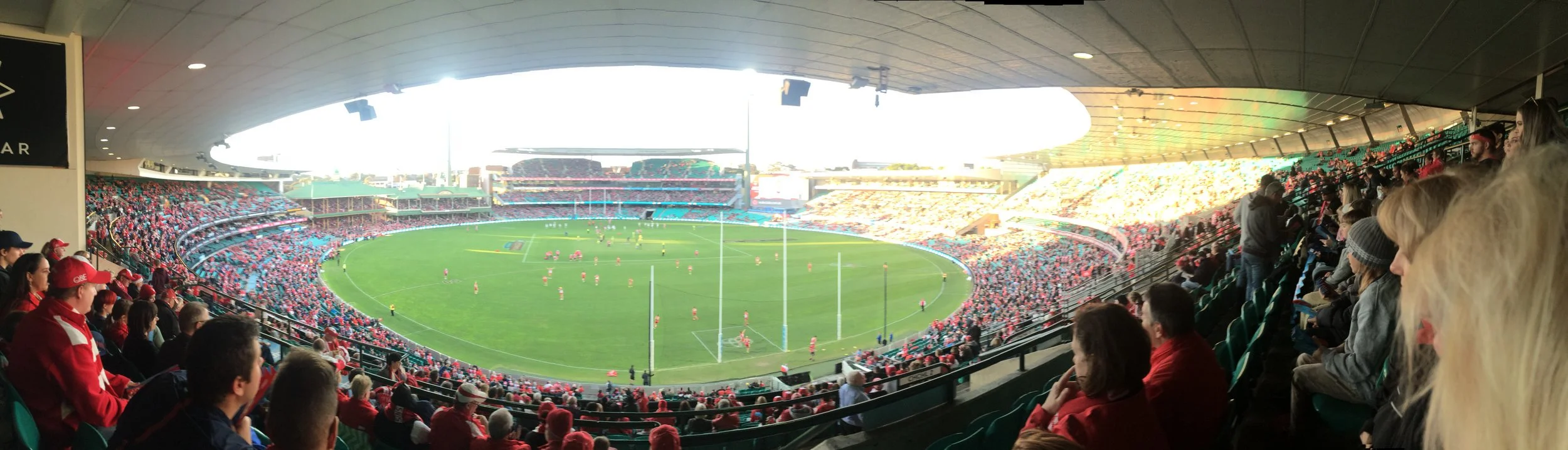 The next day, after some brief sightseeing, we capped off our final day by going to an Australian Football League Game. We joined 36,000 other blokes and gals at the Sidney Cricket Stadium to watch the Sidney Swans -vs- Cold Coast Suns. The field is a large oval extending to the bleachers, giving the 36 players plenty of space to kick and pass the large oblong ball directly to their teammates. Running is limited to 15 meters, so it is not like Rugby. The game is more like jump ball chaos, skillful played, with long kicks through the double uprights. The scoring is usually competitive and high. Here, the Suns folded and the Swans won 109 to 42, which was alright for the the boisterously friendly local fans. We think half time Marching Bands may be a big hit here, it just seems like that kind of crowd. The pitch is certainly big enough.