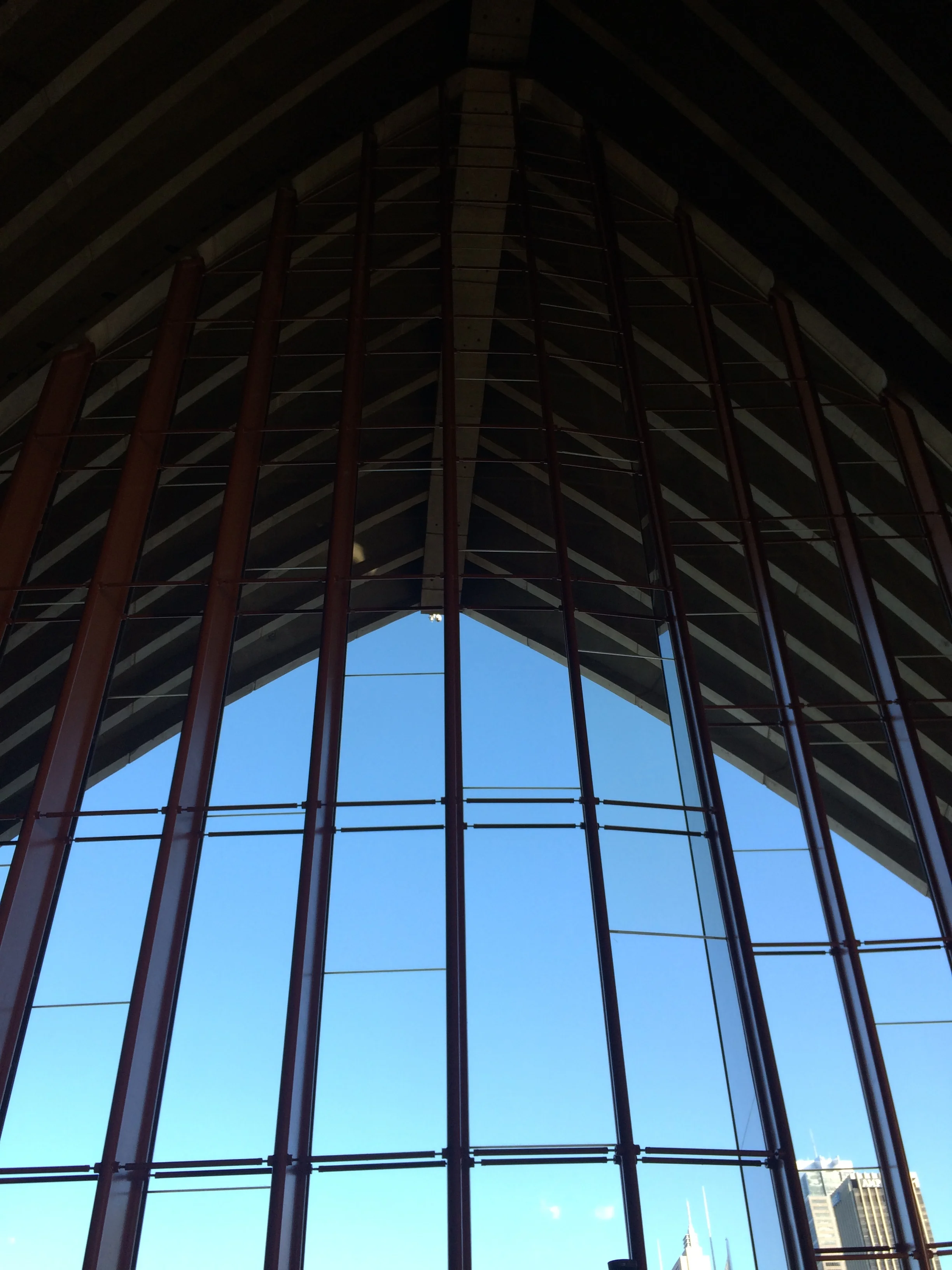 The construction methods and angles are just crazy cool. The sails, early on called shells, are formed concrete held up by metal girders and formed metal; the mechanical systems, Air Con, and electrical are placed and hidden between the concrete sails and the interior infrastructure of ceilings and walls. The interior is covered and decorated with Teak slats and other special woods on the walls and ceiling which abut the large opaque windows that rest below each sail.