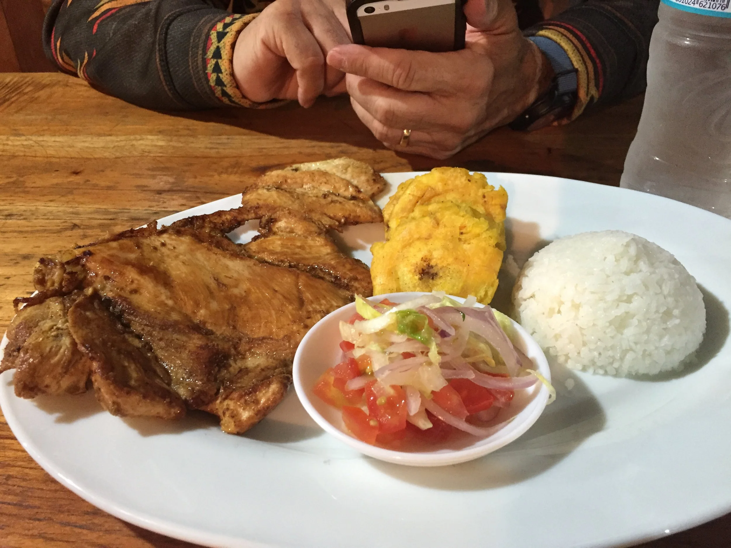 At the bus station we went to the information booth to inquire what bus company to buy the tickets, after some searching we managed to find the office, used google translate to purchase the ticket, wait for the attendant to find change for our $20 bill and she directed us, we thought, to where to go, with 10 minutes to spare. As we tried to enter the bus loading area we were stopped at a metal turnstile with an attendant that waived us away, we thought upstairs? so now we start running, from one end of the station to the other, I am sure we were a funny site, this station only had local people and here Frank and I are running back and forth trying to figure out how to get to the bus. The issue was the turnstile, you have to put in a dime to get through, that was all we had to do, add one measly dime. So once we paid we go to our bus dock at 8:59 and, no buss, already gone, too bad, they all leave EARLY in Ecuador. After some loud discussions, hand jesters and pointing at our watch, we got a refund for the fare and were directed to take the “transfer bus” to a secondary town where we could change to the bus that takes us to the site. Long story, but we did make it and this bus was truly a "chicken" bus, old, windows too dirty to see out of, twice the amount of black smoke. On the upside the people on the bus, all locals, were great, giving us instructions at each stop, how long we had to go, and after TWO hours we made it to the ruin, just in time for a major downpour! But I try to always be prepared so we took out our rain coats and pants and requested our tour guild, The attendant looked very surprised that we wanted to proceed, but after a small wait a tour guide with very good English showed up and we got a private 45-minute tour, in the rain. It was great, just like football games. We showed up 45 minutes early for the direct bus and had no issues finding our way home. Dinner was very good burgers and fries, after an 8 hour outing Frank pronounced he needed comfort food.