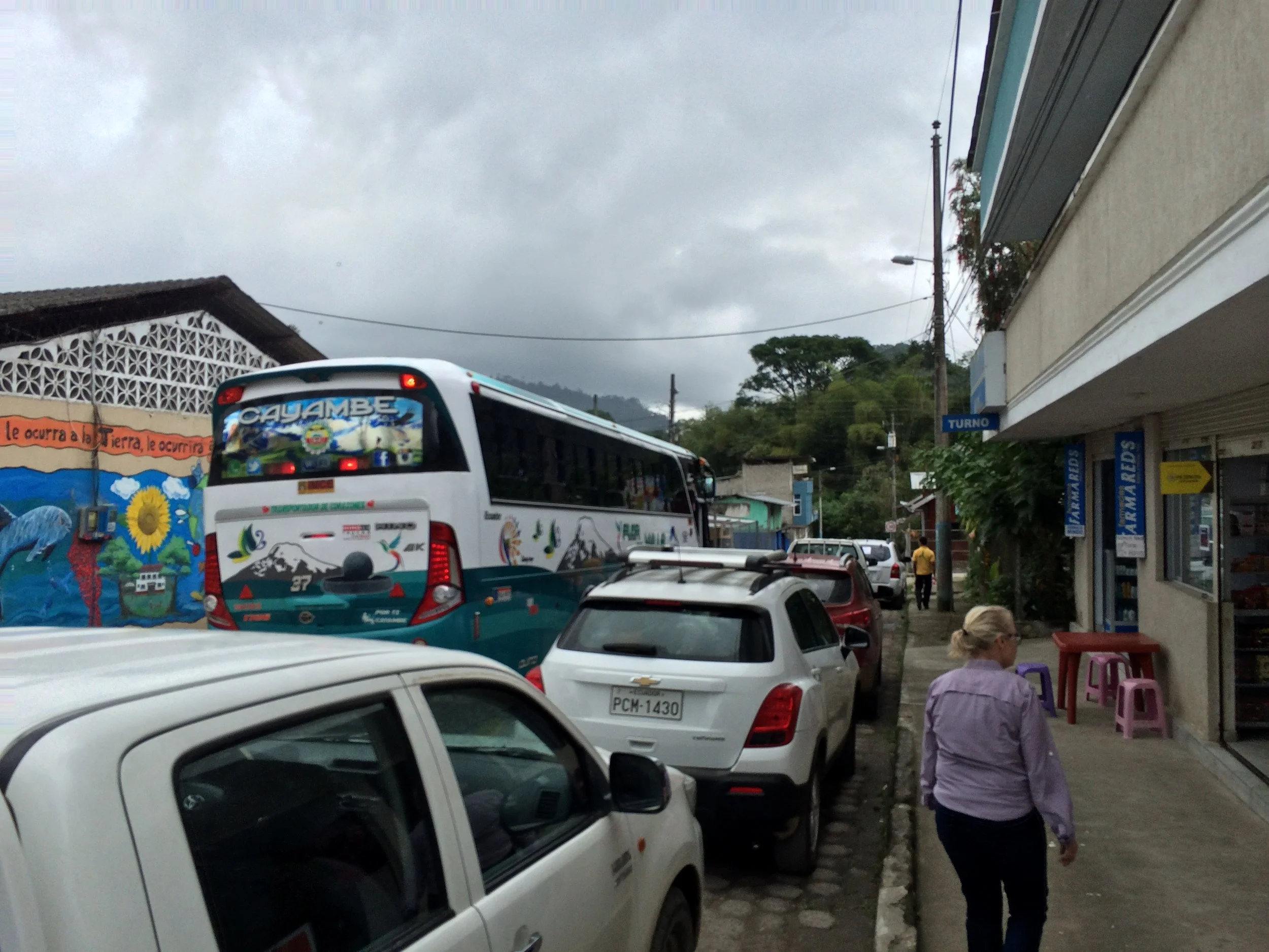We checked out of Banos the night before using a credit card for the first time (5% up charge); we wanted to preserve our cash. Having cash, and especially smaller bills is always an issue. We left early in the morning, walked to the bus station; We like to leave early because there is little traffic when wheeling the bags. We paid a little more to get an express bus; no roadside stops but direct to Cuenca. Between the constant stops, food peddlers and excess exhaust, we are fed up with Ecuador buses and wanted an easy 4 hour trip. However, after about 2 hours the main road was closed and the driver had to back up and try different roads through small farm towns. But as would be expected we ran into a dead end. Our driver was skilled; he turned our large bus around by Y-turn in the tiny front yards of 2 peasant home. He didn’t kill one chicken or dog, but he sure entertained the neighbors who stopped their chores to watch. We actually clapped when he was done.